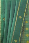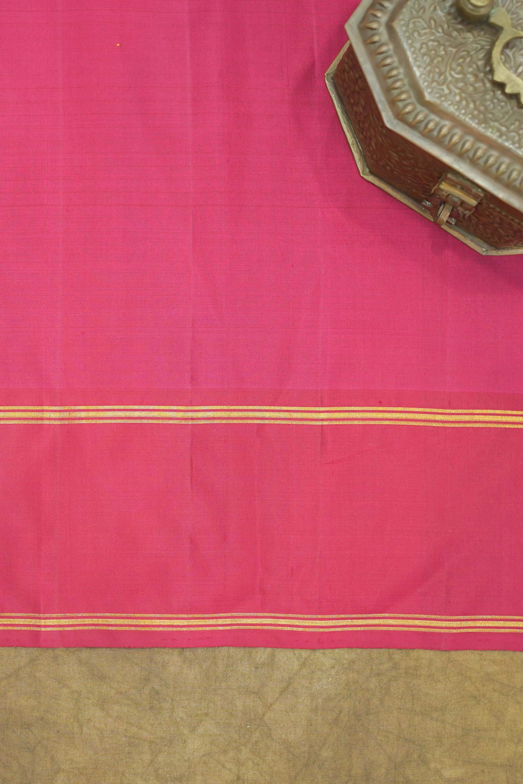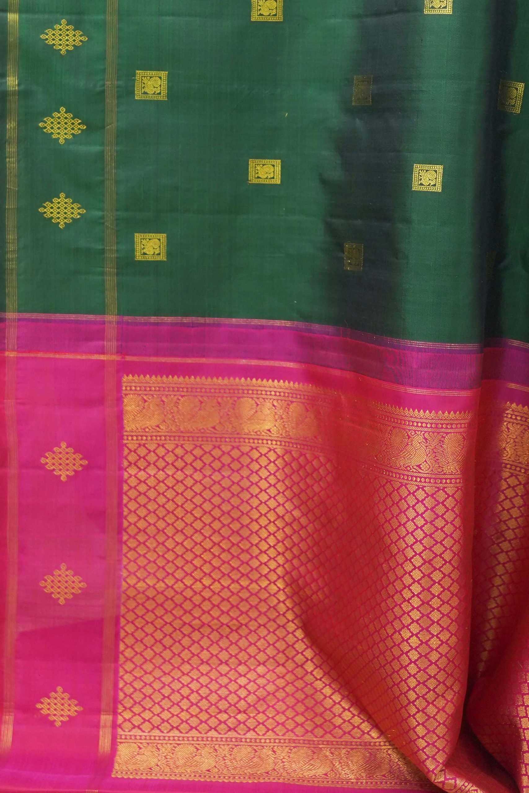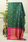 Our exquisite green Kanjeevaram silk saree is designed with big peacock motif all across the body in golden zari . The pallu is adorned with intricate zari work, adding a unique and charming touch. The reddish pink coloured palla adds a striking contrast to the very look of the saree.