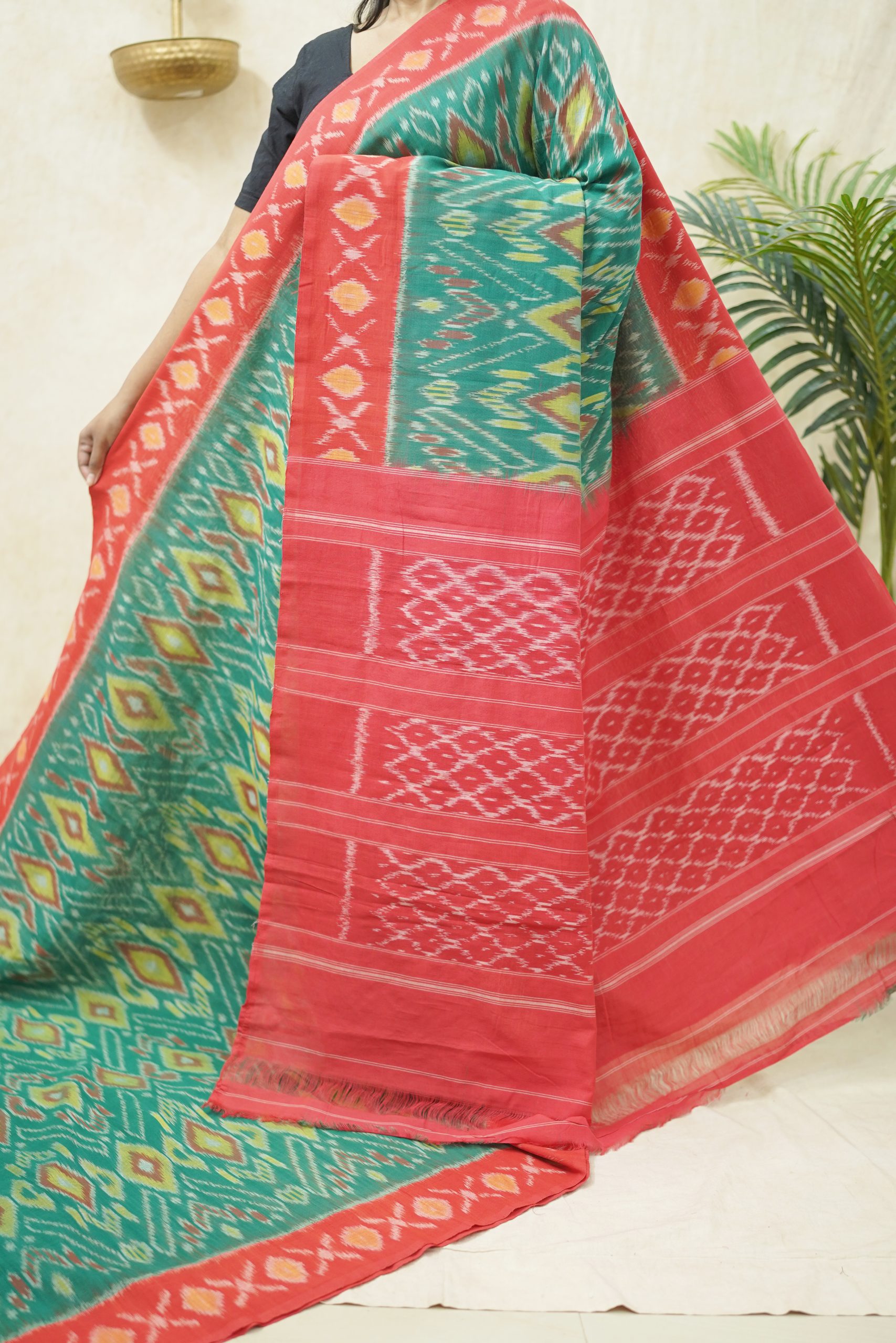 Step into the spotlight with our exquisite handwoven cotton pochampally saree featuring a stunning green body creating a bold and lively appearance that exudes confidence and charm. The highlight of this saree is the contrasting red border with ikkat motifs which add a touch of traditonal sophistication