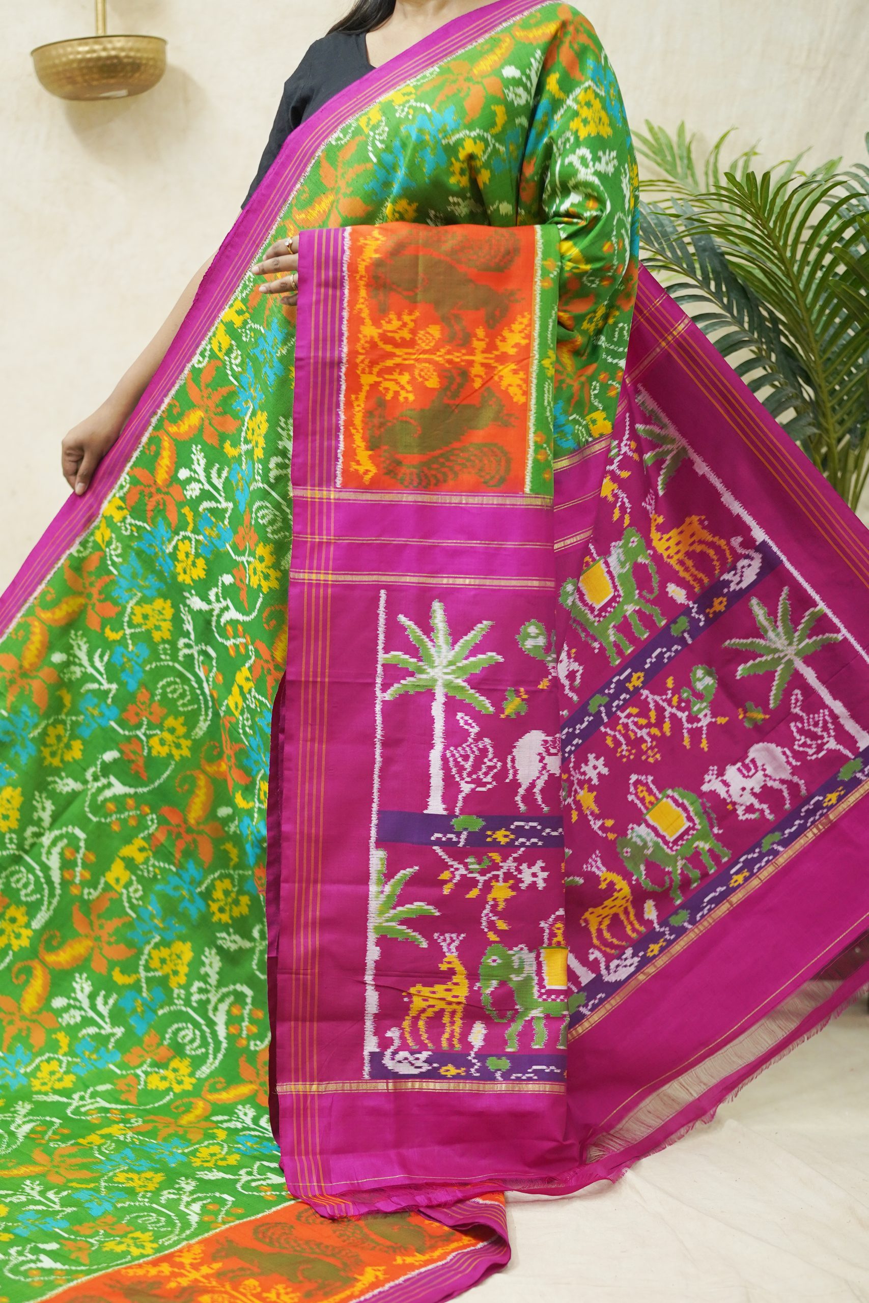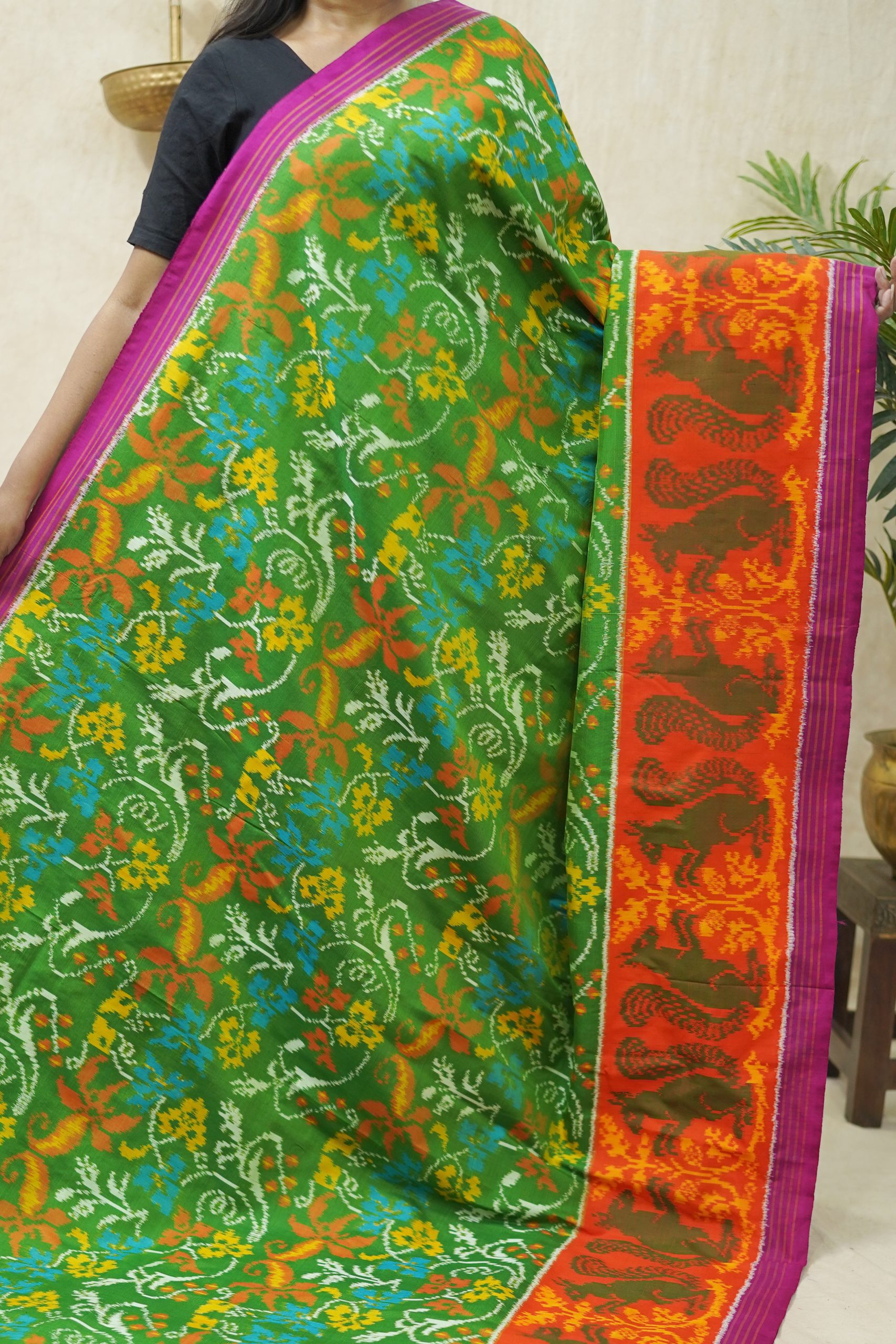 Add a touch of elegance to your ethnic wardrobe with our green handwoven silk Pochampally saree, featuring traditional ikkat inspired floral motifs on the body. The highlight of this saree is the striking pink border with yellow stripes that add a regal charm. Perfect for any occasion, it beautifully blends tradition with modern grace.