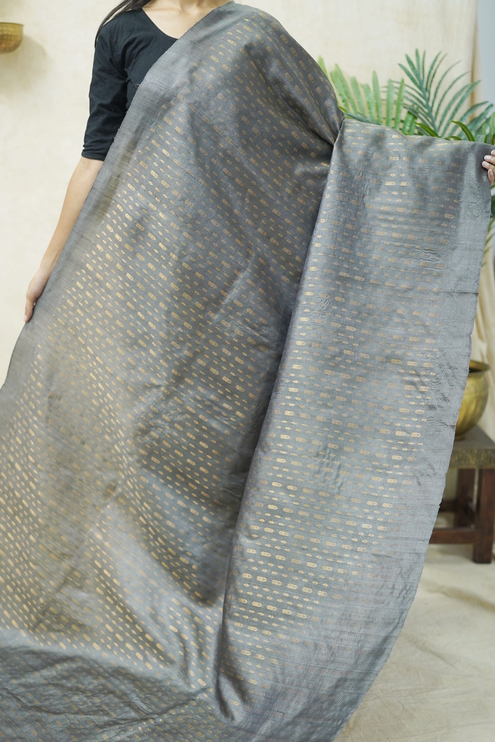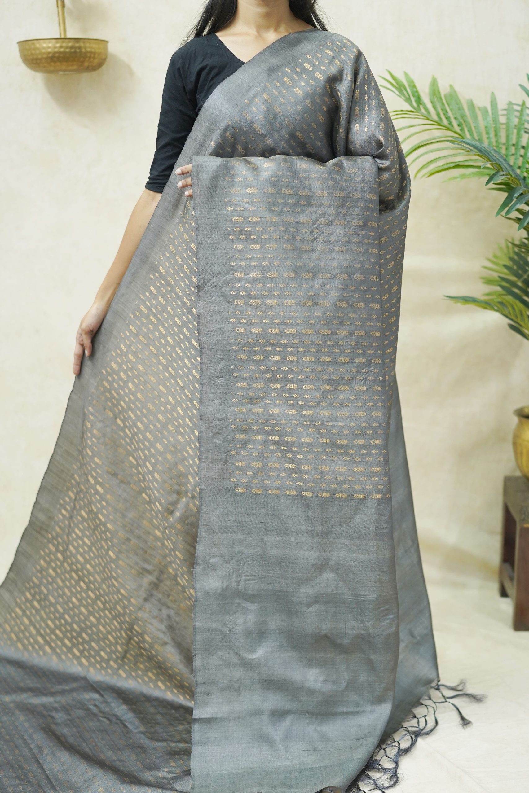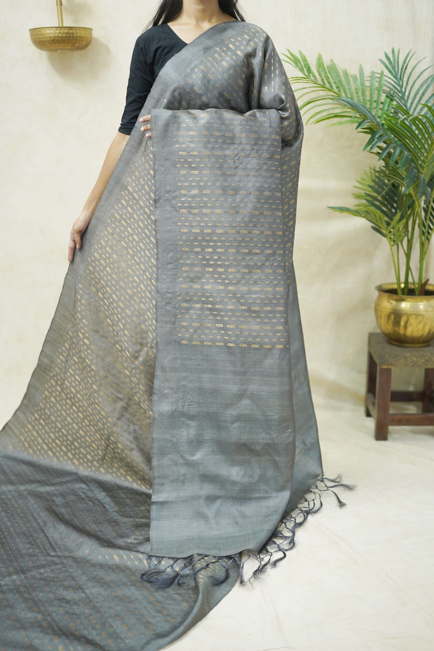 Immerse yourself in the regal charm of our grey handwoven Kosa silk saree from Chhattisgarh, adorned with a shimmering golden zari work across the body. Renowned for its natural sheen and refined elegance, this saree is a true reflection of Chhattisgarh’s rich weaving heritage. Perfect for special occasions, it embodies timeless sophistication and the unmatched artistry of traditional craftsmanship.