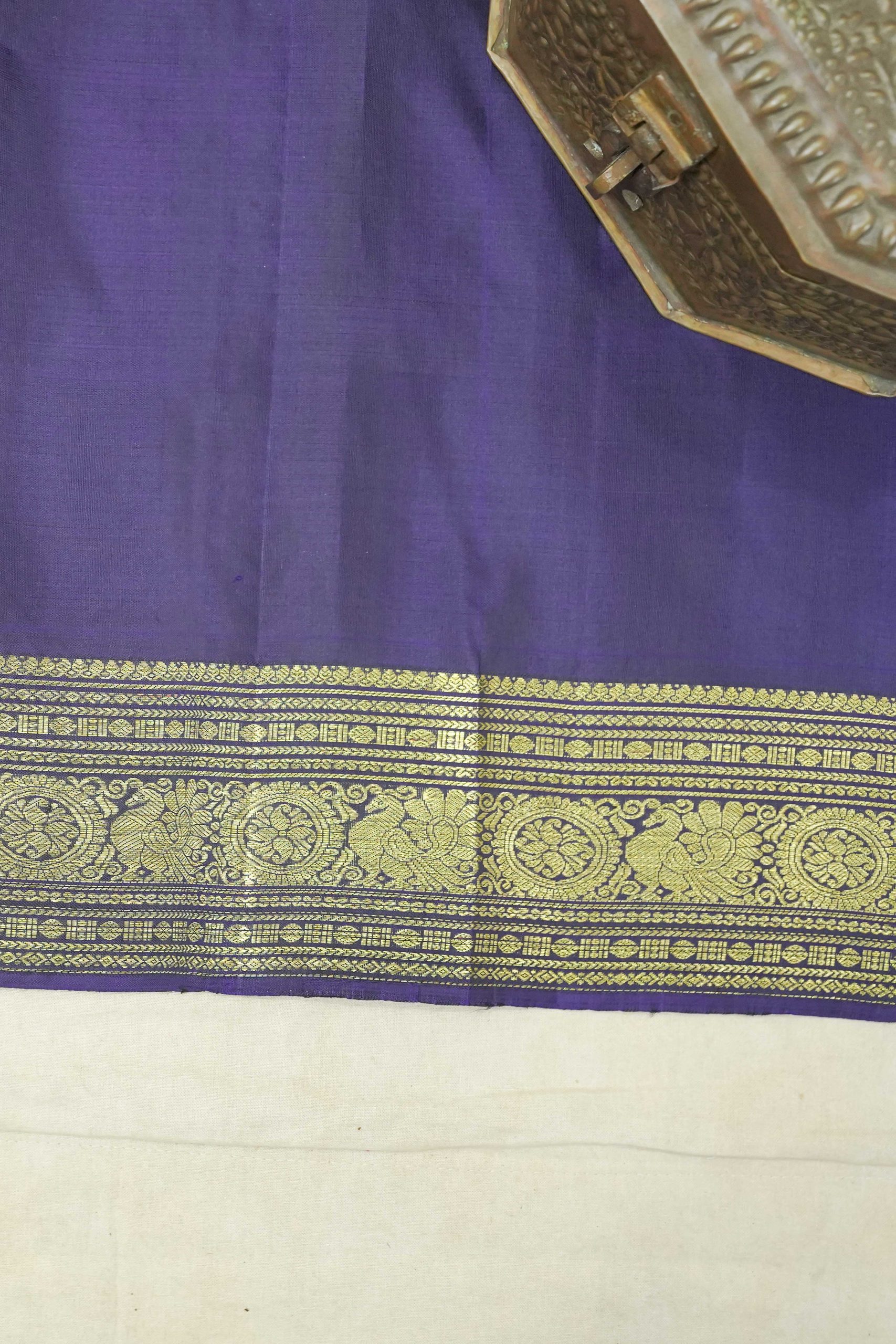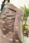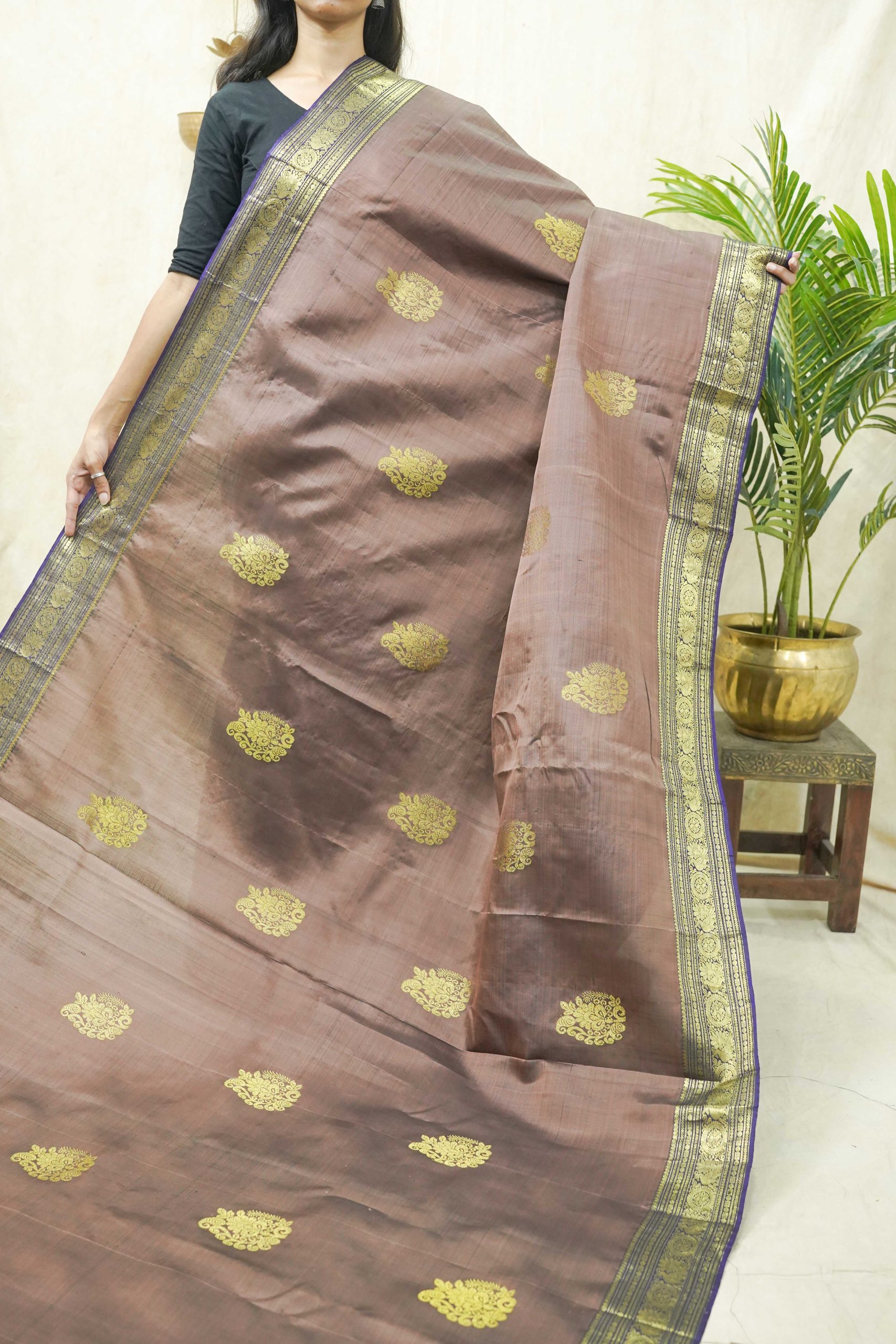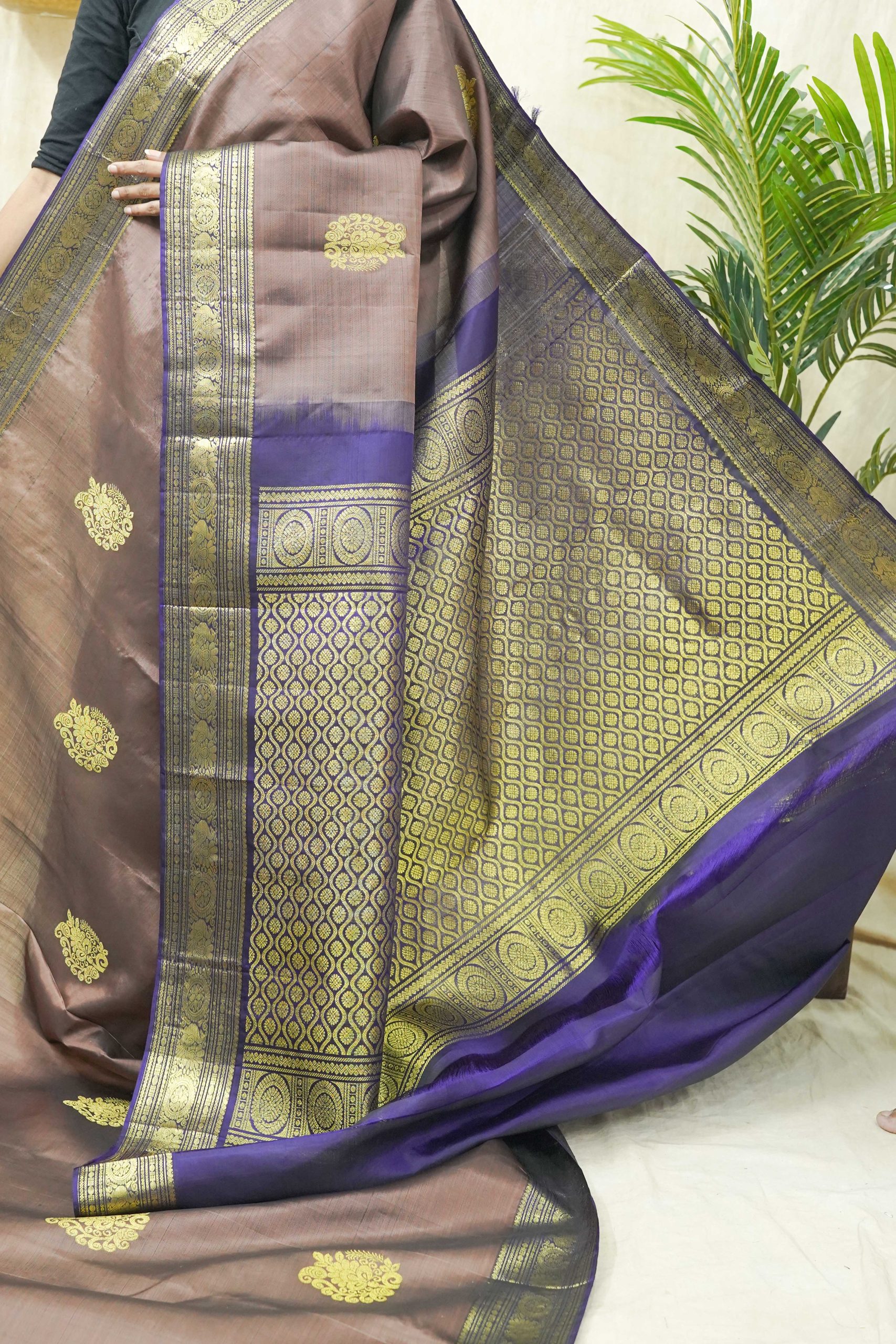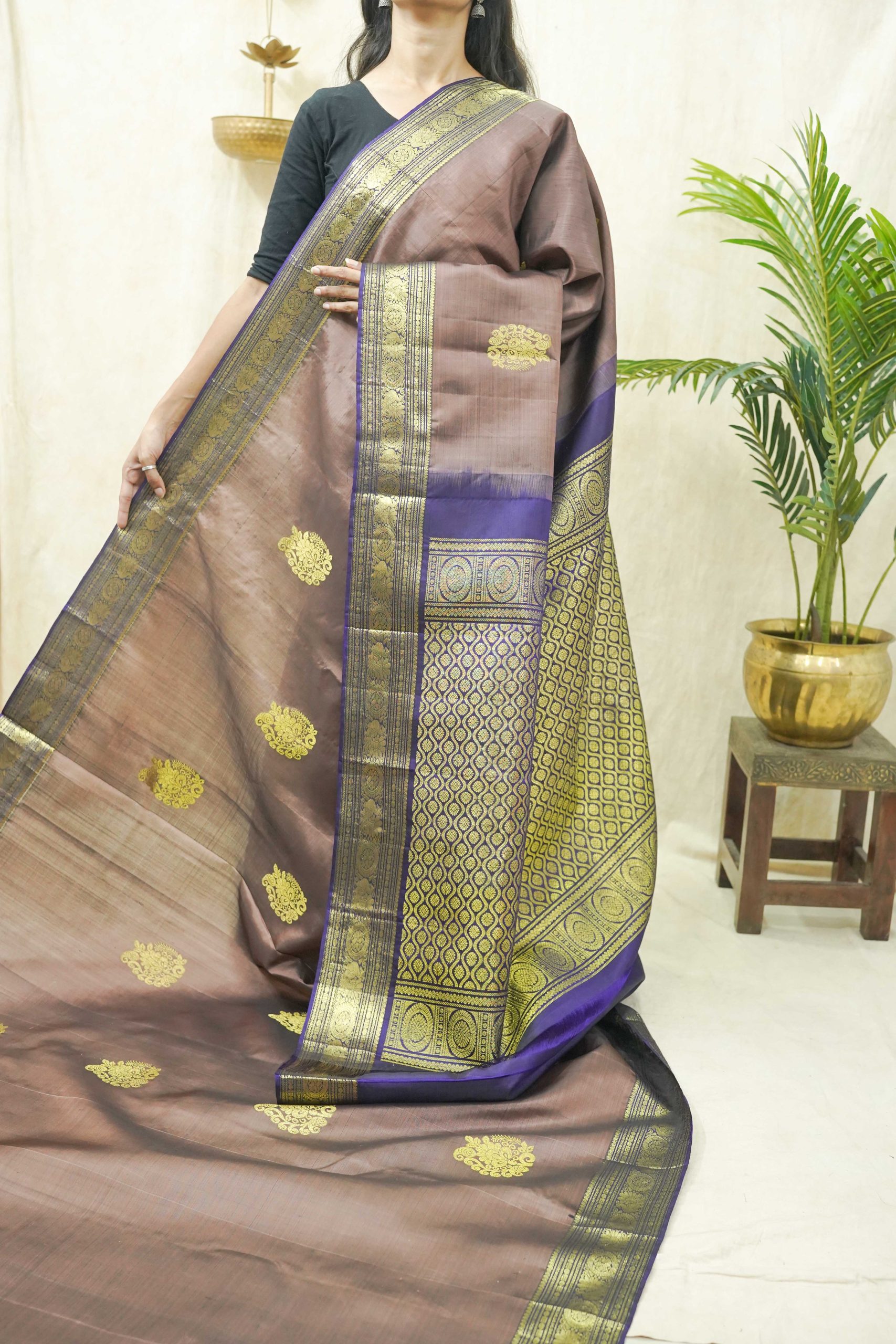 This Kanjeevaram saree features a stunning greyish brown colour, which lends an aura of elegance. Adorning the borders of the saree is a mesmerizing golden zari work . Further enhancing the beauty of the saree are delicate motifs in golden zari, meticulously woven into the fabric.
