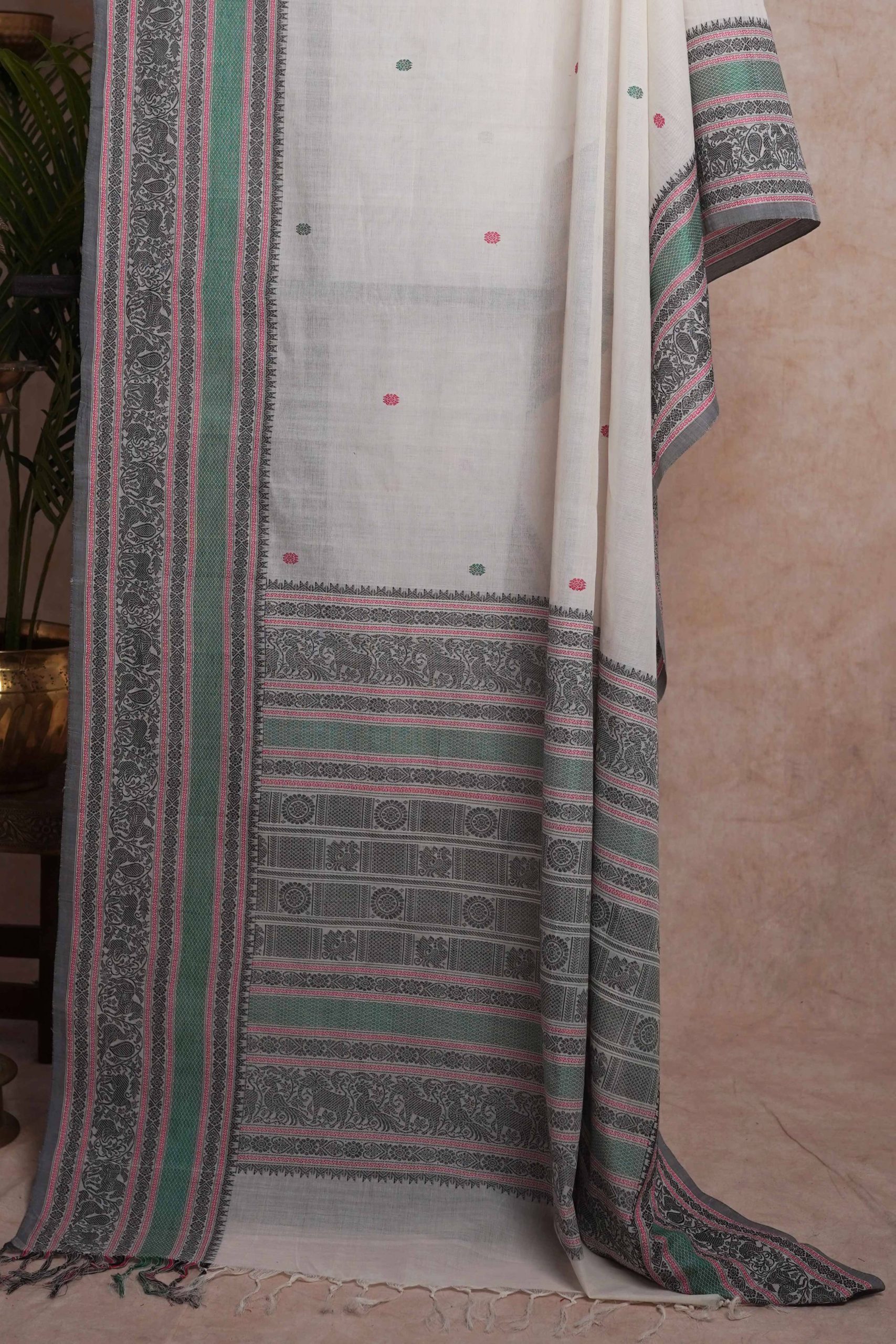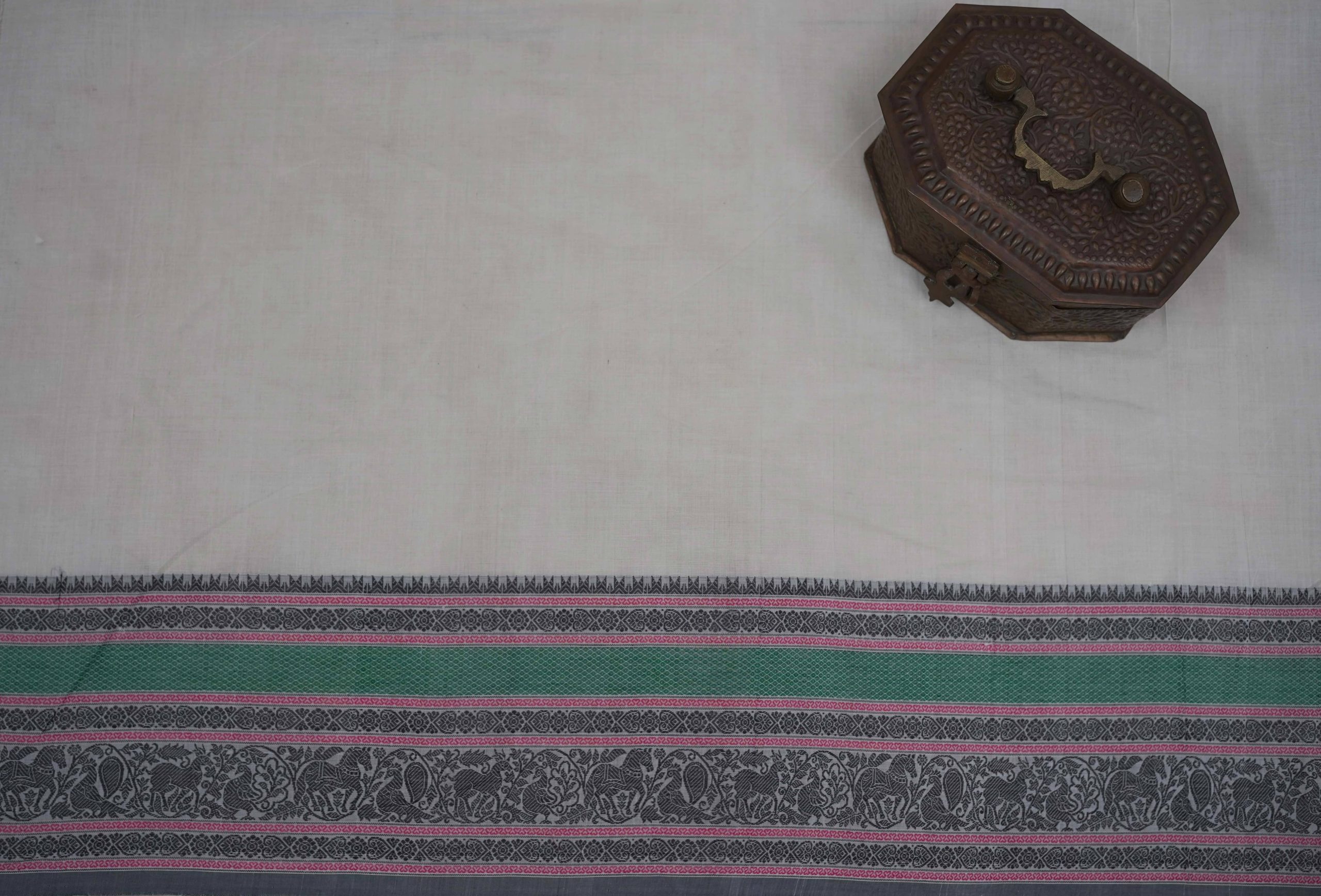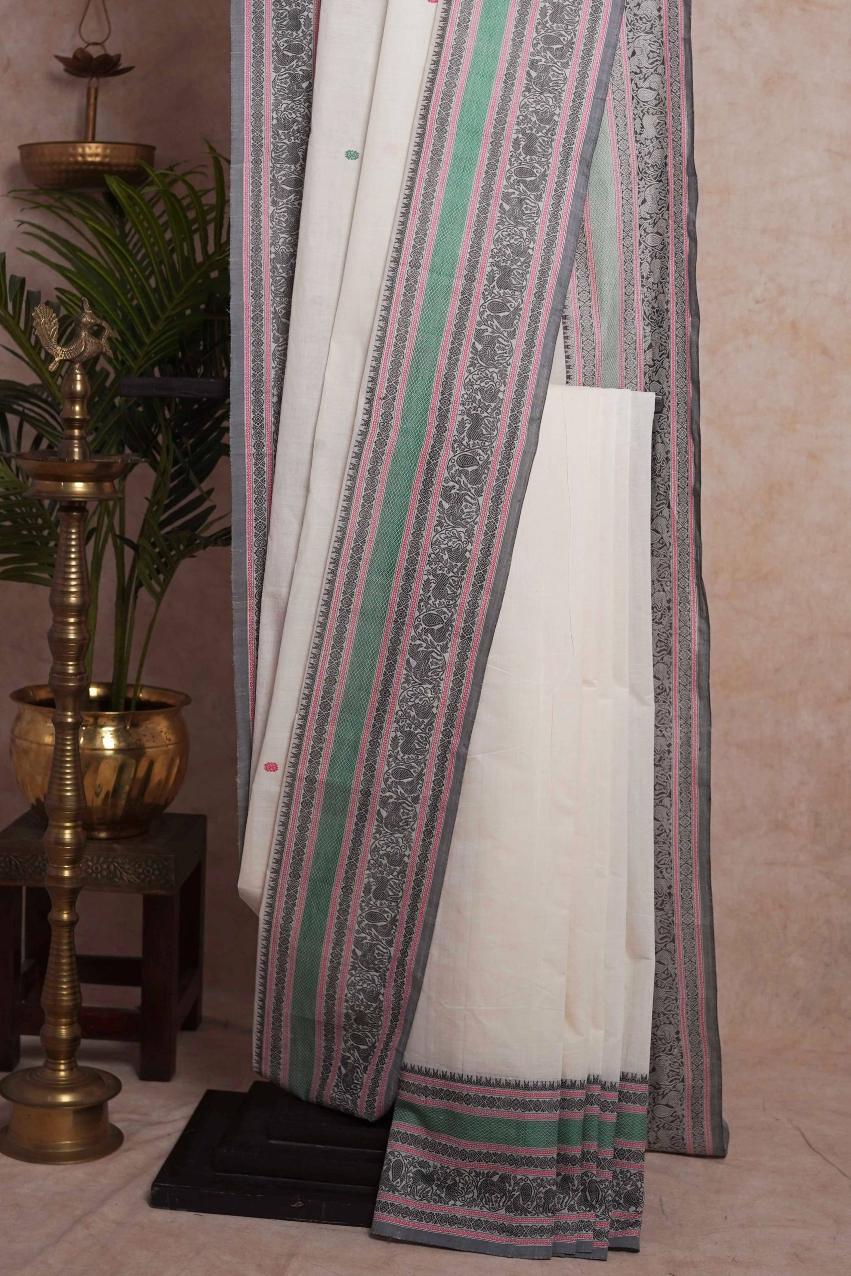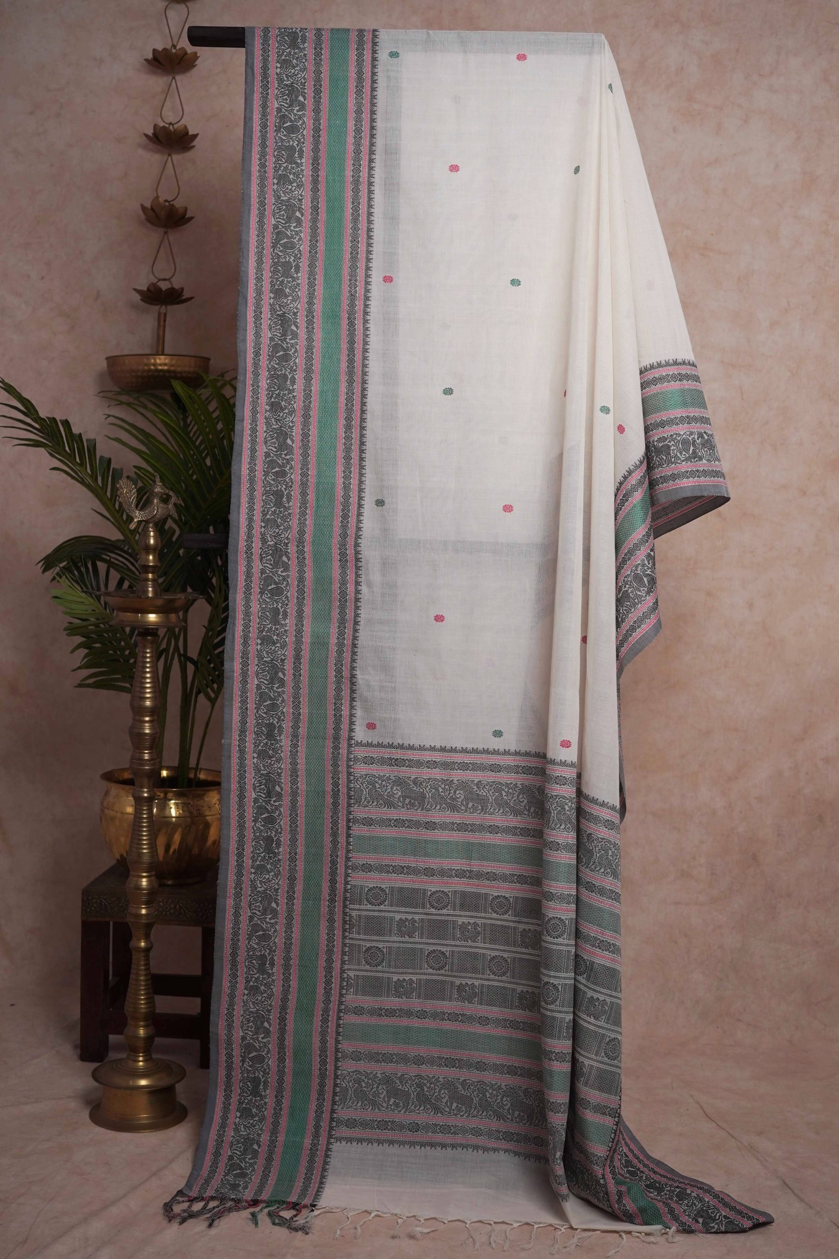 Enhance your ethnic ensemble with ourwhite Kanchipuram cotton saree, featuring intricate small buties, a striking and traditional wide border, and a sophisticated grey colour selvedge . Perfect for any special occasion, this saree combines traditional artistry with modern elegance.