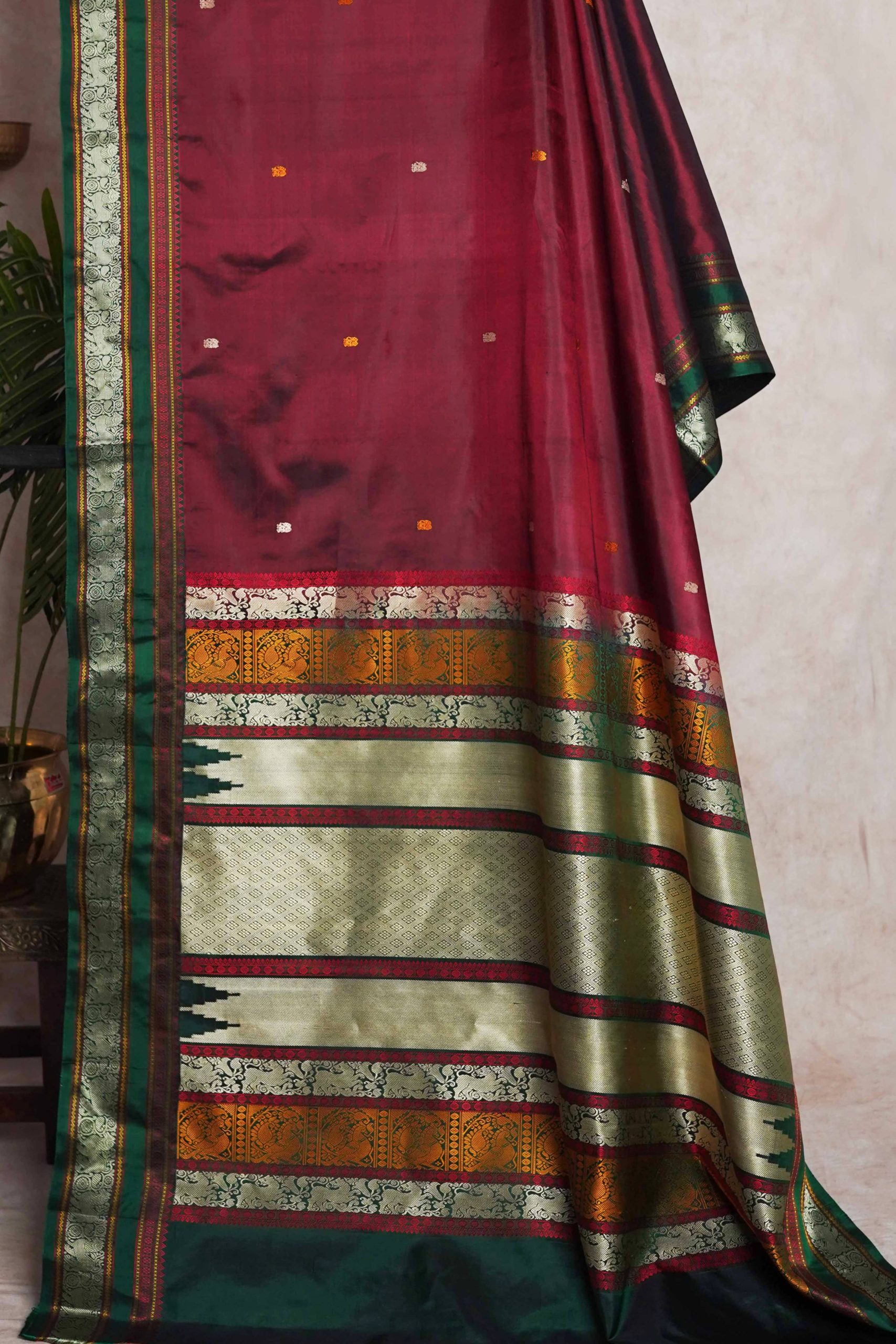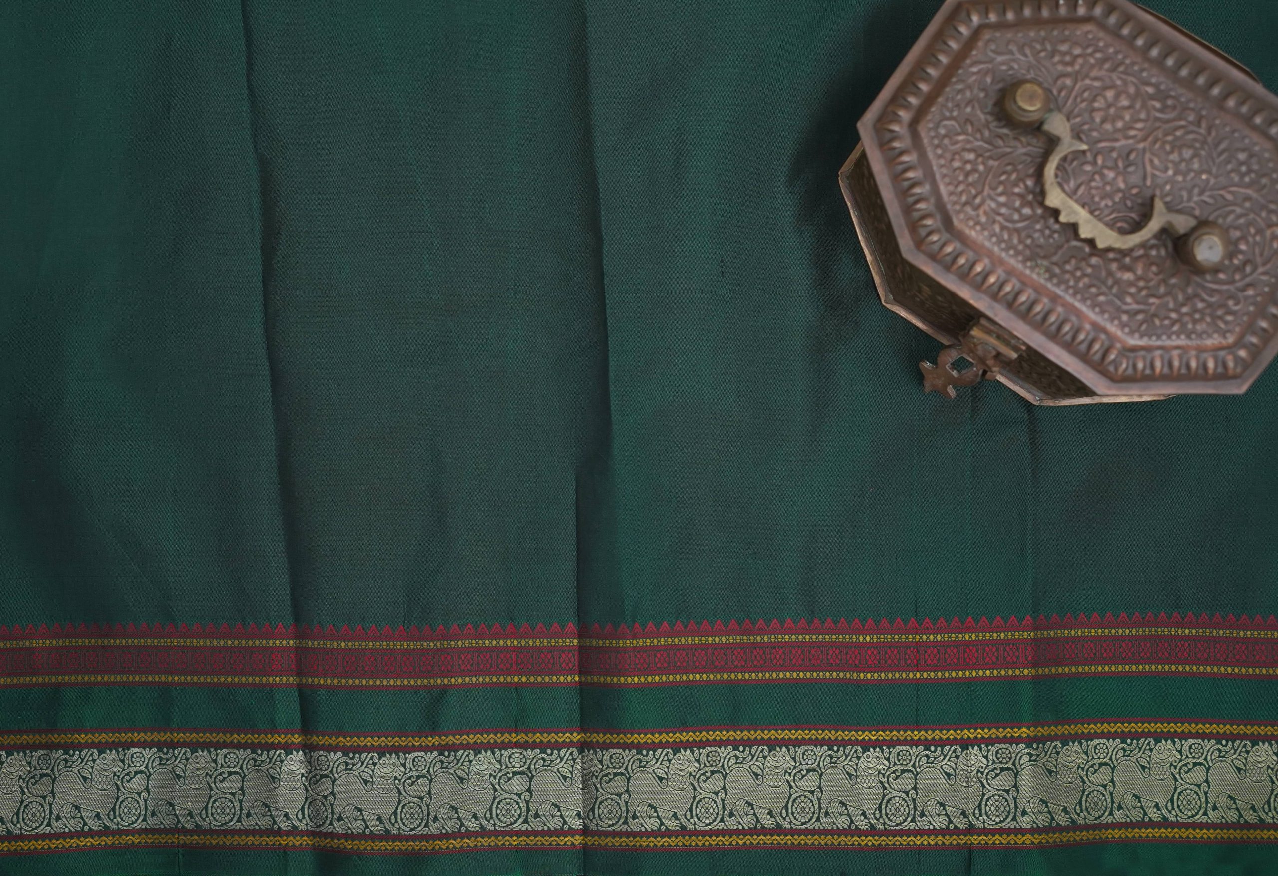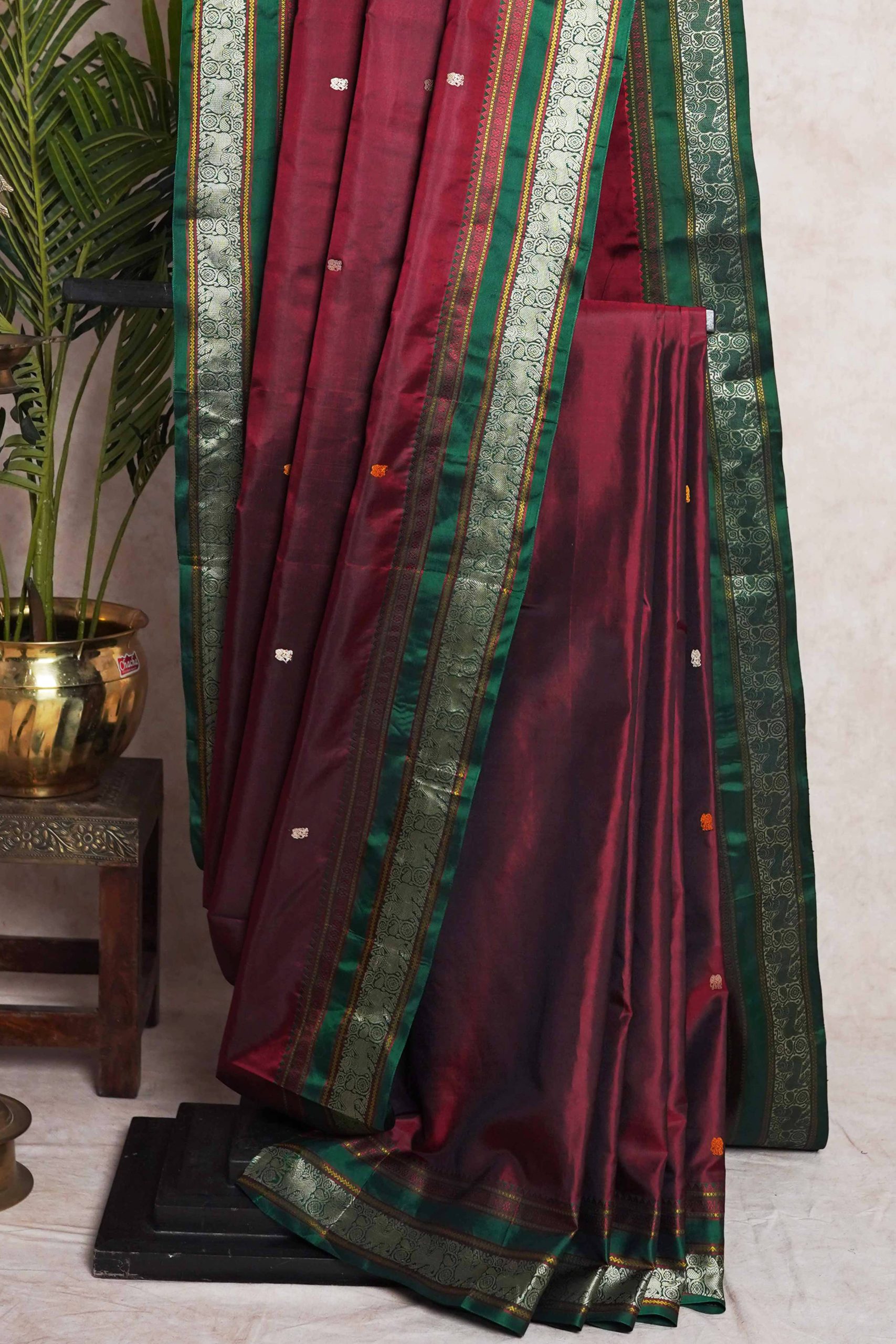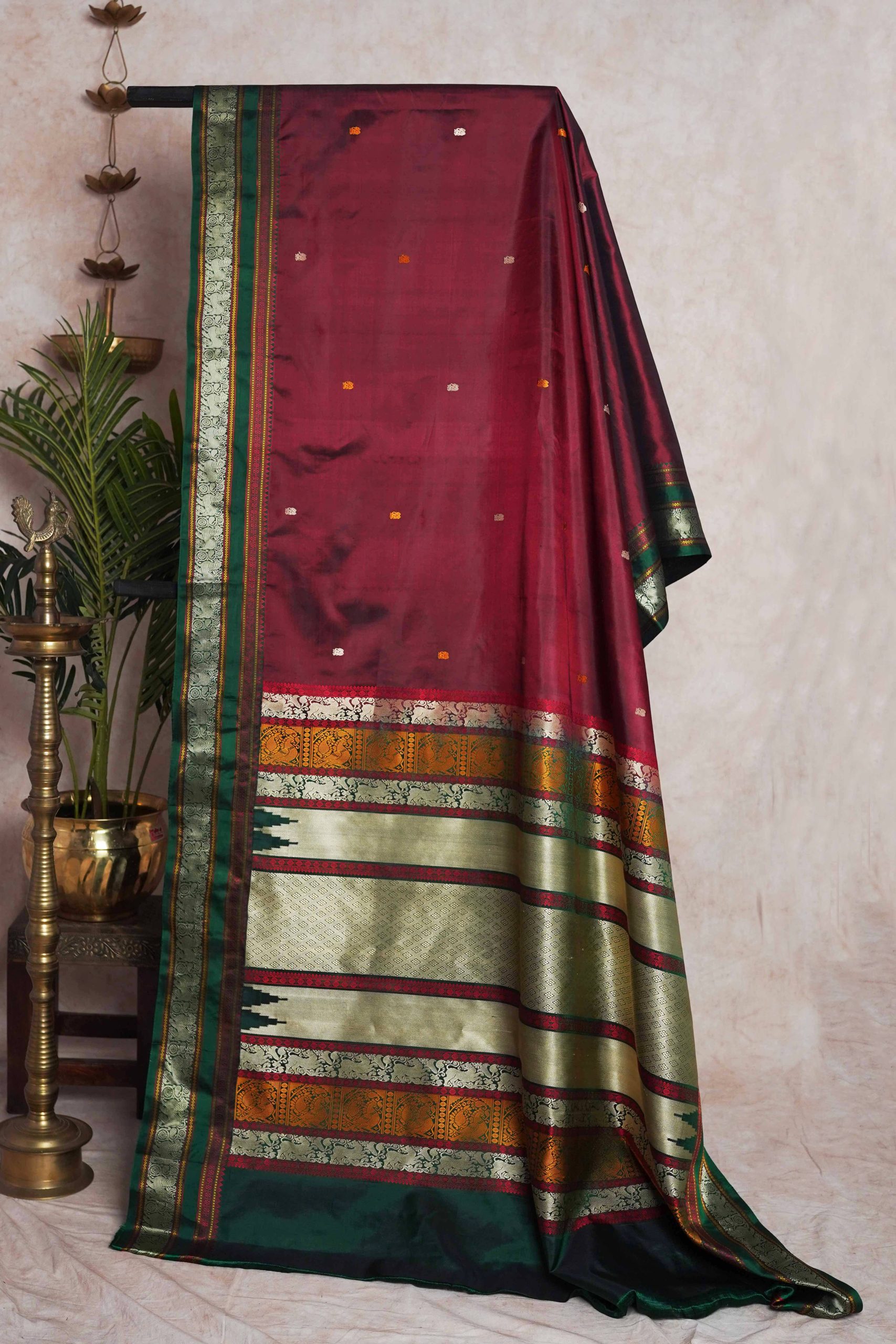 Our exquisite maroon Kanjeevaram silk saree is designed to captivate with its delicate small butis and intricate motifs. The pallu is adorned with beautiful cow motifs, adding a unique and charming touch. The green coloured animal motif border provides a rich contrast, completing the saree’s sophisticated look.