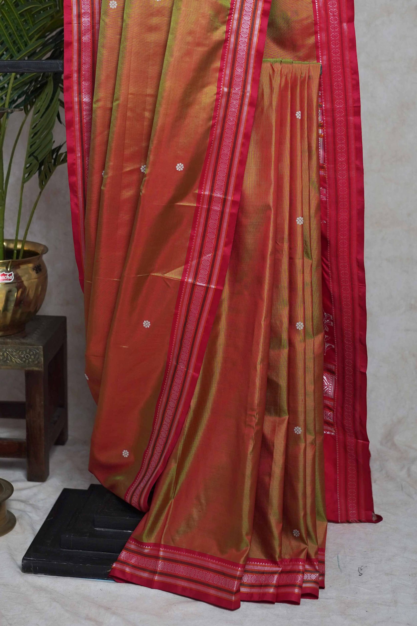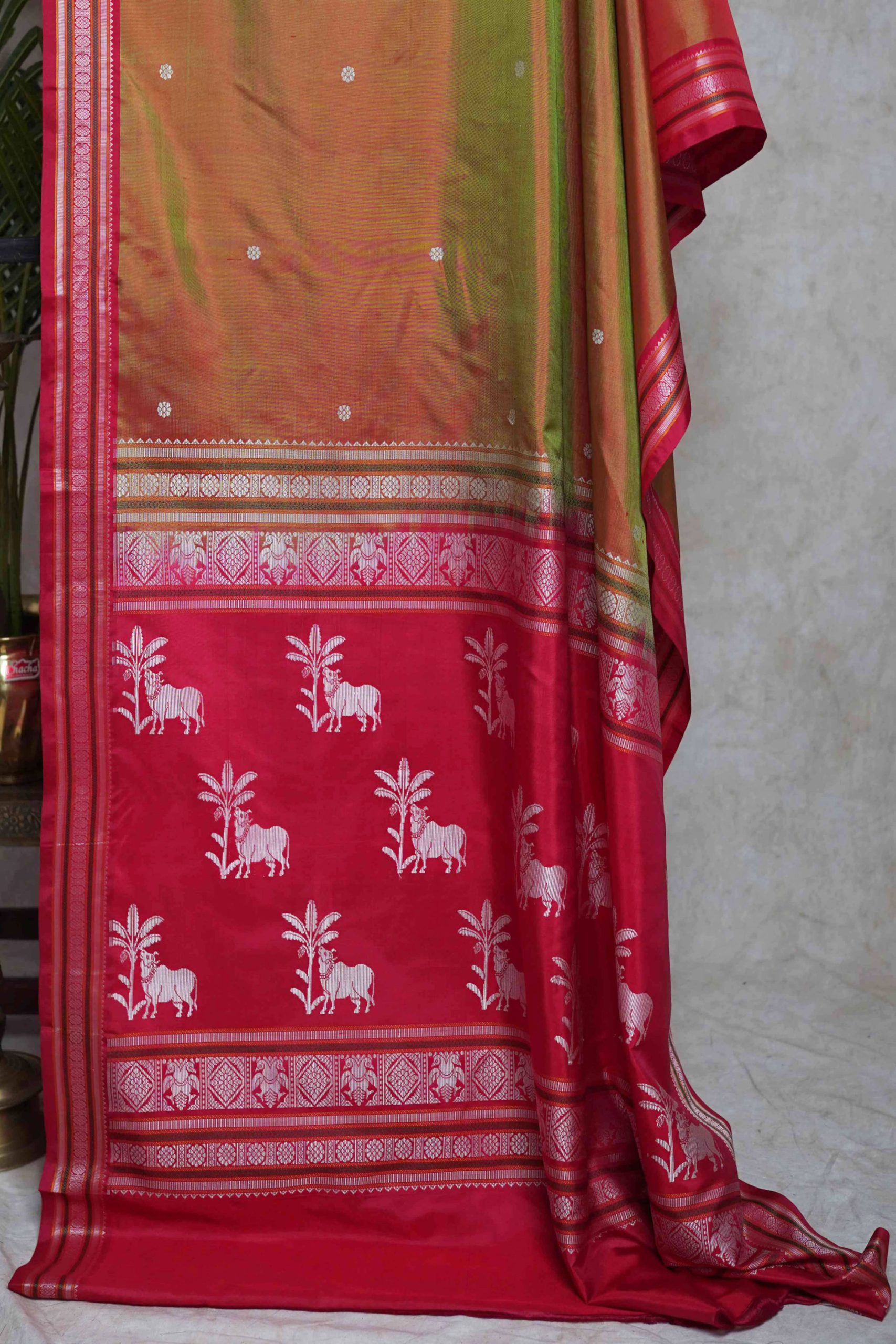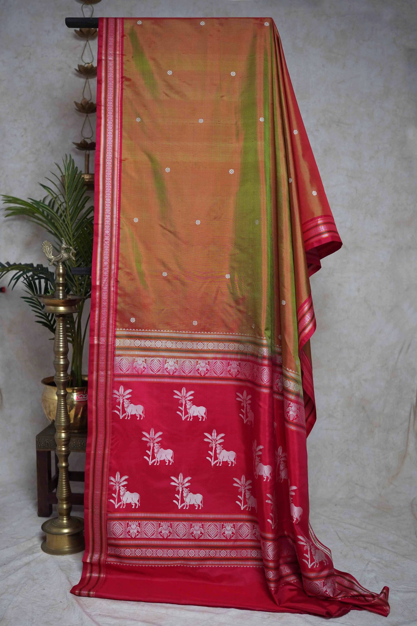 Our exquisite red green dual tone Kanjeevaram silk saree is designed to captivate with its delicate small butis and intricate motifs. The pallu is adorned with beautiful cow motifs, adding a unique and charming touch.