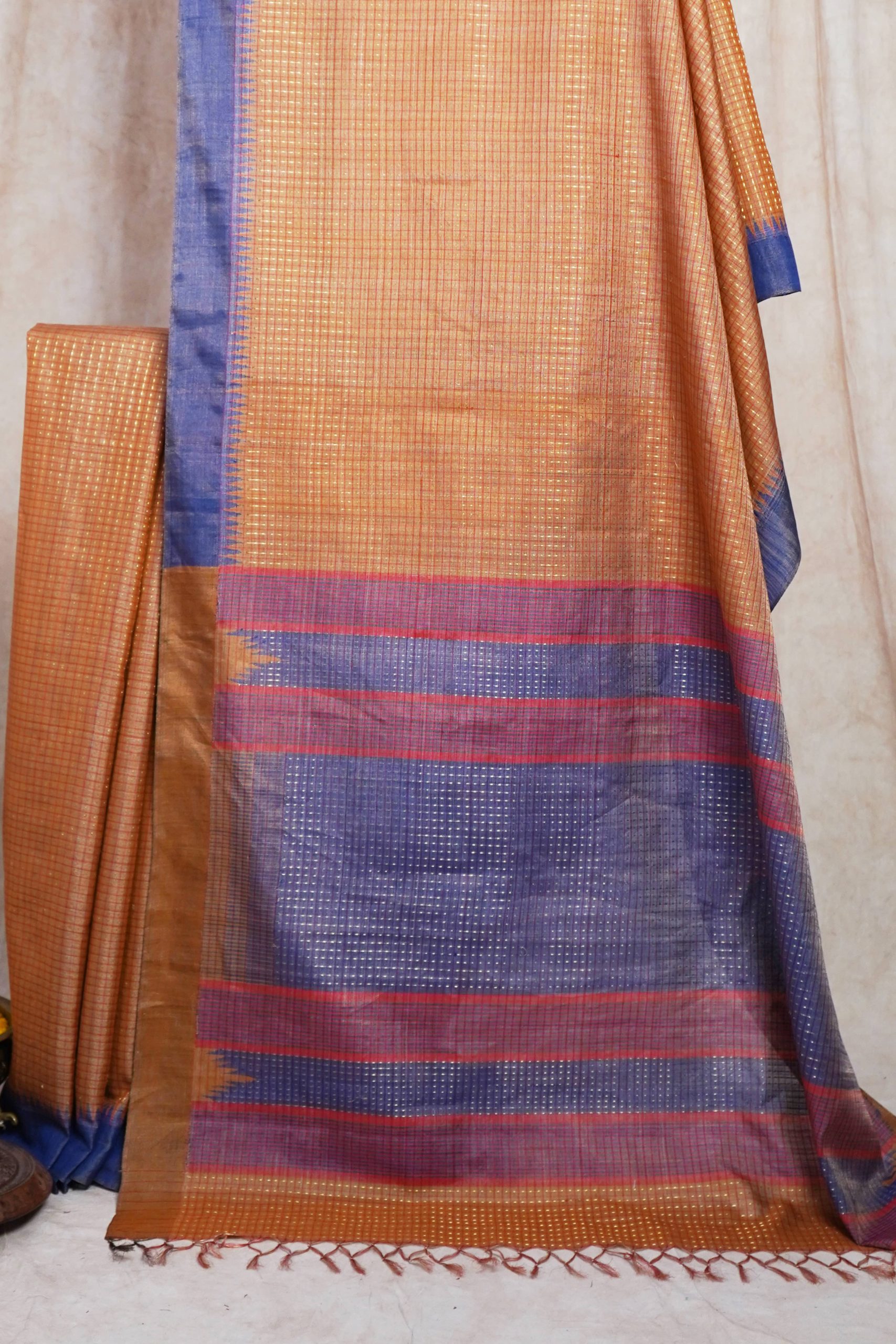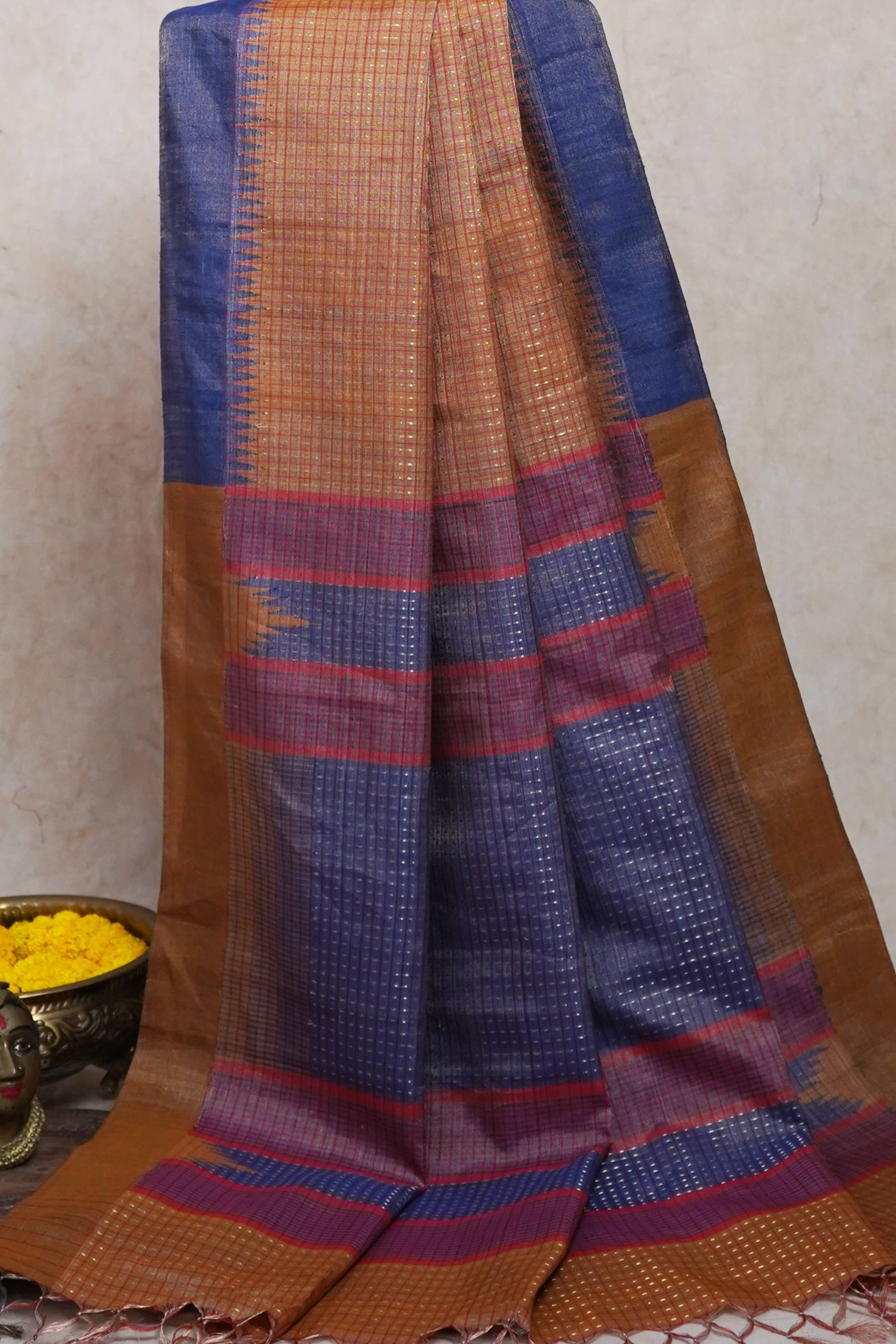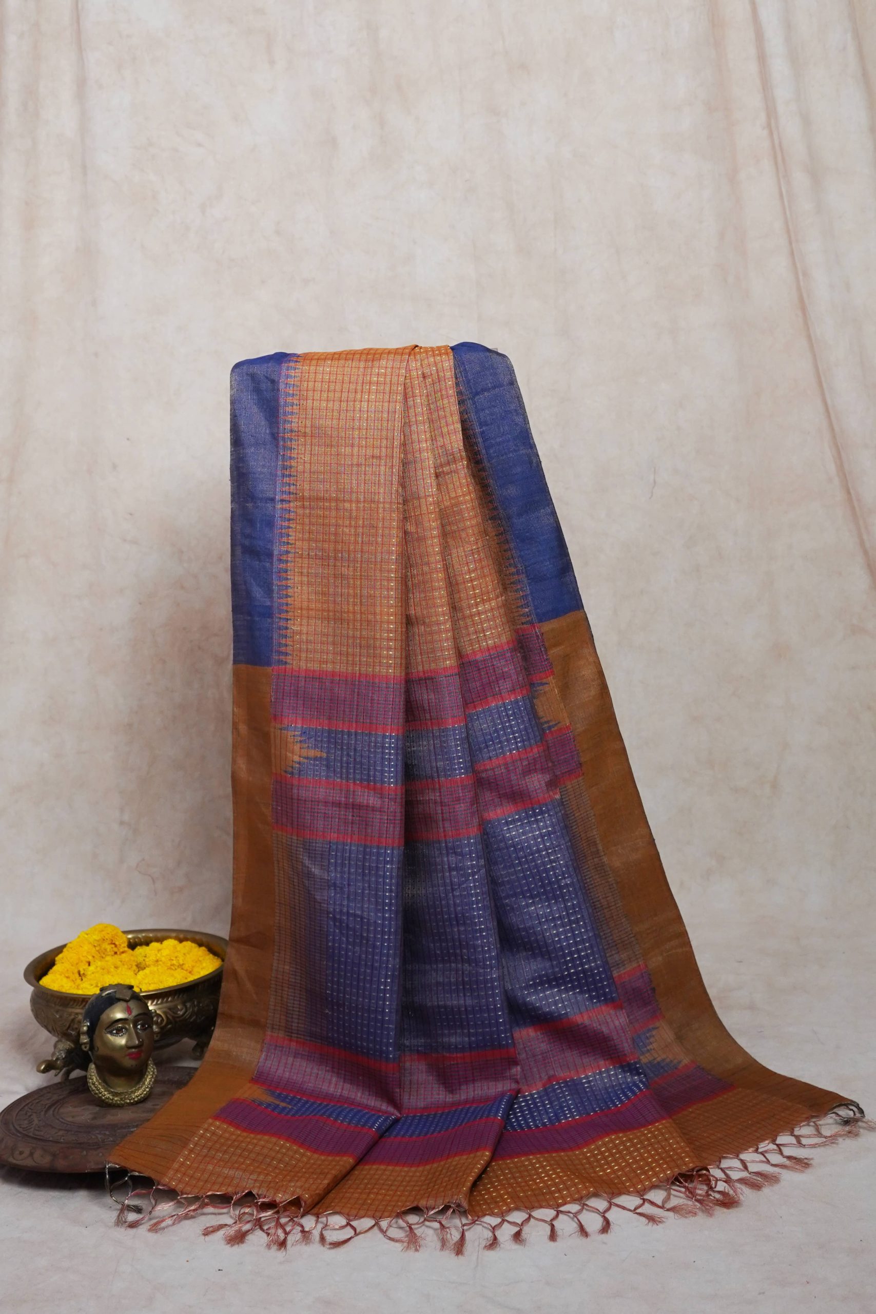 Immerse yourself in the regal charm of our yellow handwoven Kosa silk saree from Chhattisgarh, adorned with a shimmering golden zari work across the body. Renowned for its natural sheen and refined elegance, this saree is a true reflection of Chhattisgarh’s rich weaving heritage. Perfect for special occasions, it embodies timeless sophistication and the unmatched artistry of traditional craftsmanship.