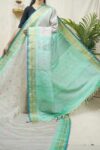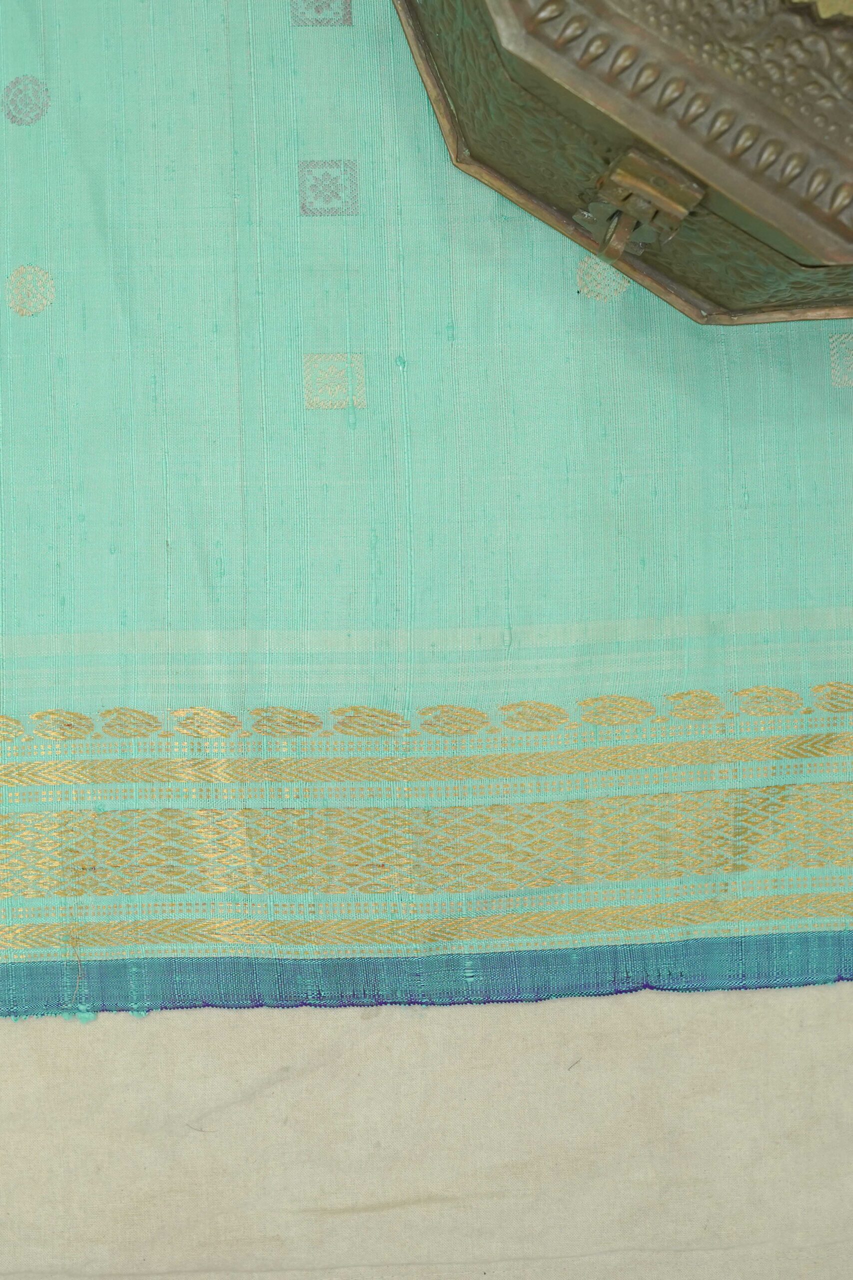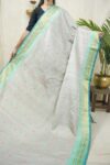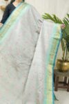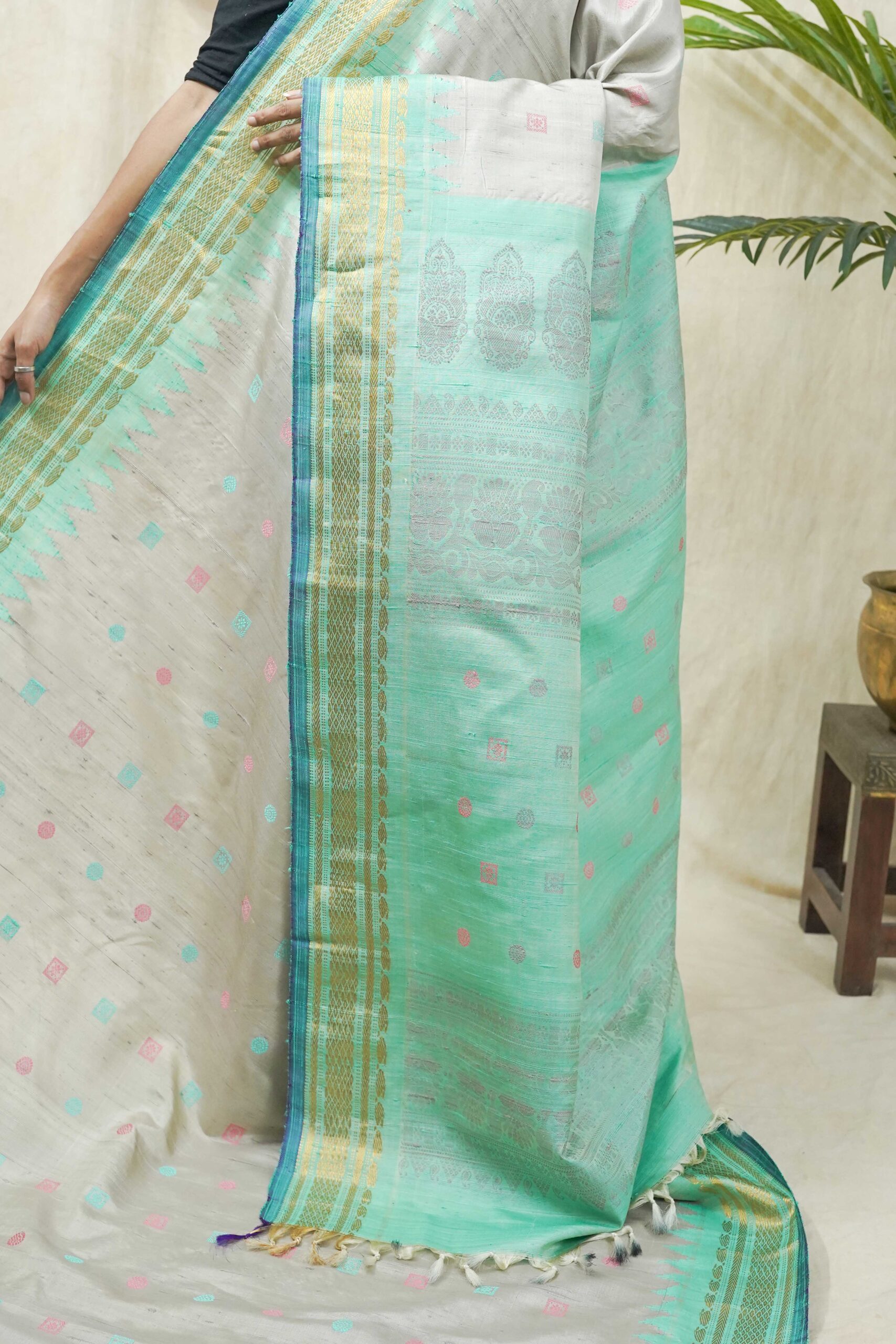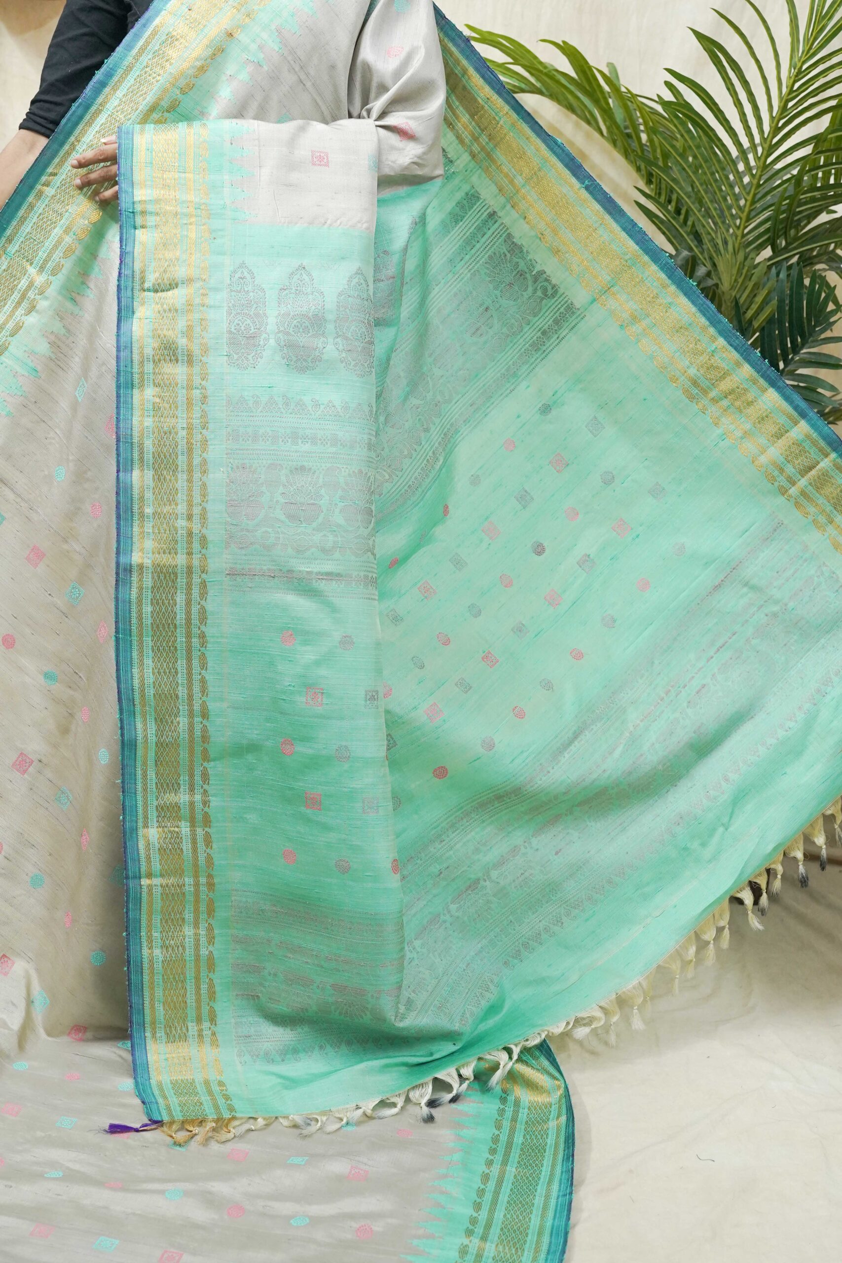 Indulge in the timeless beauty of light grey colour silk Gadwal saree, a graceful blend of tradition and elegance. Handwoven with raw silk, it features delicate buttas in all across the body,enhanced by a vibrant sea green border. Perfect for weddings, festive occasions, and cultural celebrations.