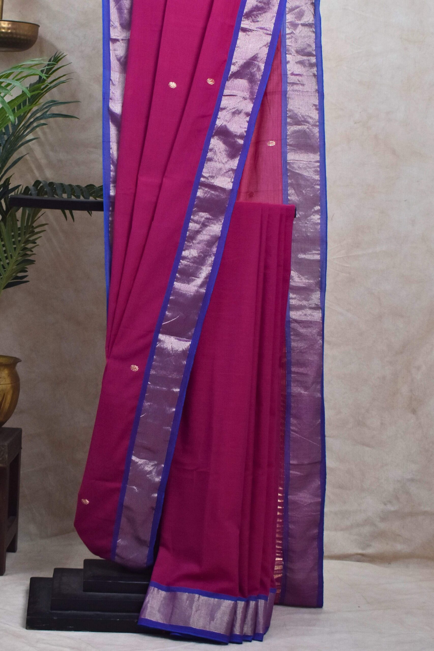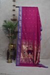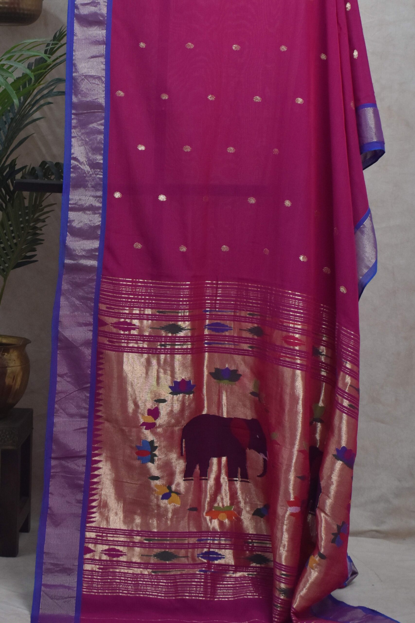 A timeless ode to Maratha heritage,this Paithani cotton saree in the shade of magenta is a masterpiece of centuries-old craftsmanship, adorned with lustrous weaves and intricate motifs in golden zari inspired by nature and royalty. Originating from the royal dynasties of the Satavahana era, each drape carries the grandeur of tradition, the richness of colour, and an elegance passed down through generations.