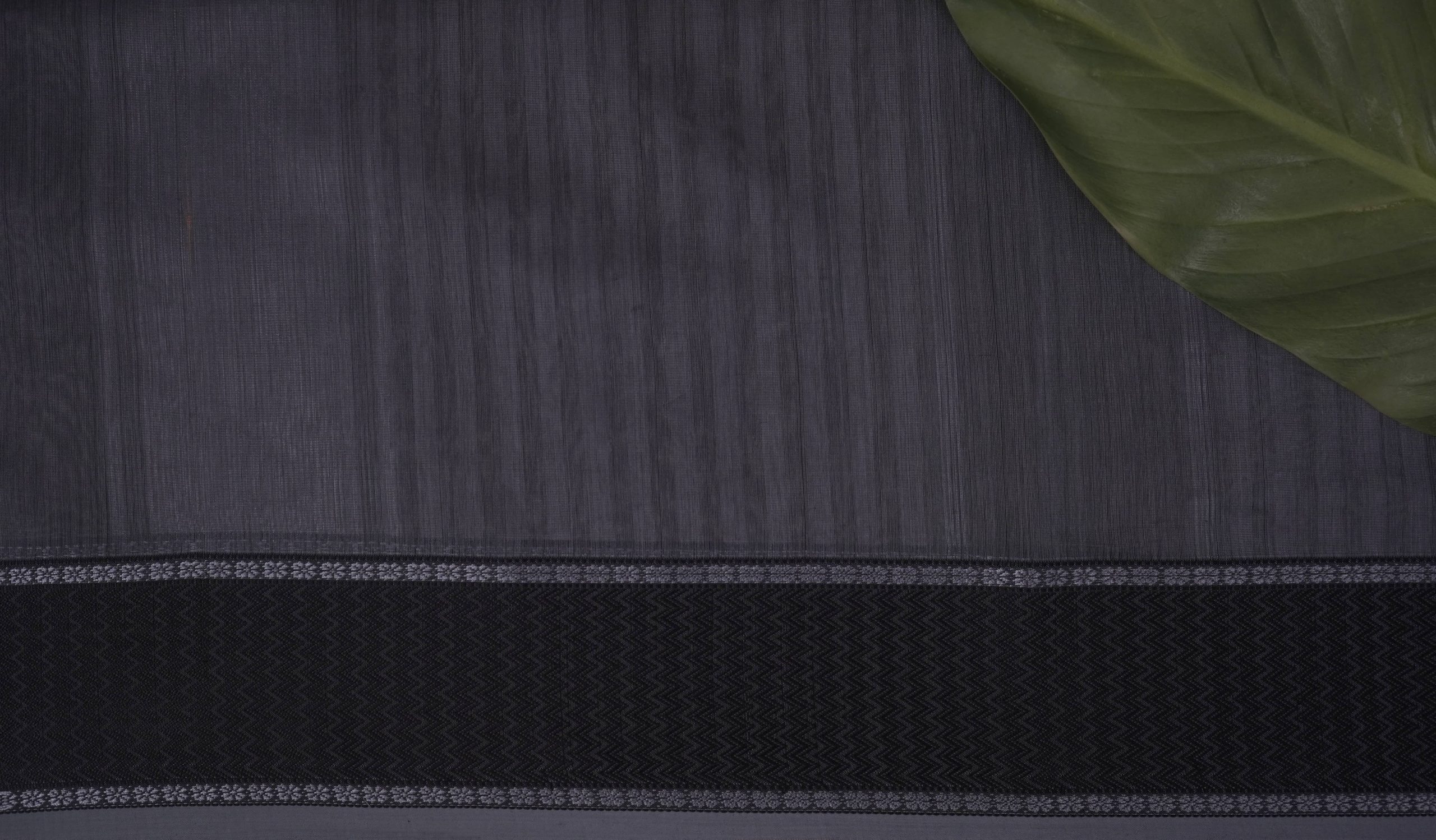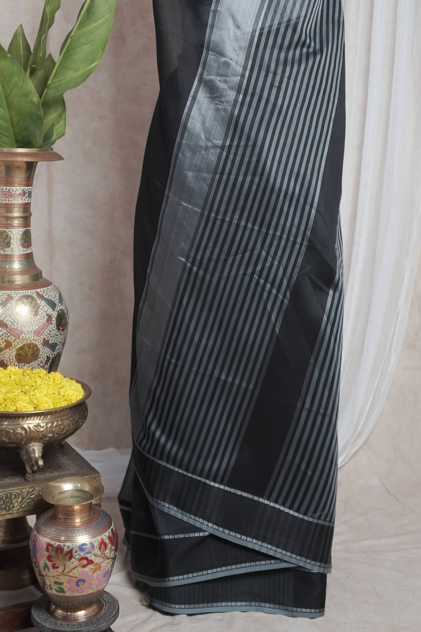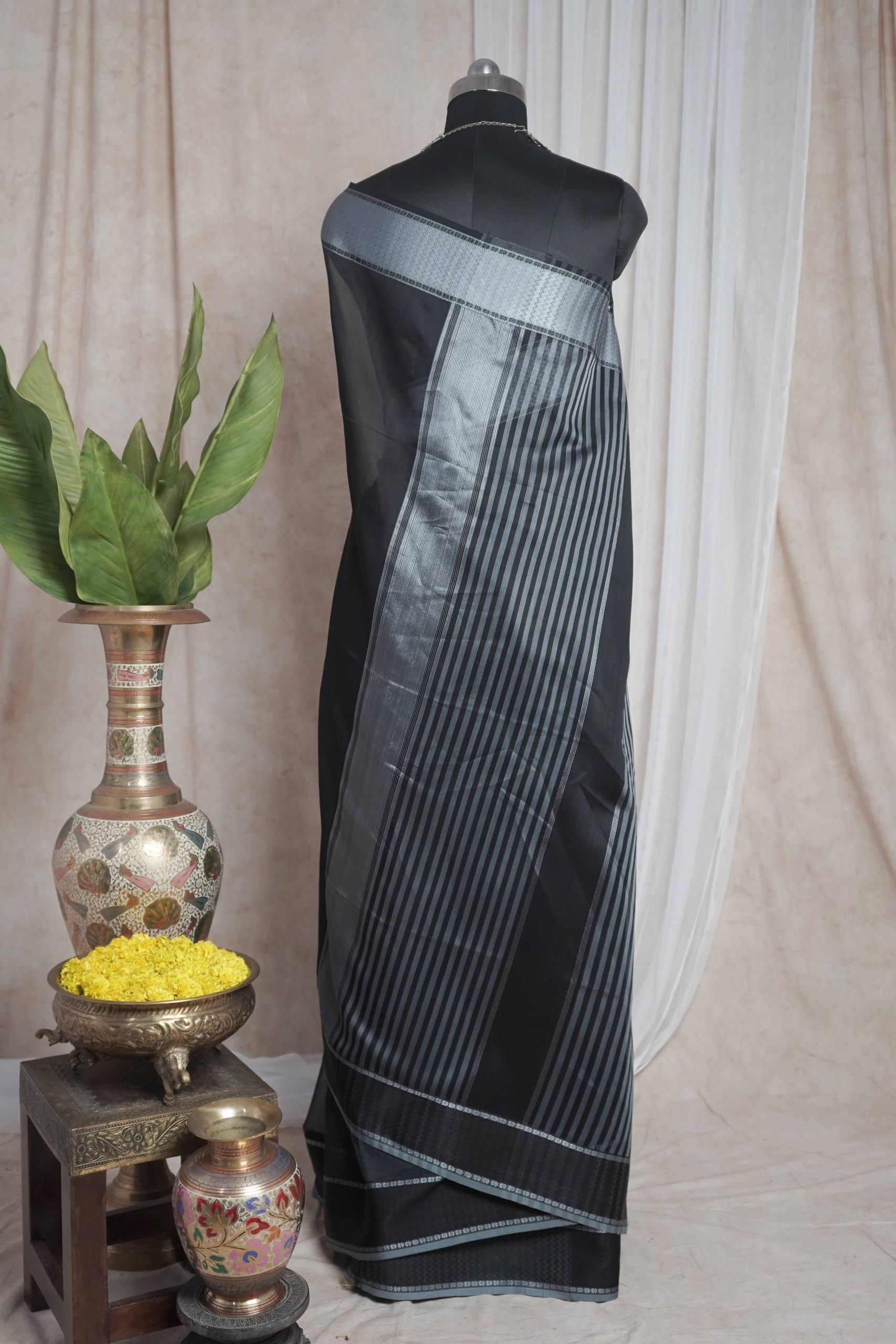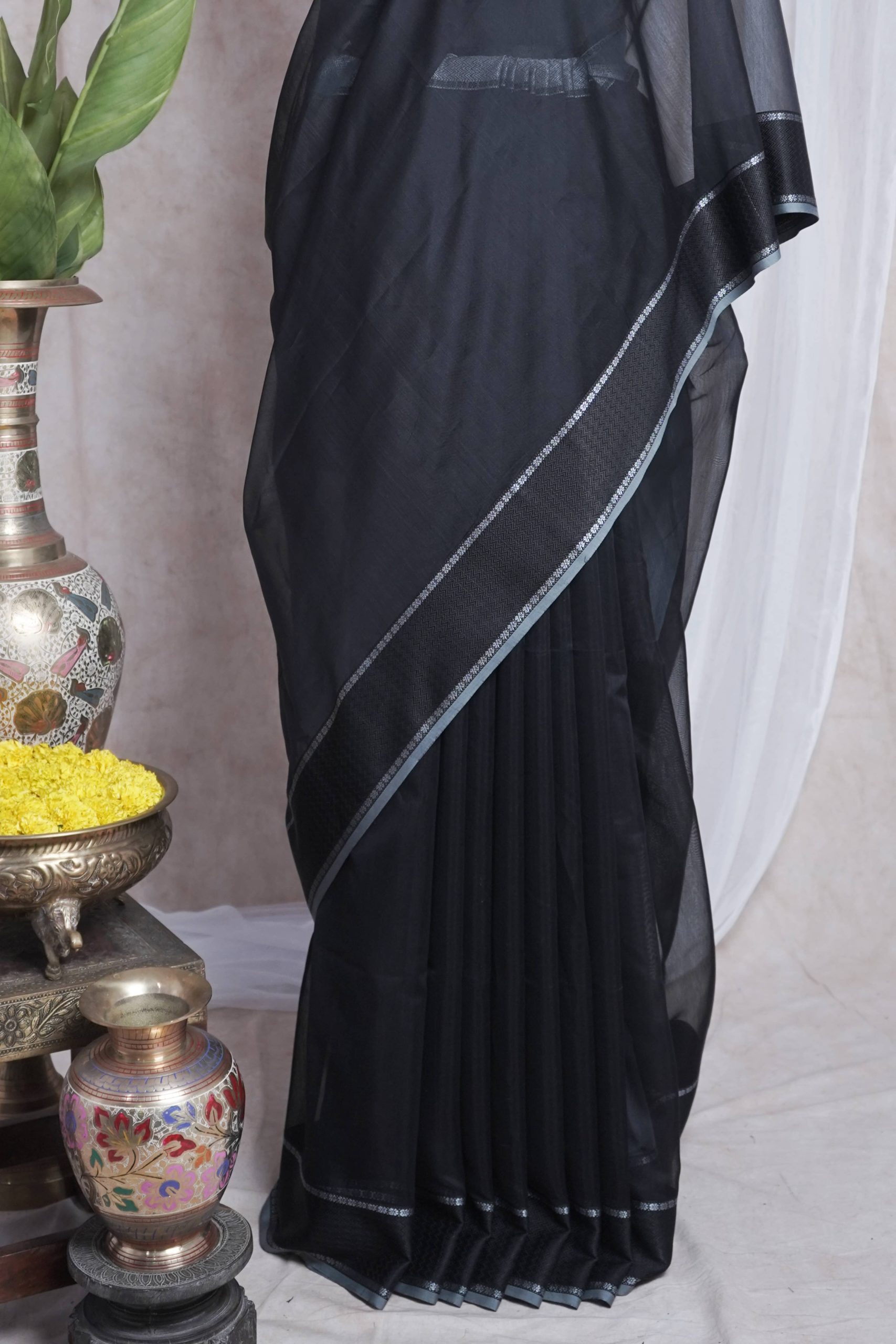 Elevate your ethnic wardrobe with our vibrant black Maheshwari sico saree, featuring a classic Narmada border in black thread , and a striking stripped palla in contrasting grey colour. The contrasting grey colour selvedge gives a unique edge to the very look of the saree. This saree blends traditional artistry with modern elegance, perfect for any special occasion