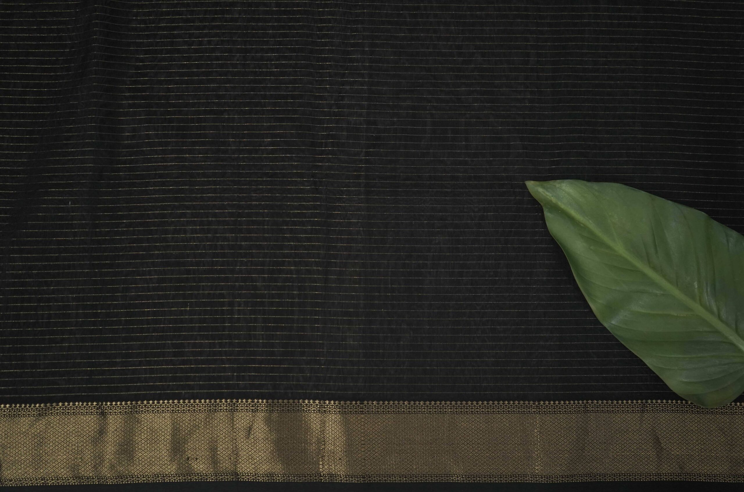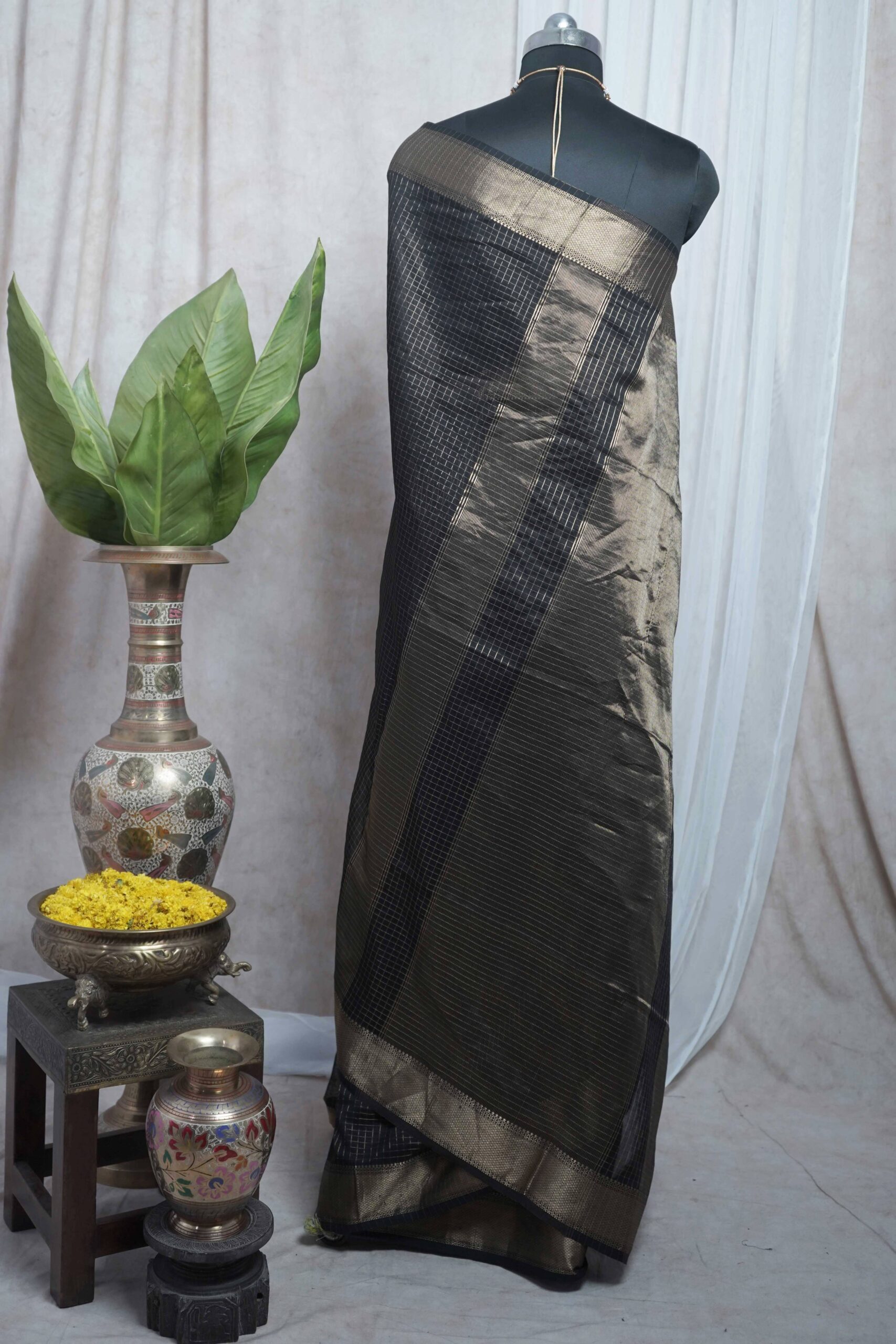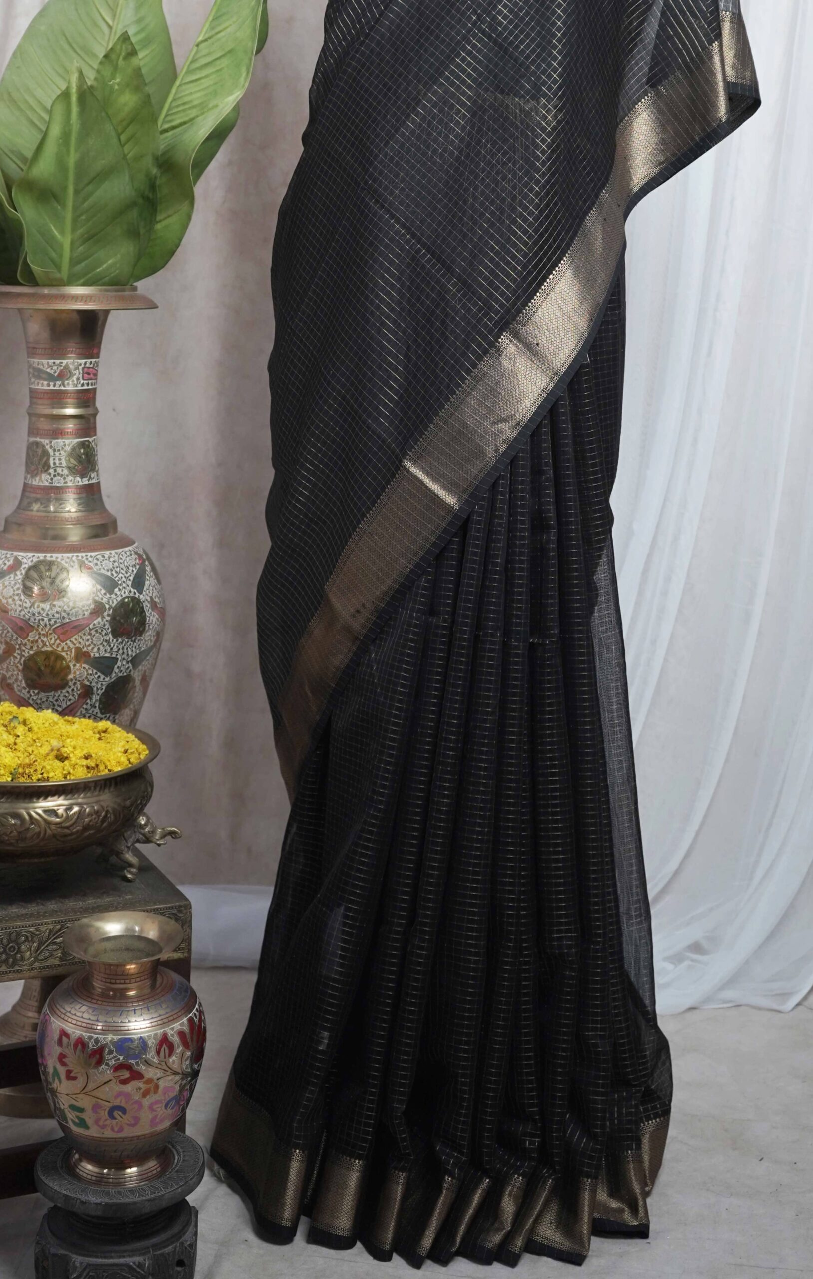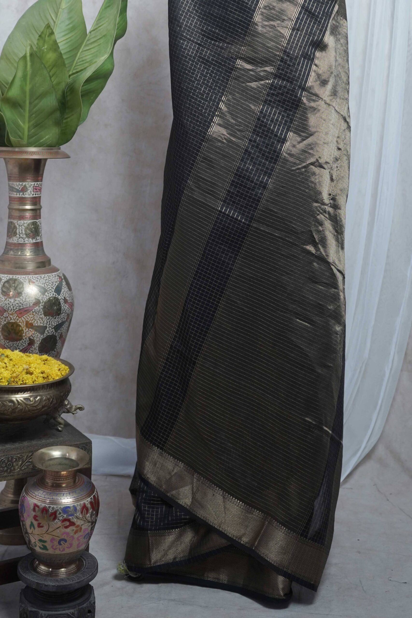 Elevate your ethnic wardrobe with our black Maheshwari sico saree, featuring checks all across the body as well as a classic border in golden zari, and a striking stripped palla in golden zari. This saree blends traditional artistry with modern elegance, perfect for any special occasion