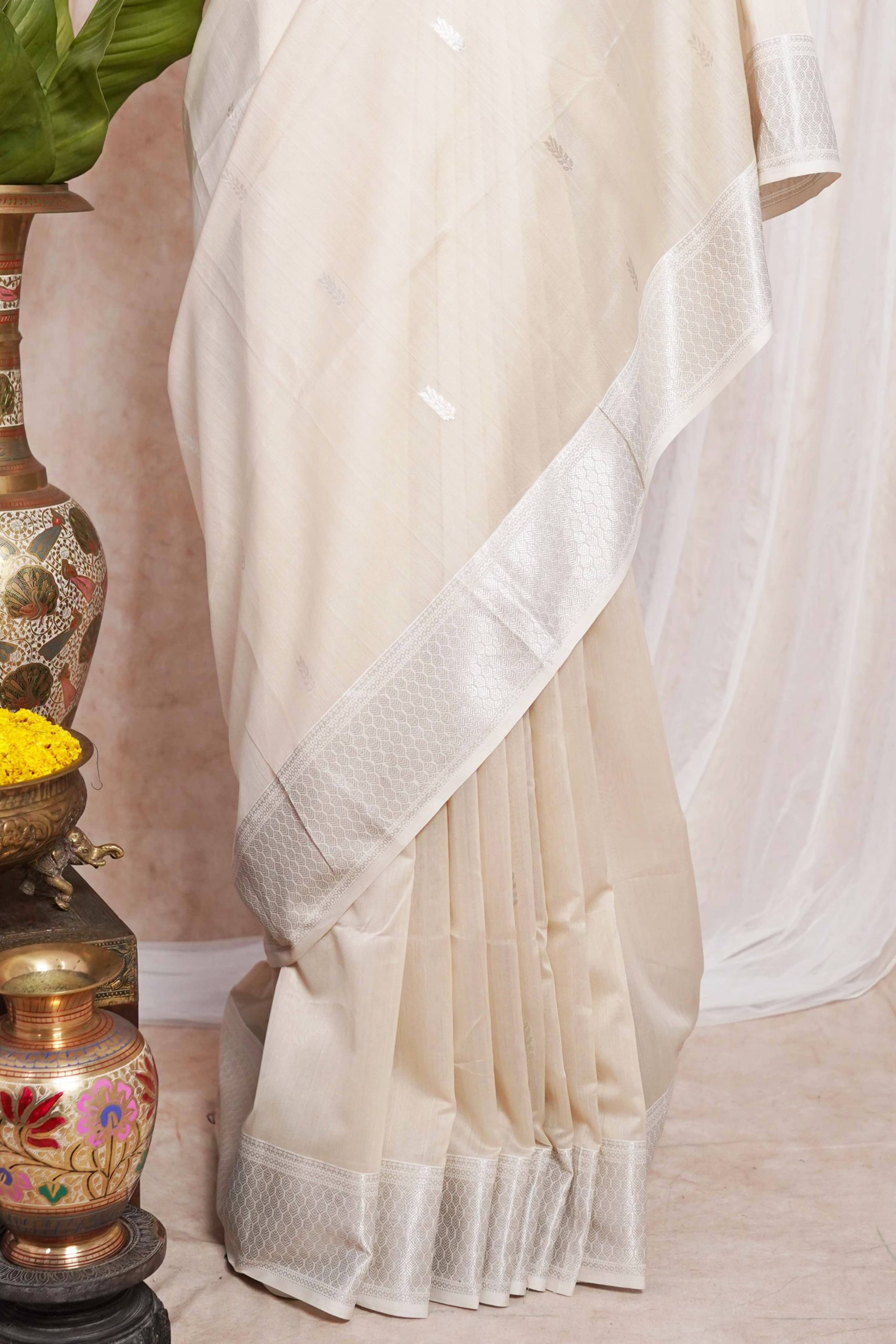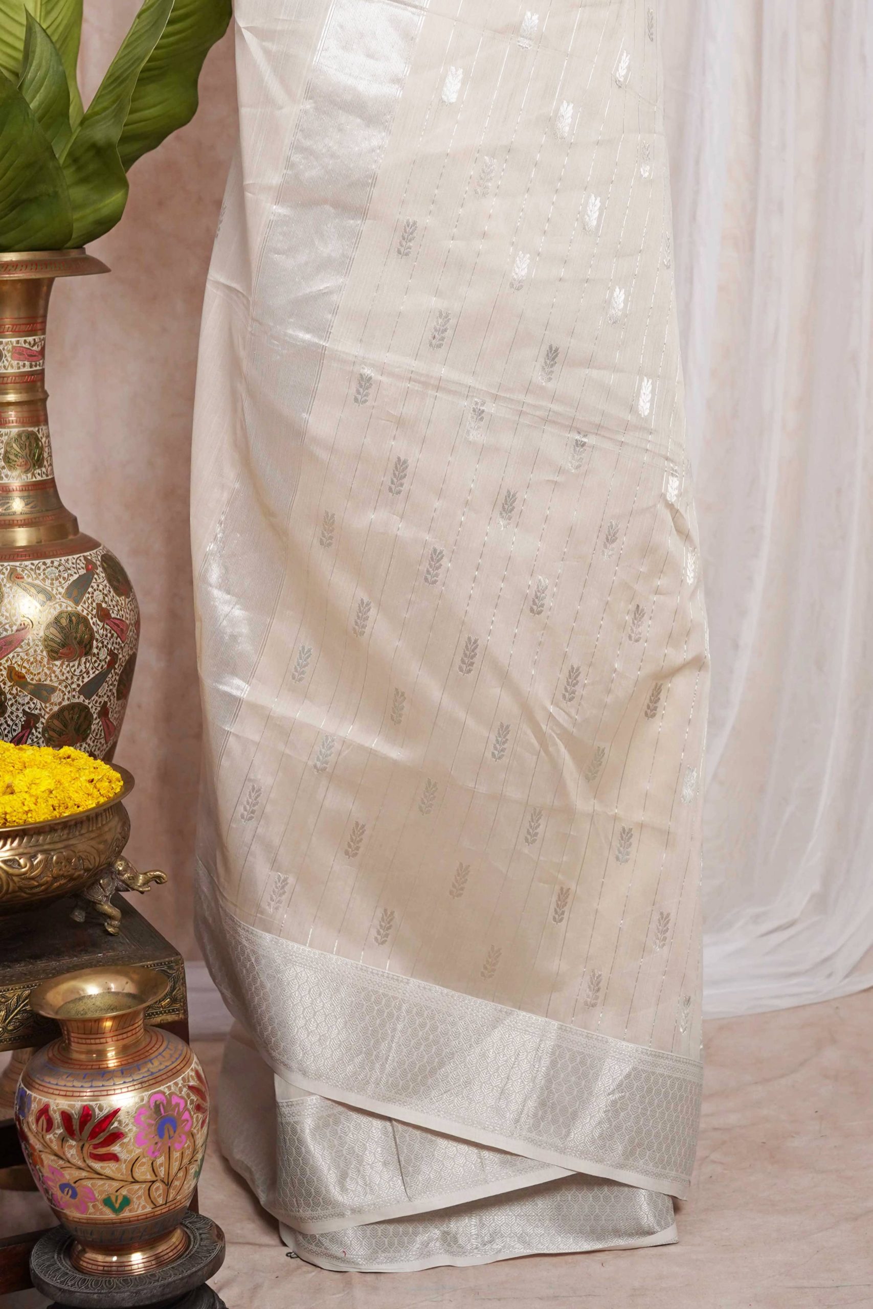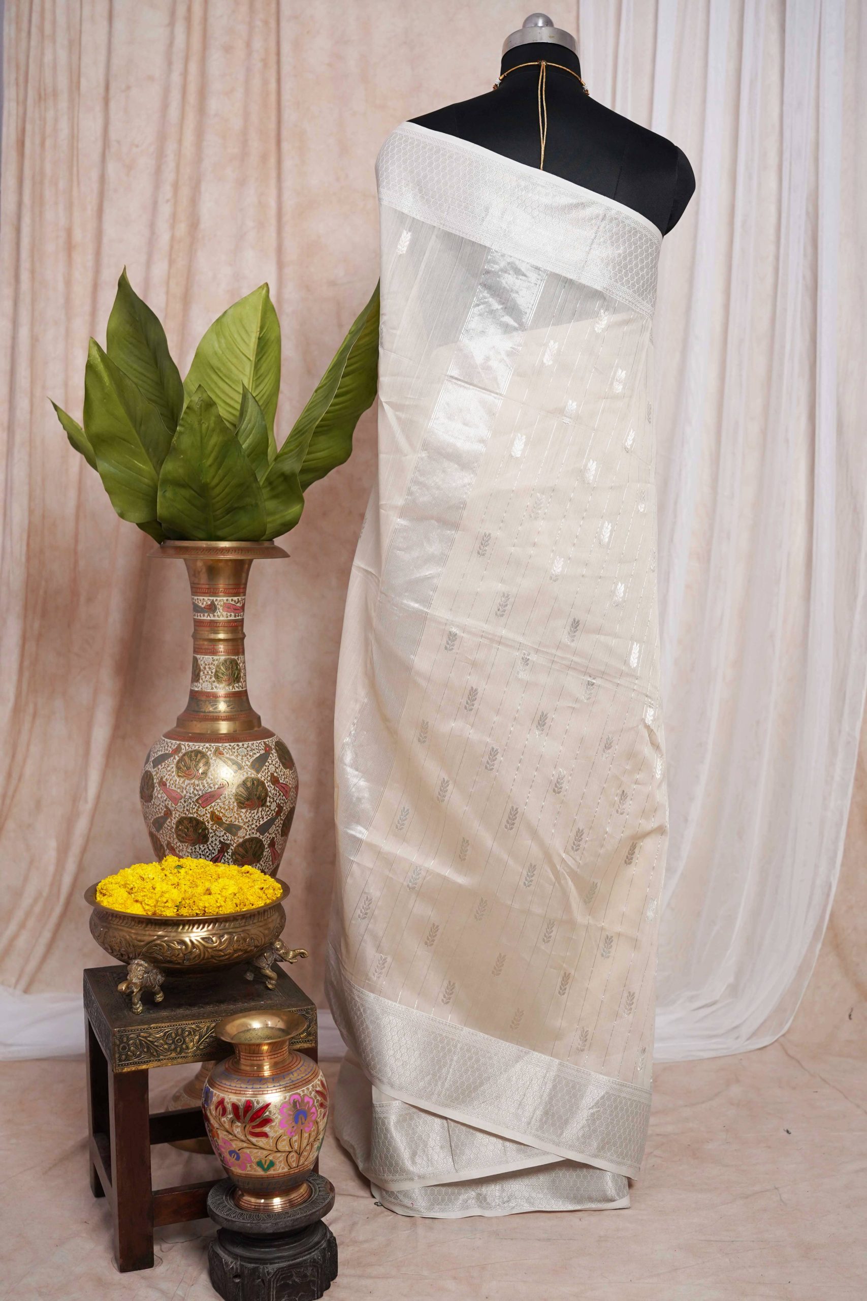 Elevate your ethnic wardrobe with our off-white Maheshwari sico saree, featuring , a classic border in silver zari, and a striking stripped palla with floral motifs in silver zari. This saree blends traditional artistry with modern elegance, perfect for any special occasion