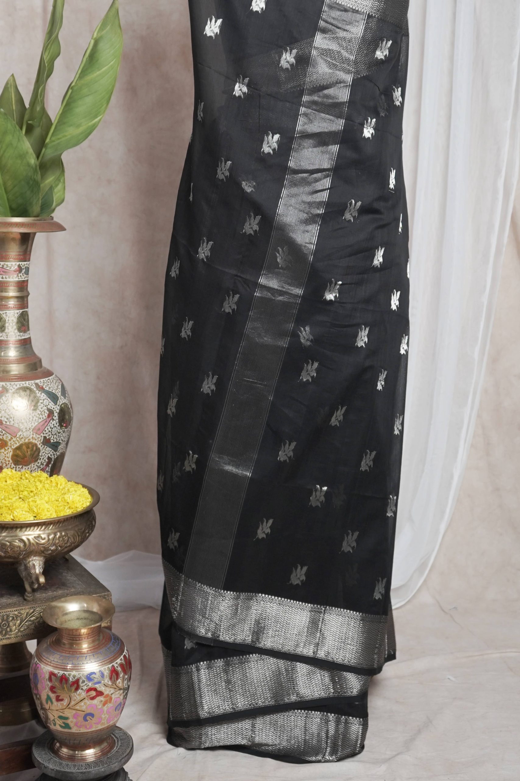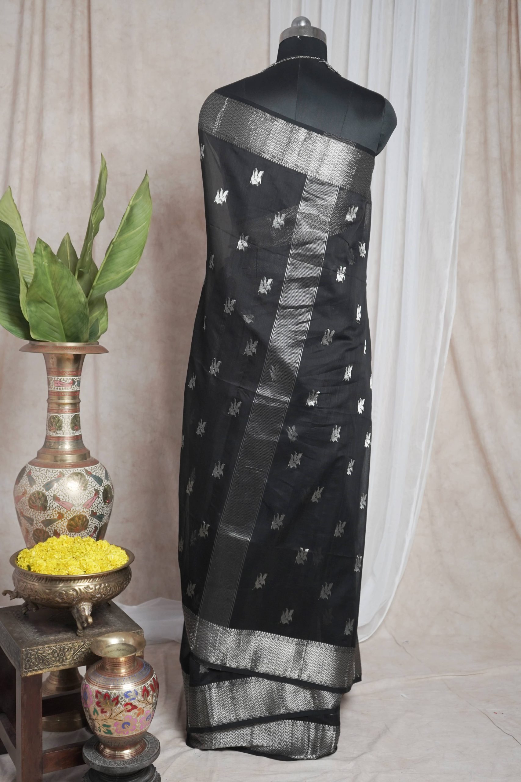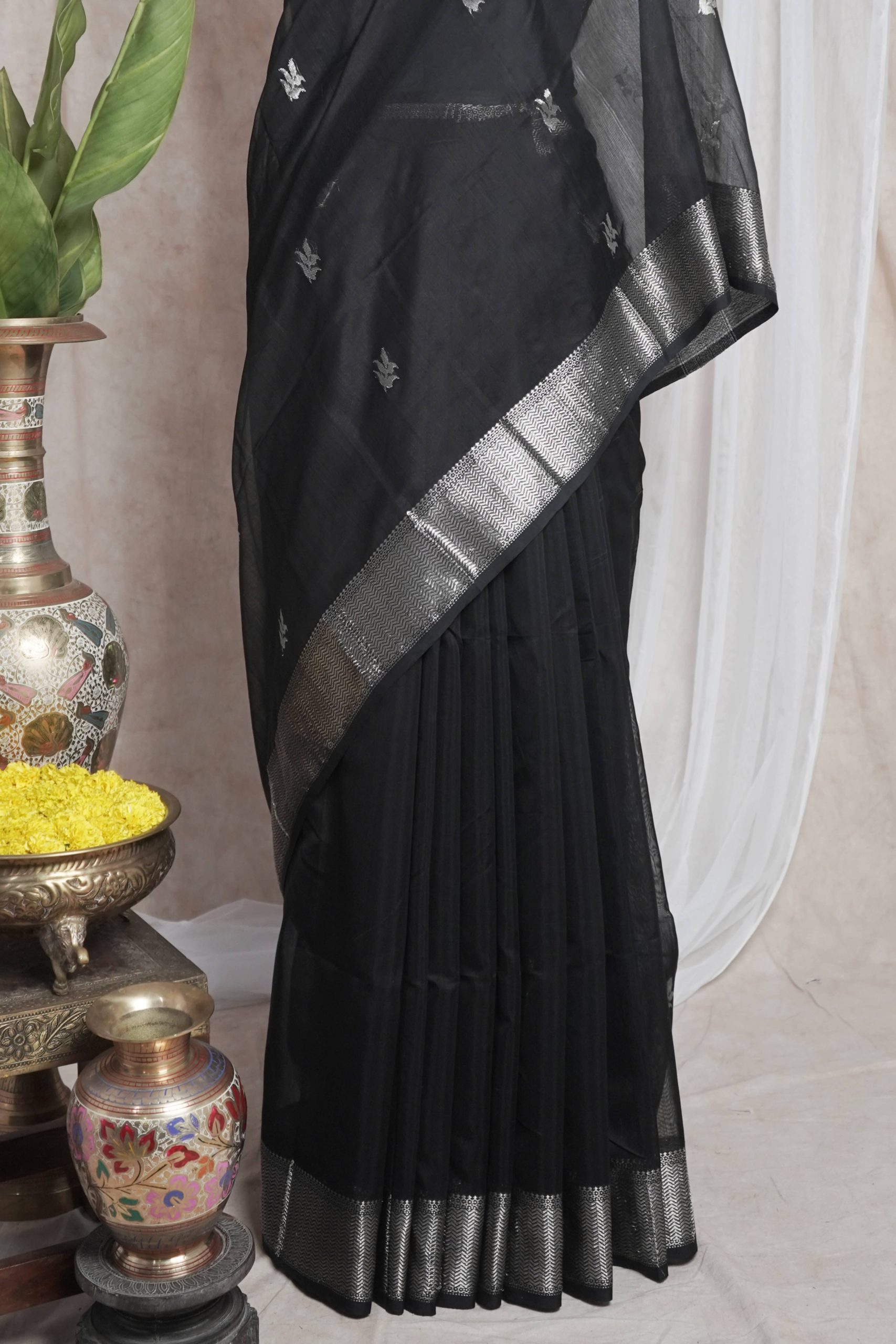 Elevate your ethnic wardrobe with our black Maheshwari sico saree, featuring intricate floral motifs, a classic Narmada border with silver zari. This saree blends traditional artistry with modern elegance, perfect for any special occasion.