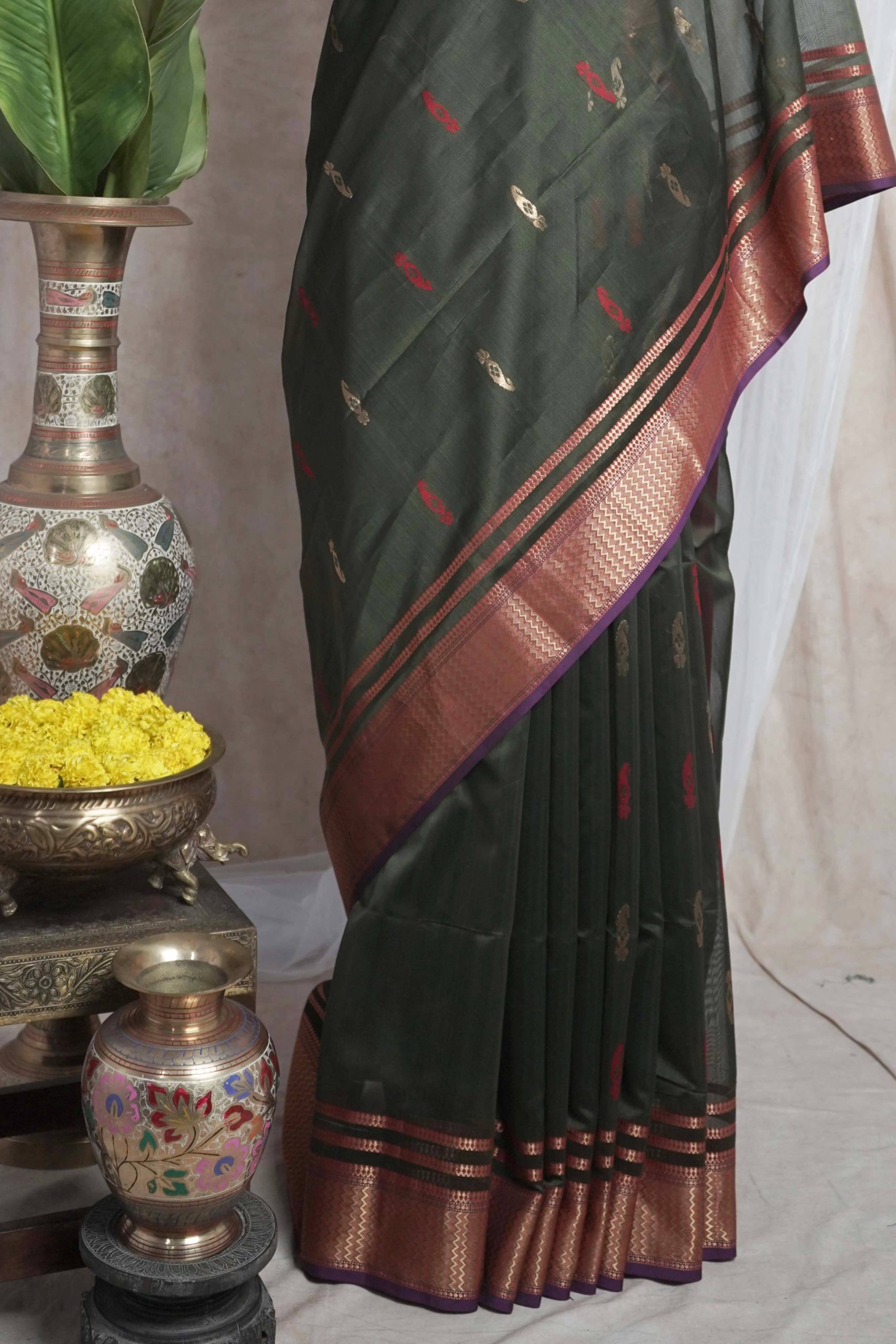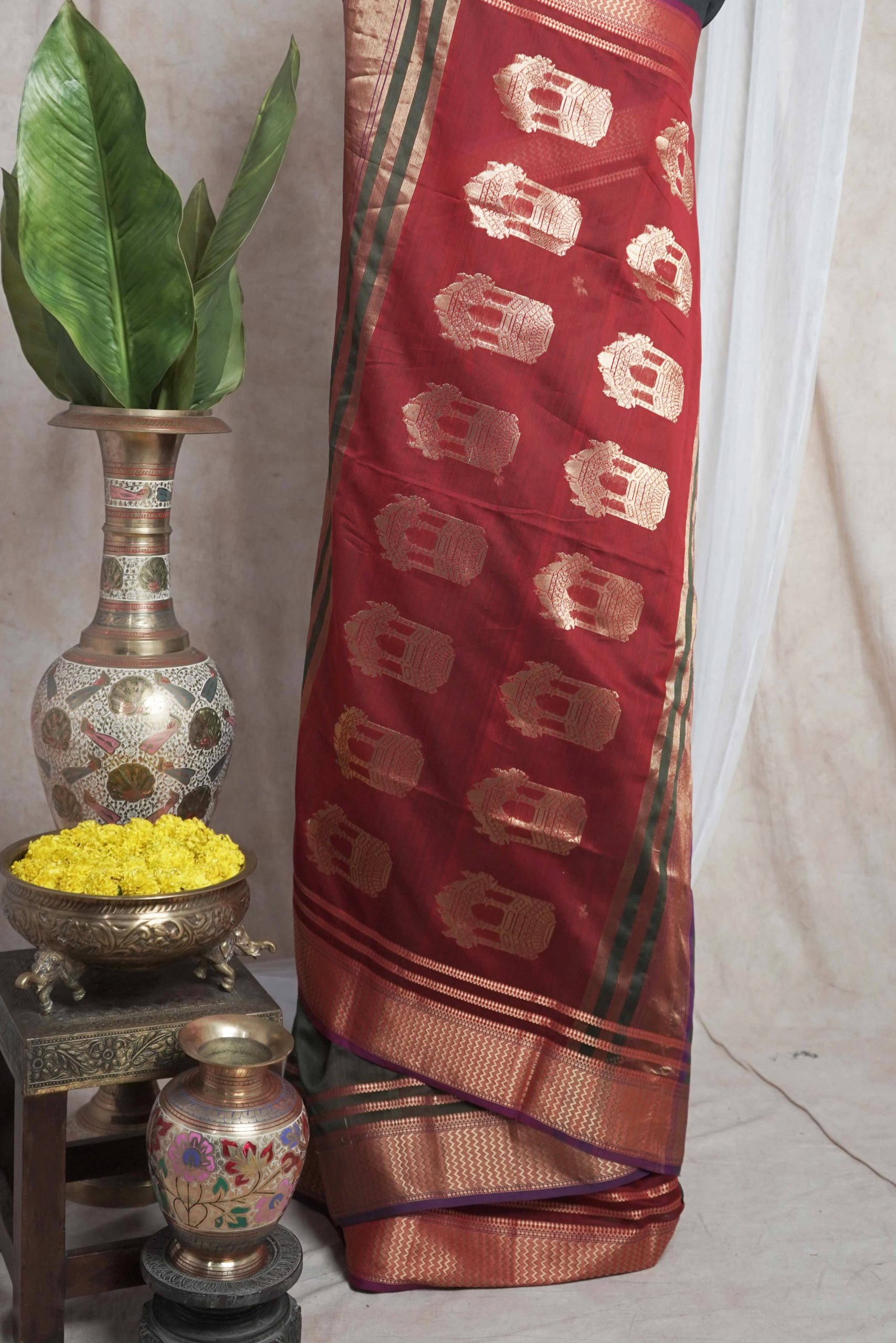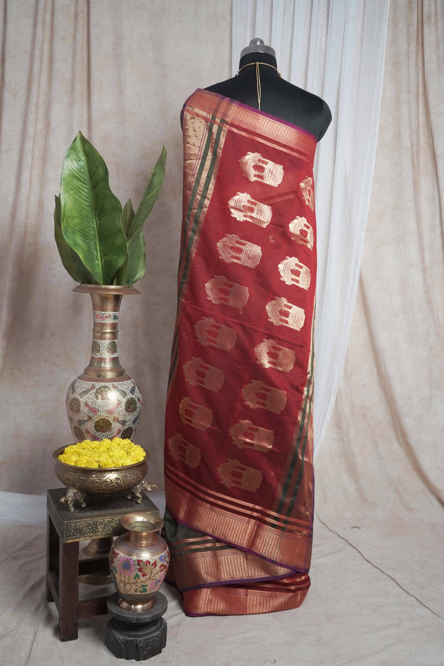 Elevate your ethnic wardrobe with our Sap Green Maheshwari Sico Saree, featuring intricate paisley motifs, a classic Narmada border with golden zari, and a striking jharoka design golden zari palla. This saree blends traditional artistry with modern elegance, perfect for any special occasion.