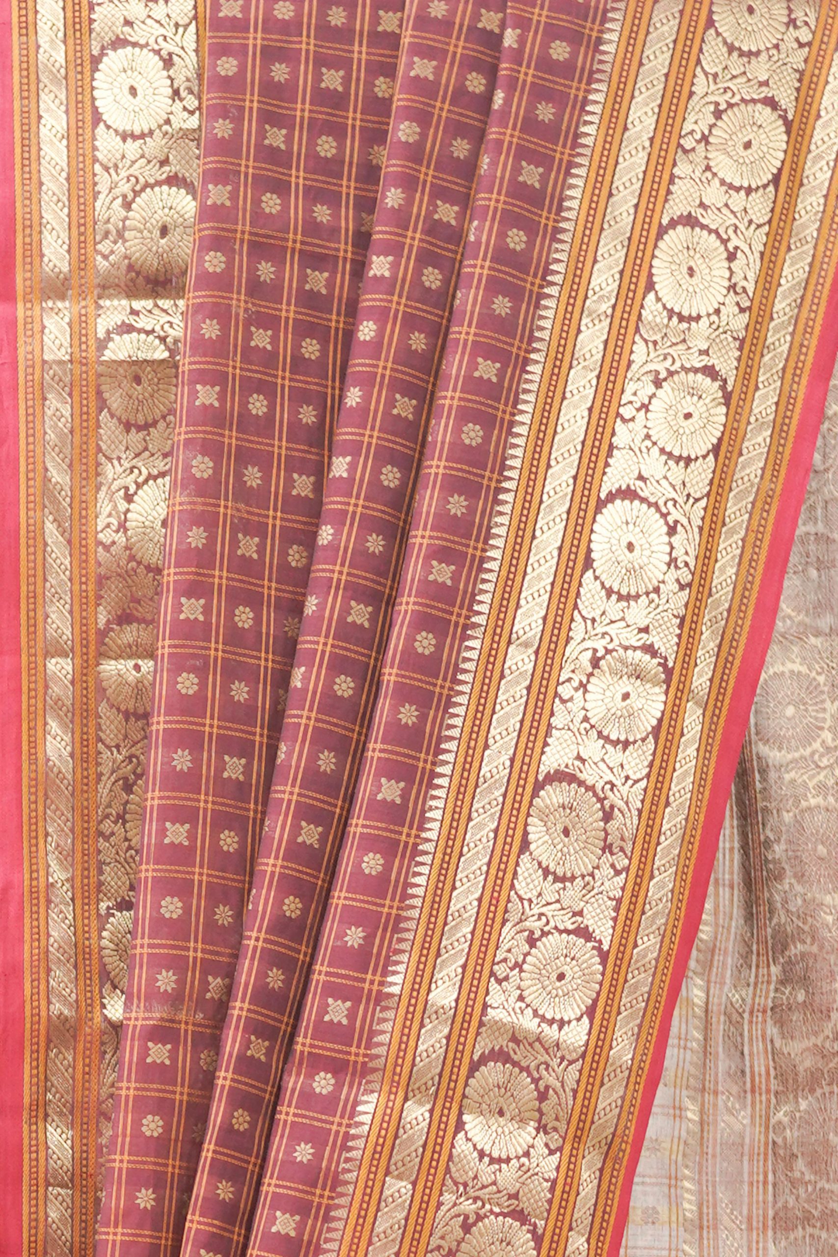 Enhance your ethnic ensemble with our maroon Kanchipuram cotton saree, featuring intricate small floral butis all across with a striking and traditional zari work border. Perfect for any special occasion, this saree combines traditional artistry with modern elegance.