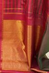 Our exquisite maroon Kanjeevaram silk saree designed in stripes all across the body in threadwork. The pallu is adorned with intricate zari work, adding a unique and charming touch. The green maroon dual toned border adds a striking contrast to the very look of the saree.