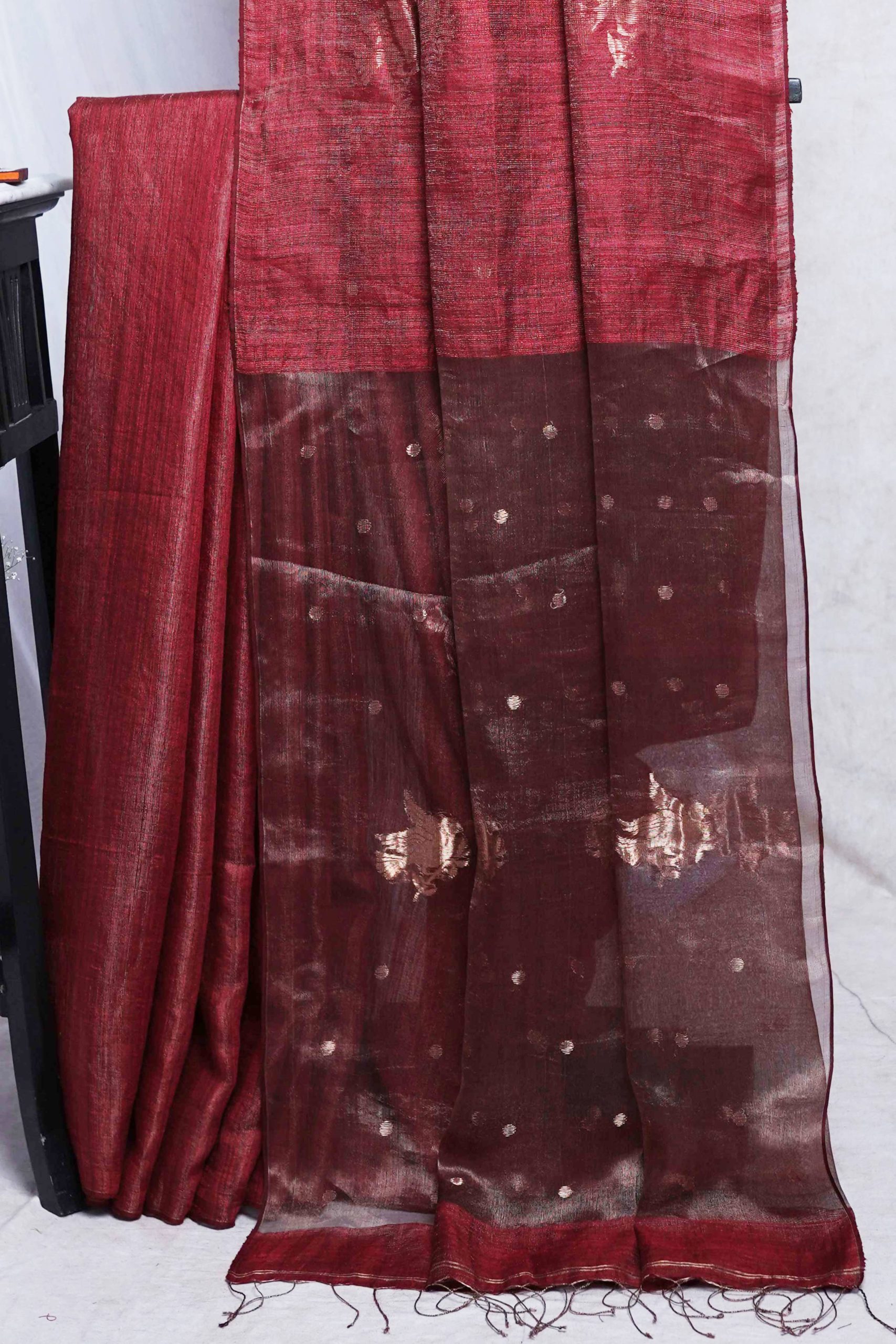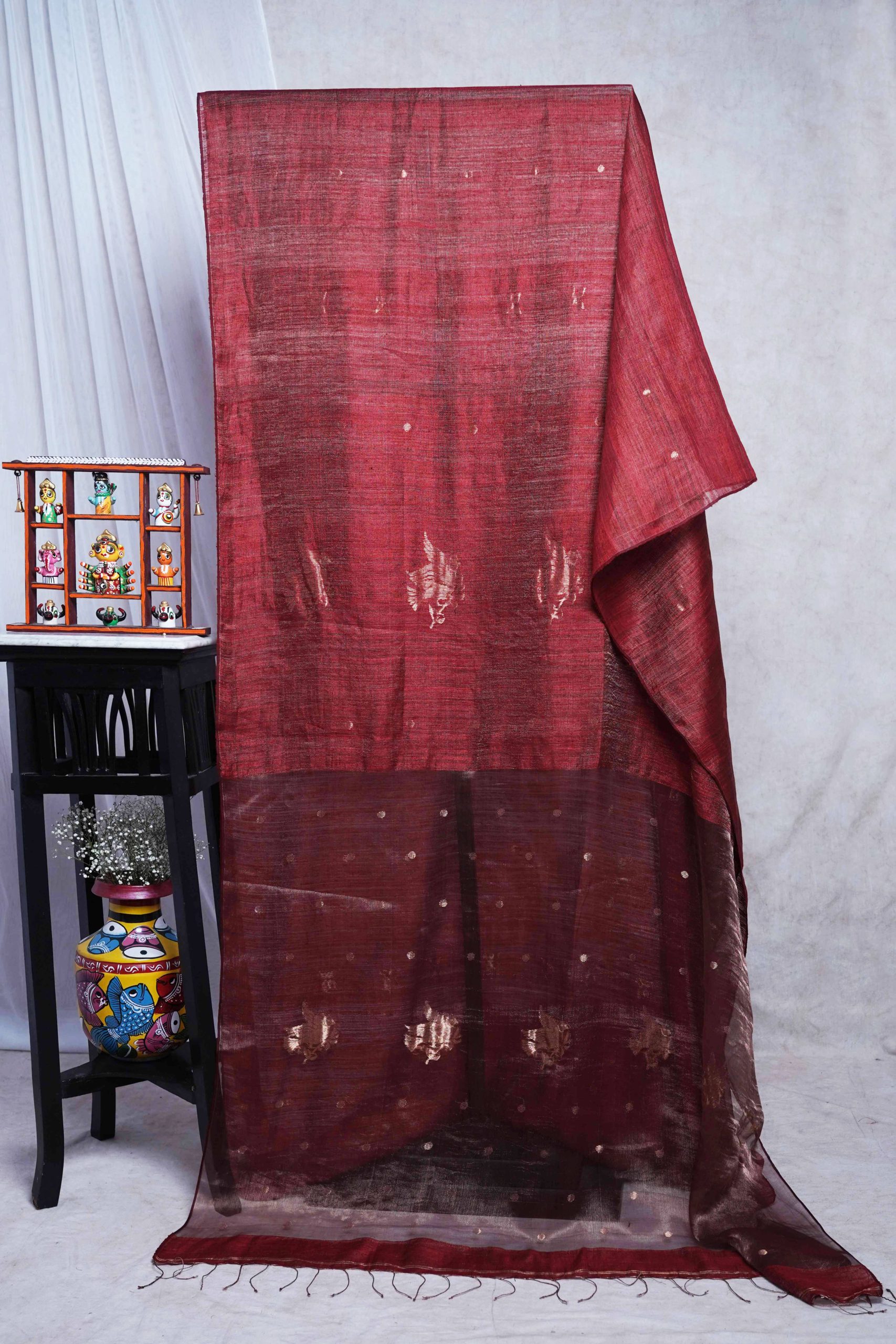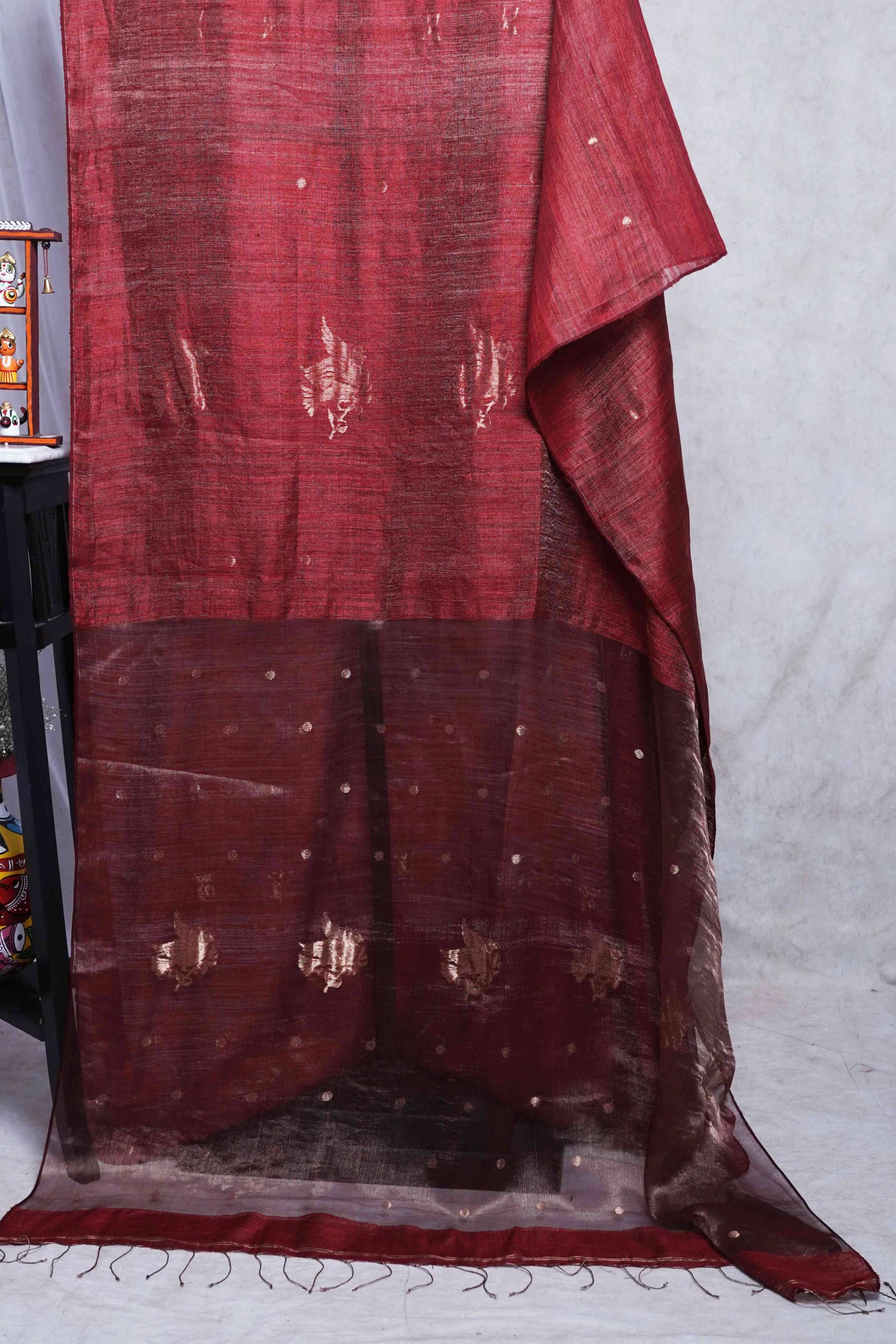 Delve into the timeless charm of reddish maroon Matka Silk Sarees, where tradition meets rustic elegance. Handwoven with a unique texture, these sarees feature exquisite designs and subtle sheen, beautifully enhanced with intricate detailing. Perfect for festive and special occasions, they embody a blend of heritage and sophistication.