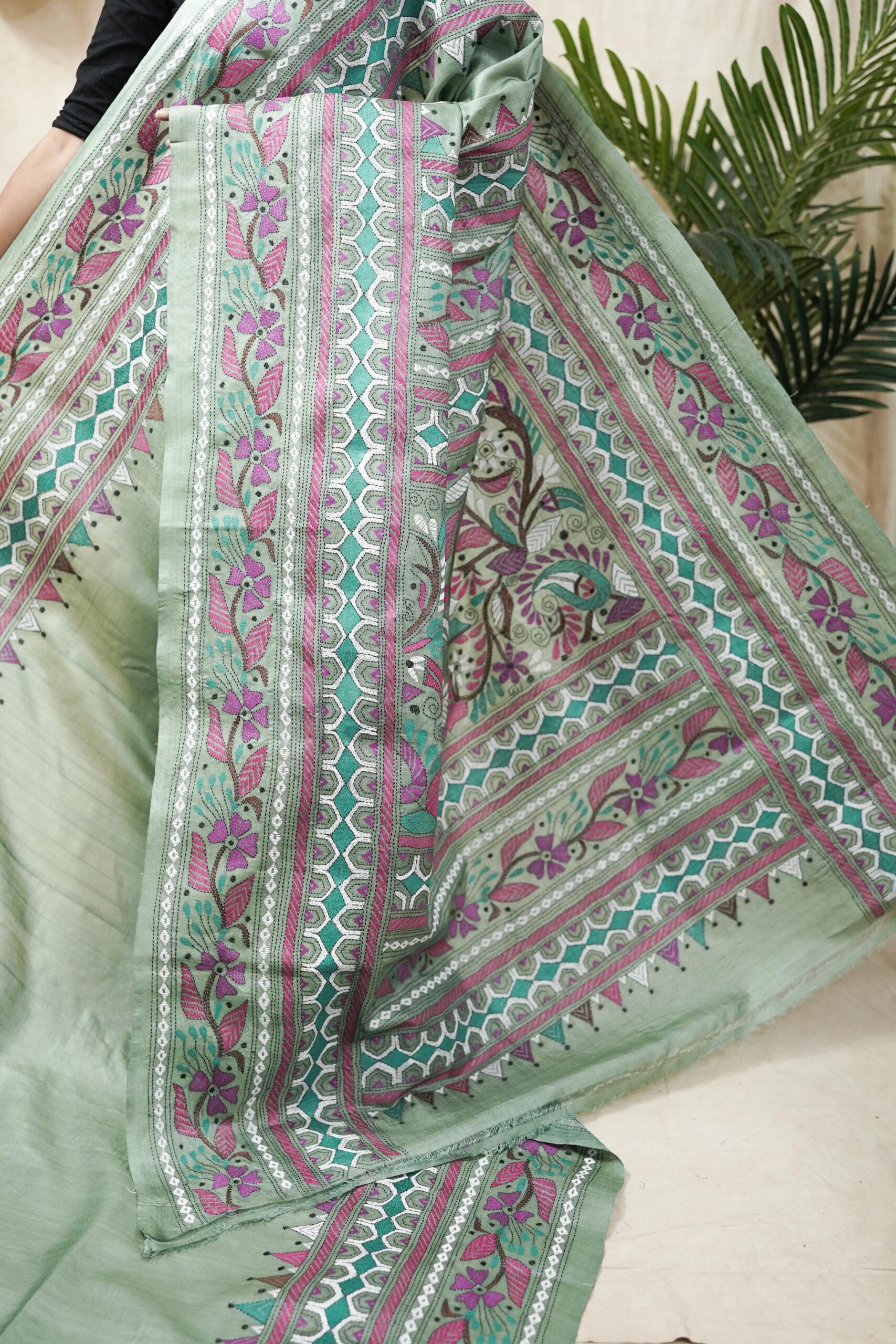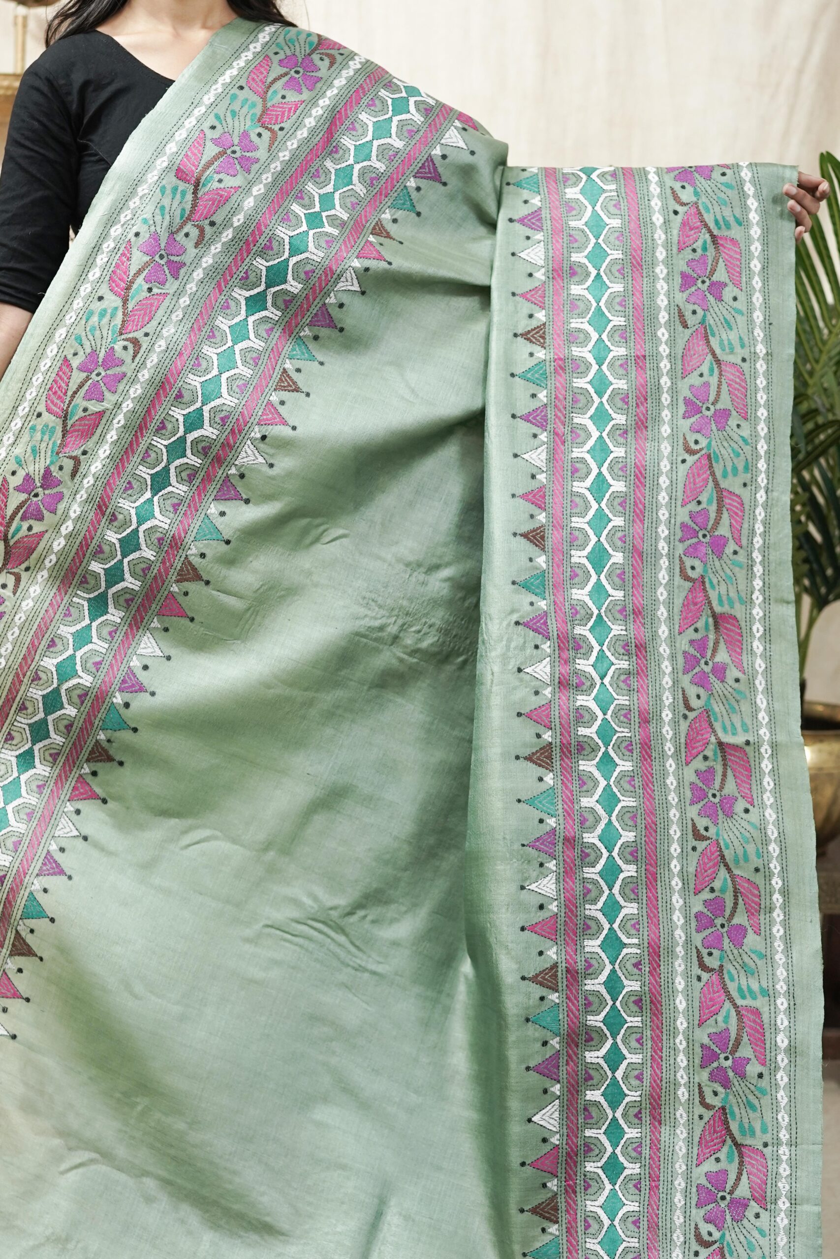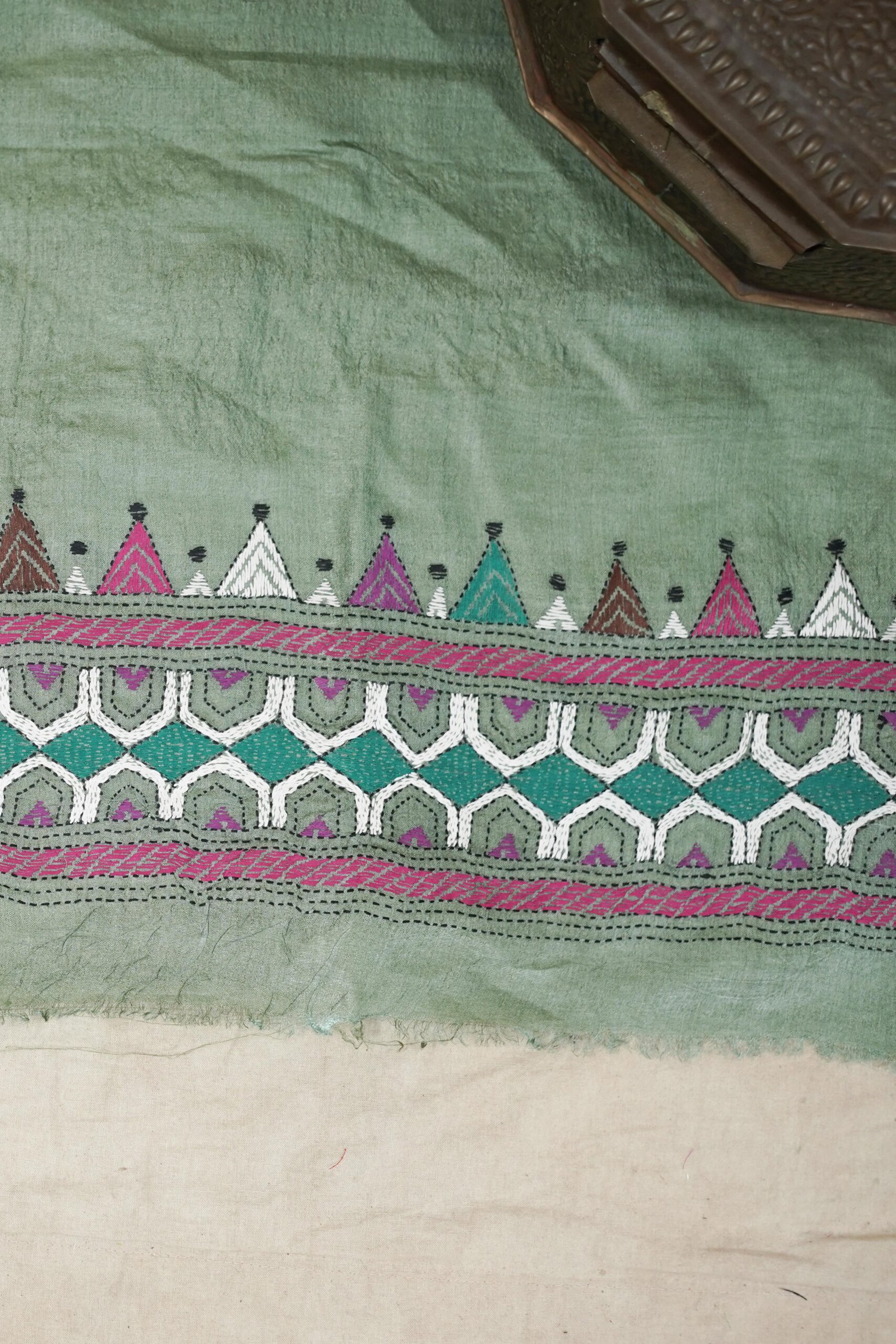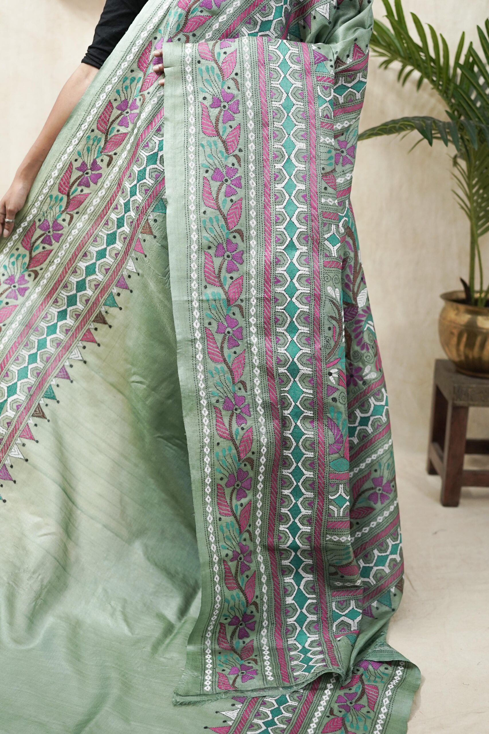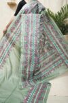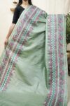 | “Our exquisite tussar silk saree, available in elegant shades of mint green, is adorned with delicate Kantha hand embroidery featuring intricate motifs that reflect the rich craft heritage of Nanoor, West Bengal. The natural texture of tussar blends beautifully with the fine stitches, creating an elegant drape perfect for cultural gatherings, festive occasions, or timeless everyday grace.” |