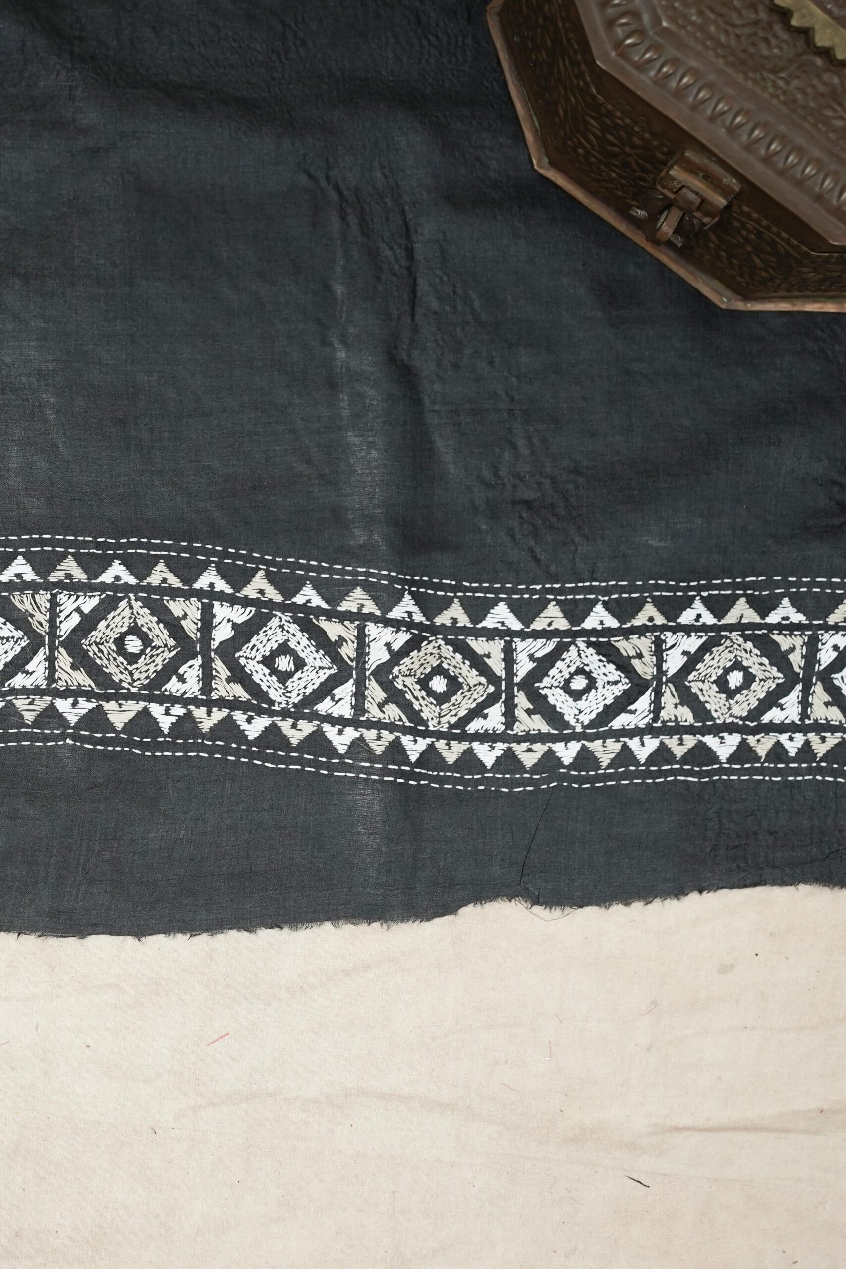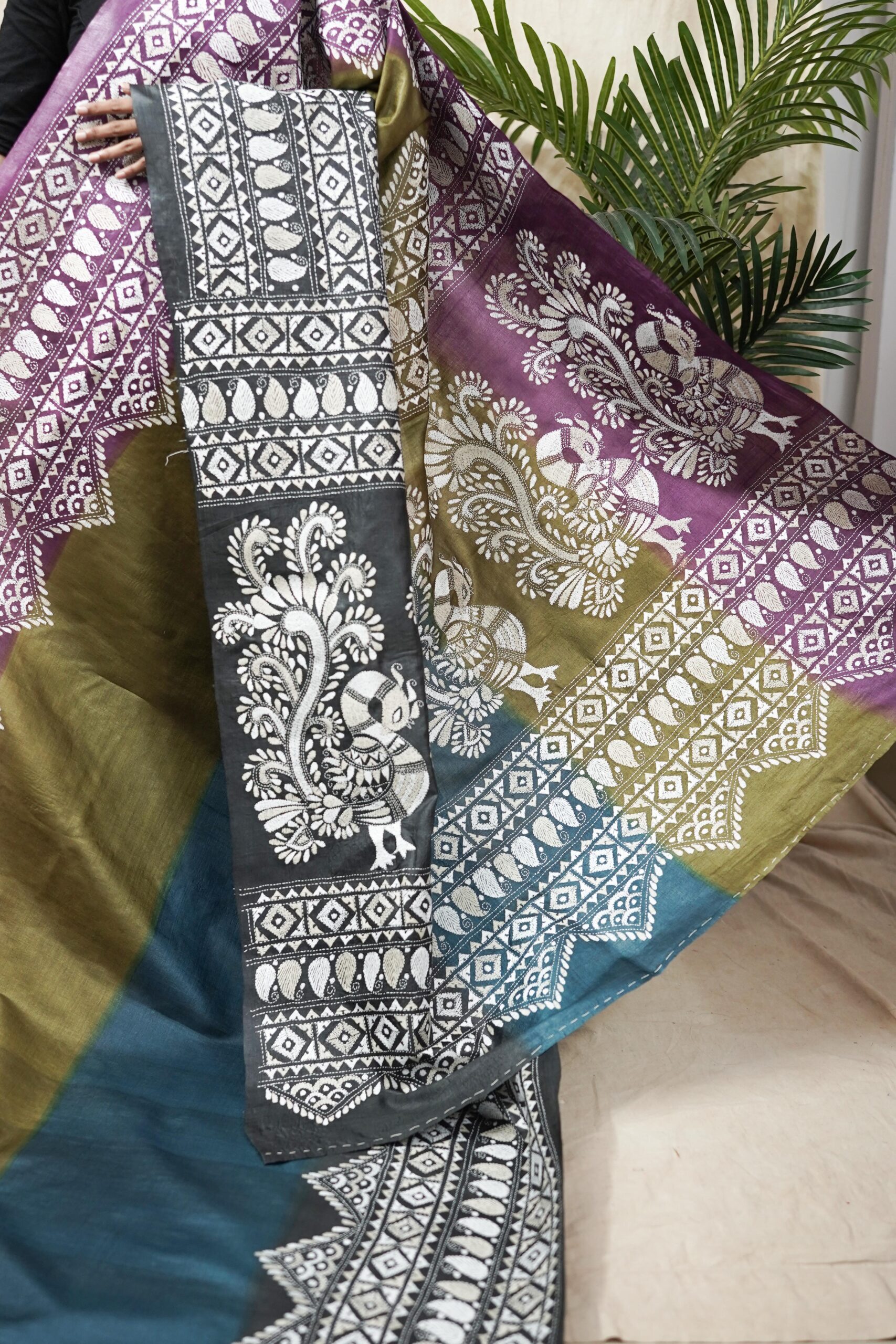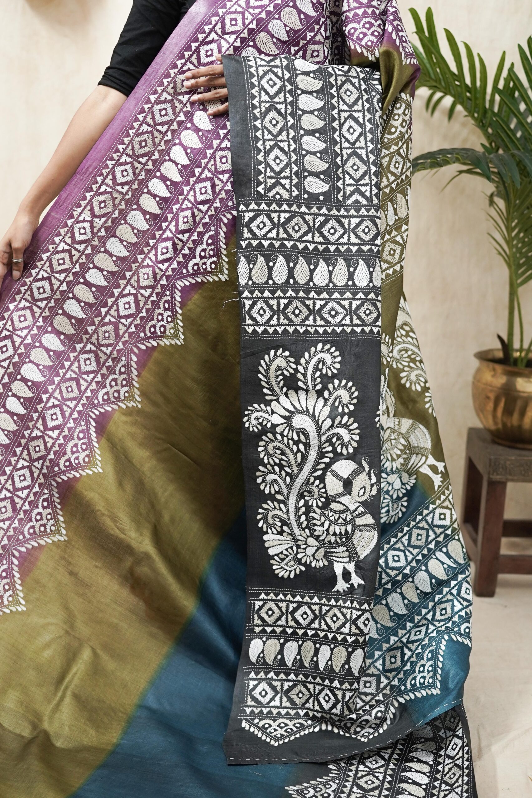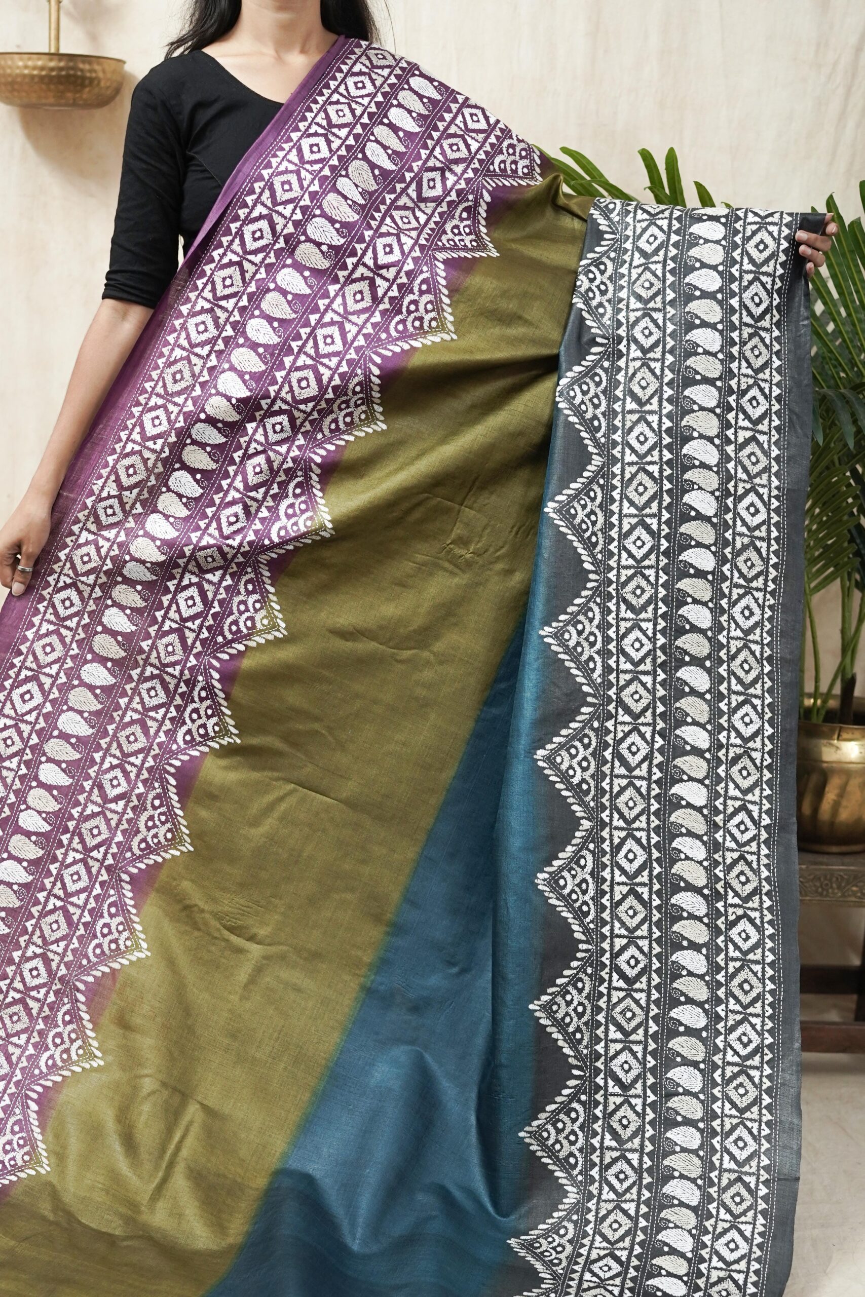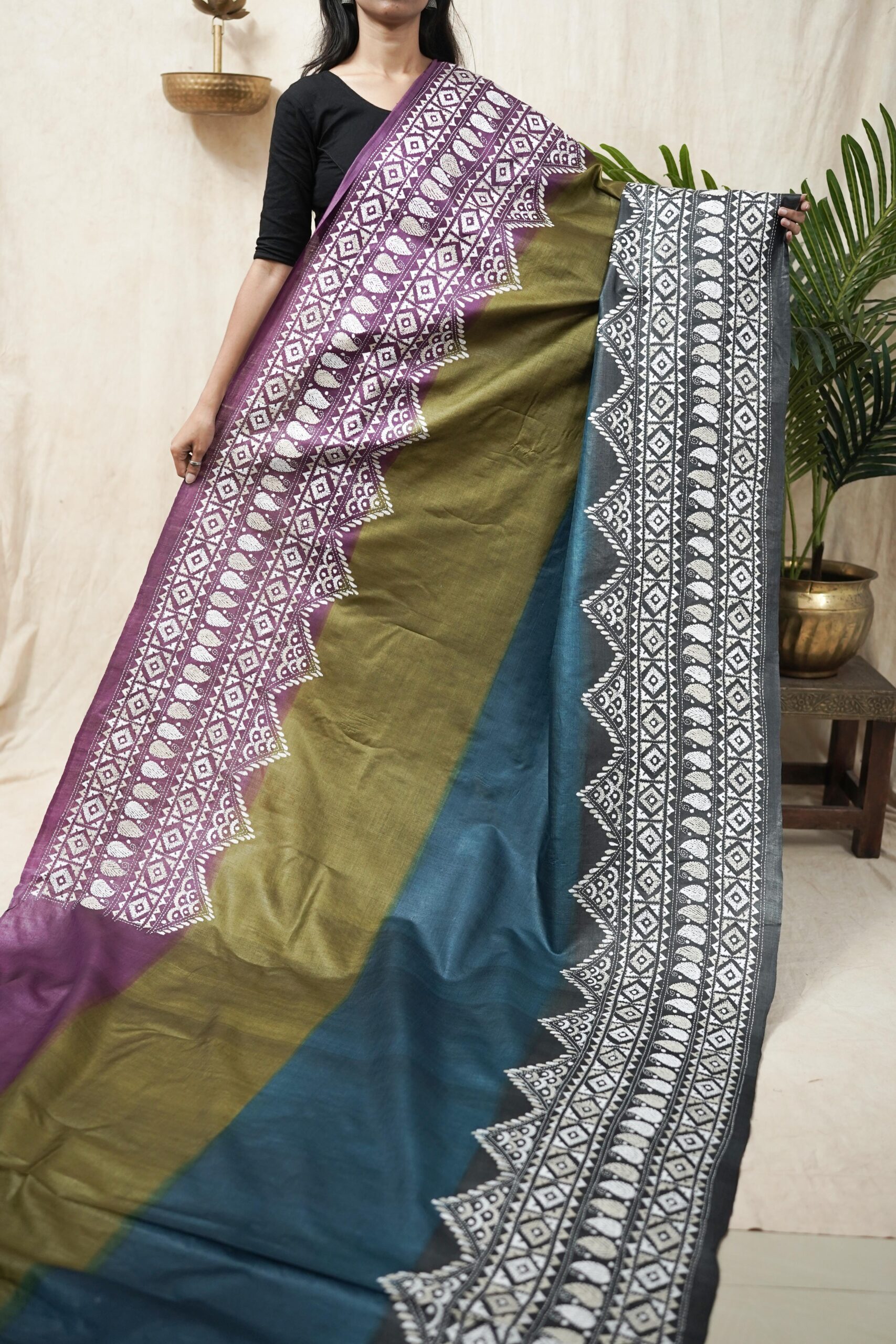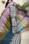 | “Our exquisite tussar silk saree, available in elegant shades of olive, purple, blue, and grey, is adorned with delicate Kantha hand embroidery featuring intricate motifs that reflect the rich craft heritage of Nanoor, West Bengal. The natural texture of tussar blends beautifully with the fine stitches, creating an elegant drape perfect for cultural gatherings, festive occasions, or timeless everyday grace.” |