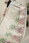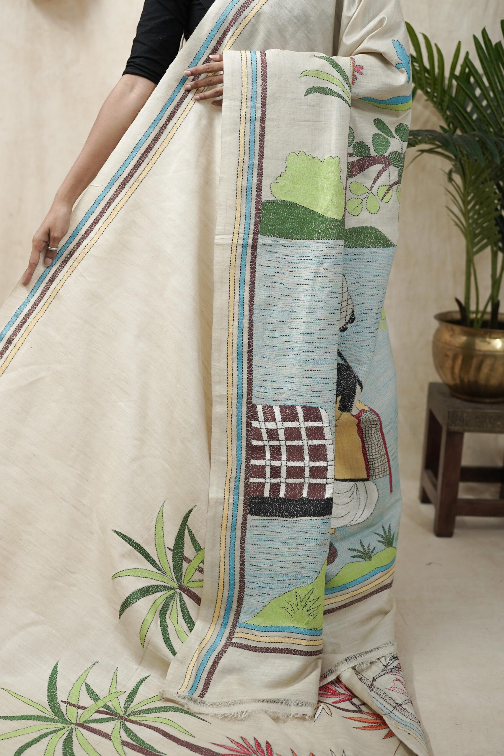 HANDWOVEN OFF-WHITE COLOUR KANTHA TUSSAR SILK SAREE WITH 90 CM BLOUSE PIECE