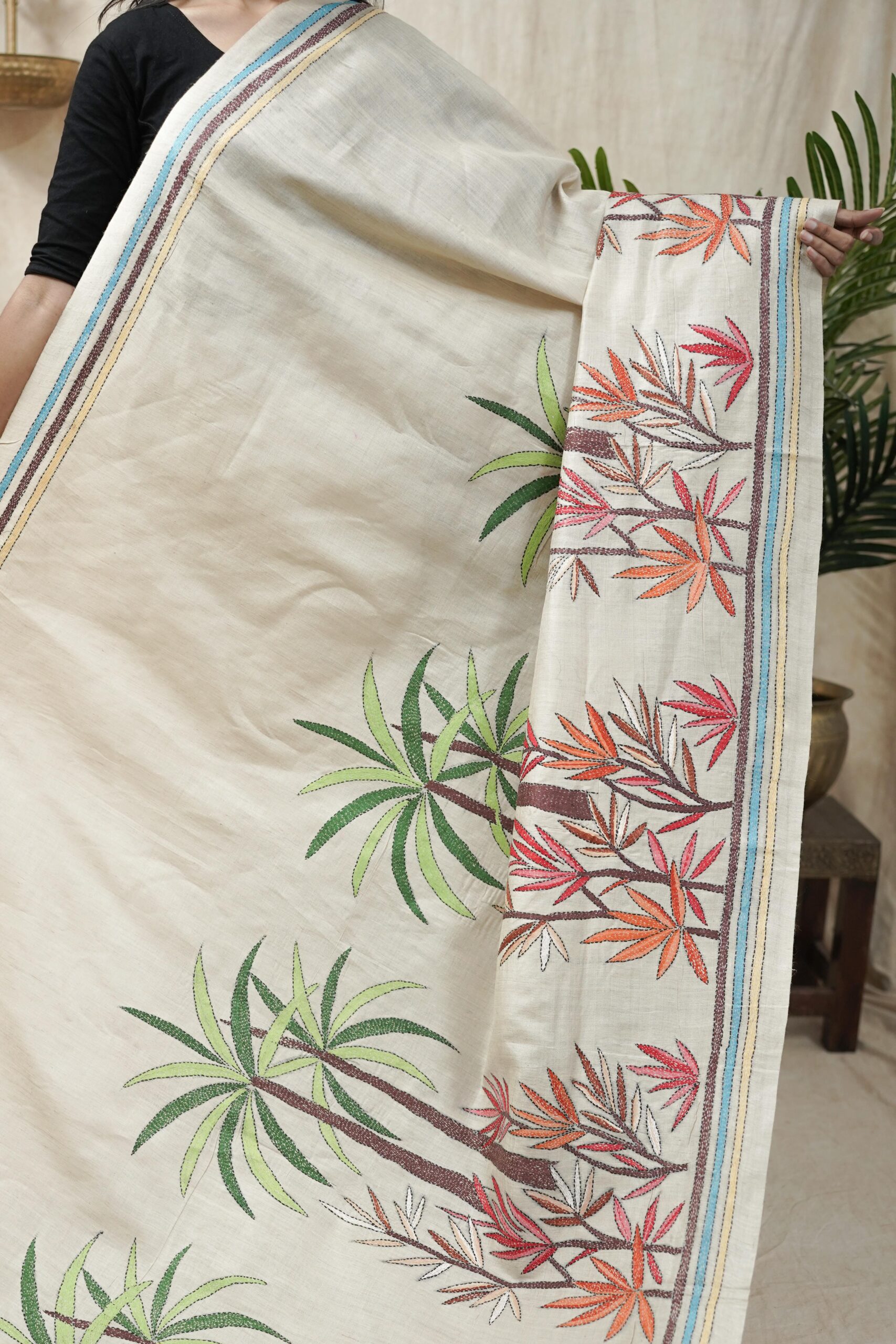 Our exquisite tussar silk saree in the shade of off-white is adorned with delicate Kantha hand embroidery, featuring intricate designs inspired by nature that reflect the rich craft heritage of Nanoor, West Bengal. The natural texture of tussar blends beautifully with the fine stitches, creating an elegant drape perfect for cultural gatherings, festive occasions, or timeless everyday grace.