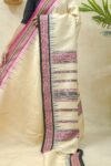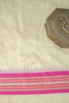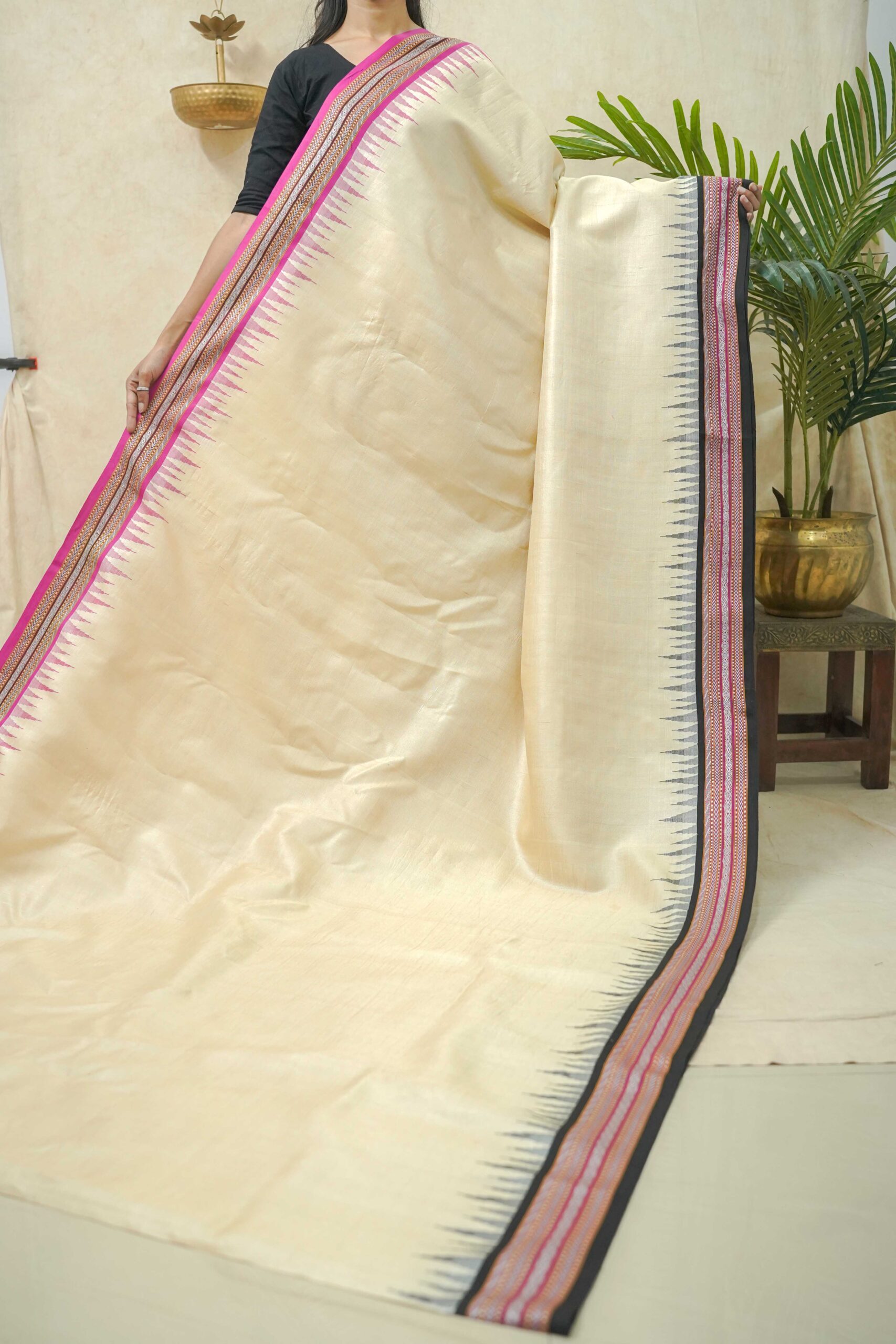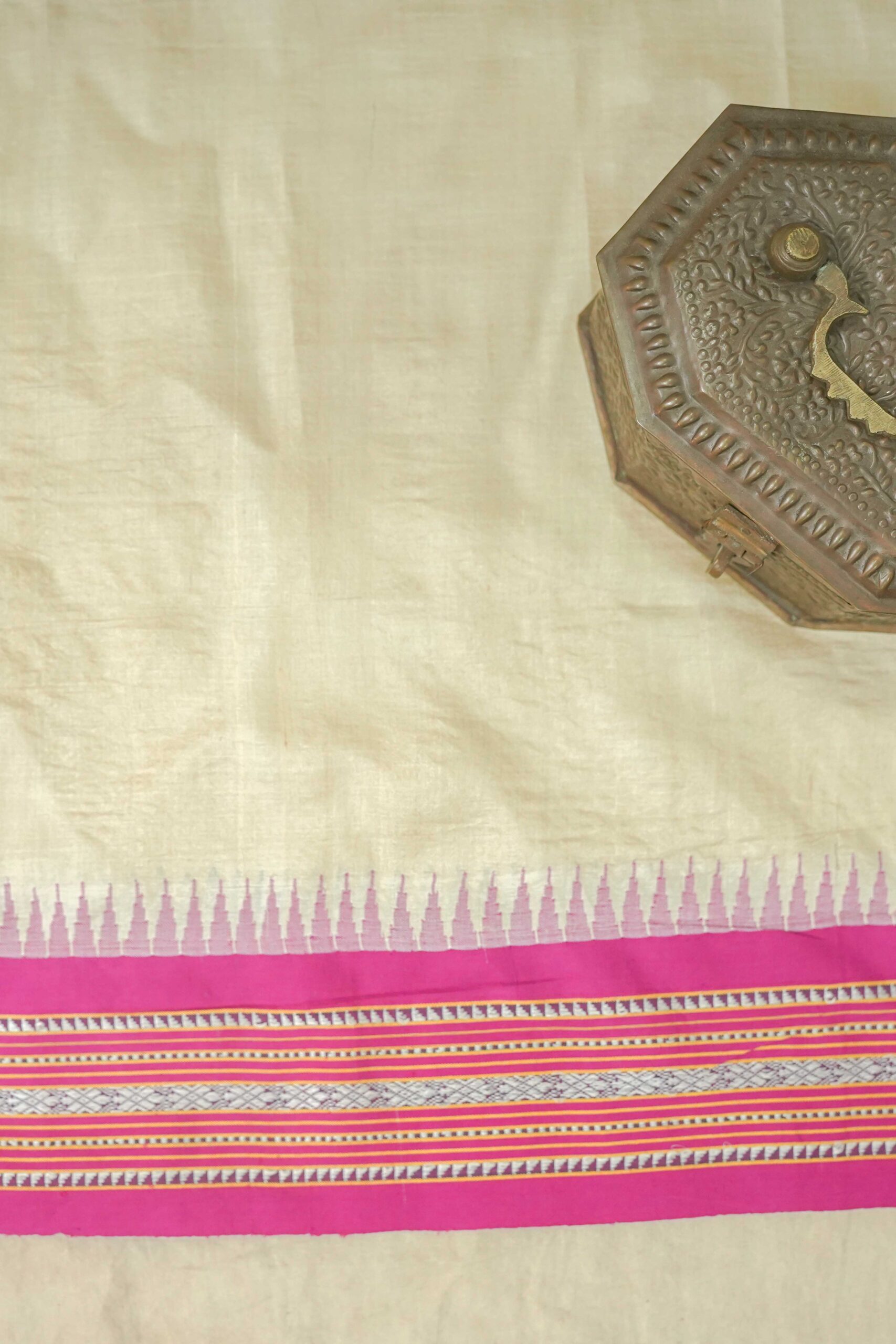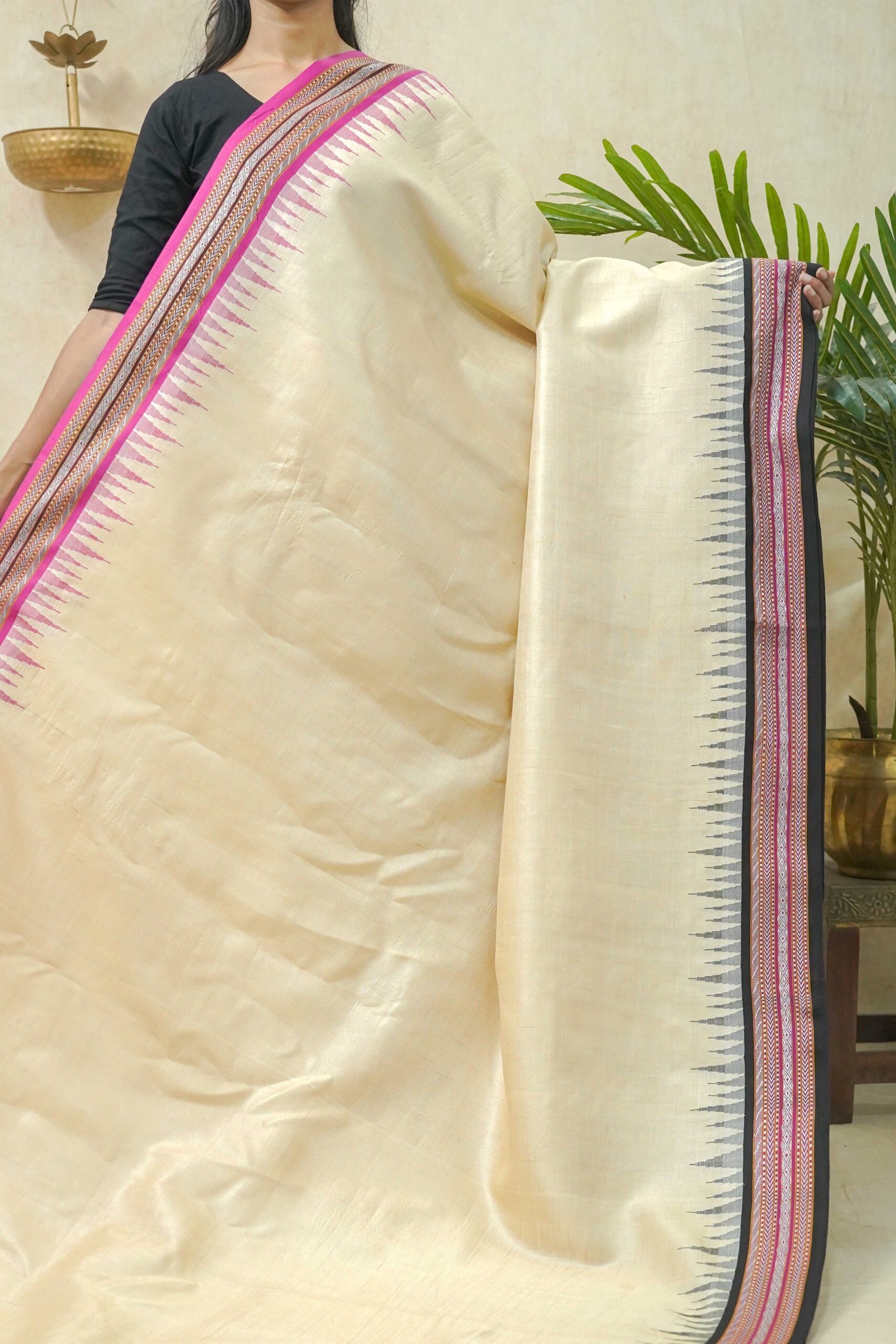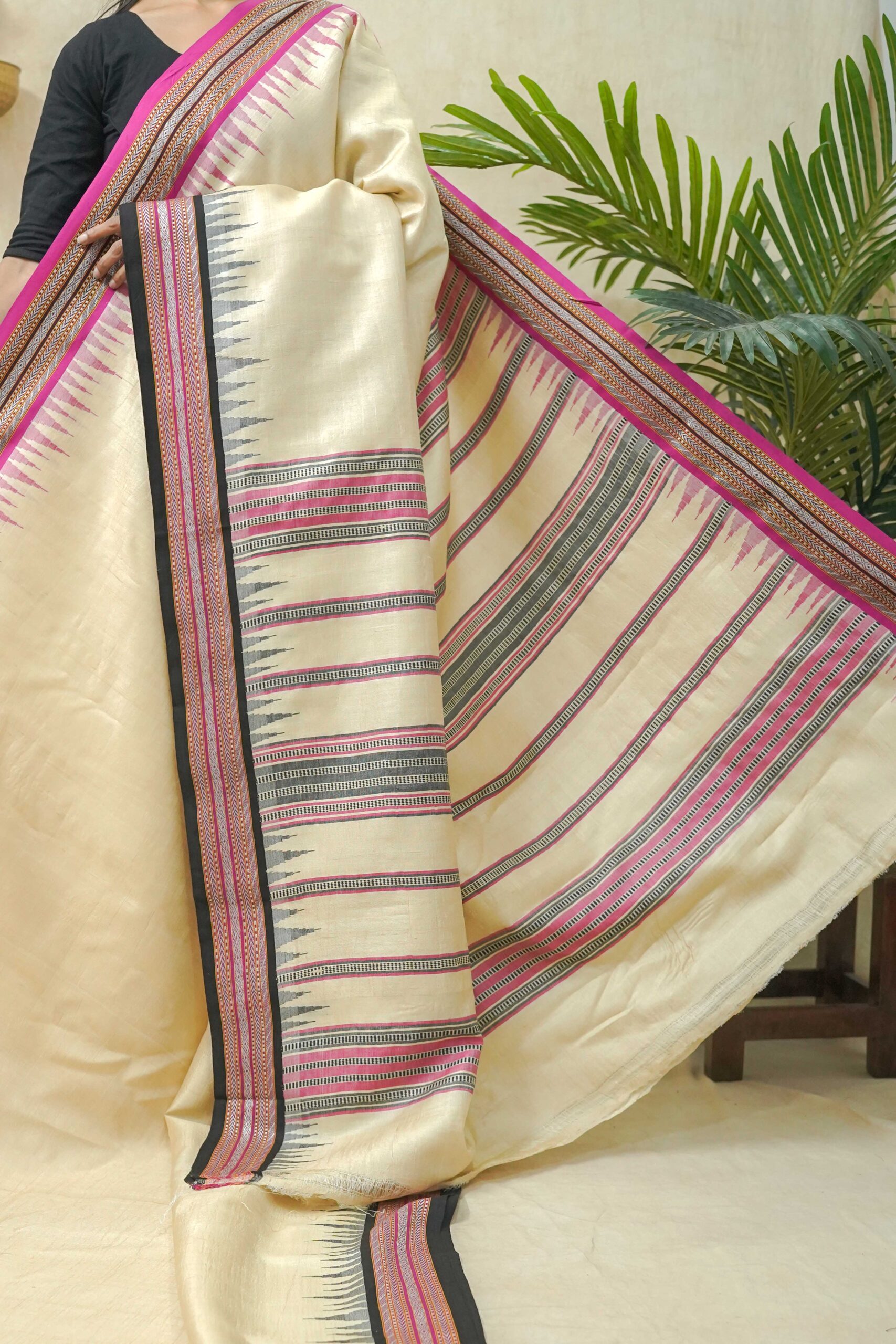 Indulge in the timeless beauty of our off-white Vidarbha tussar saree, this weave from Maharashtra is a fusion of tradition and artistry, woven from the finest tussar silk. Known for its natural sheen and rich texture, this weave carries an understated elegance, highlighted by the distinctive black-dark pink Ganga Jamuna border in contrasting colors. A perfect choice for festive and formal occasions, it beautifully blends heritage with sophistication.”