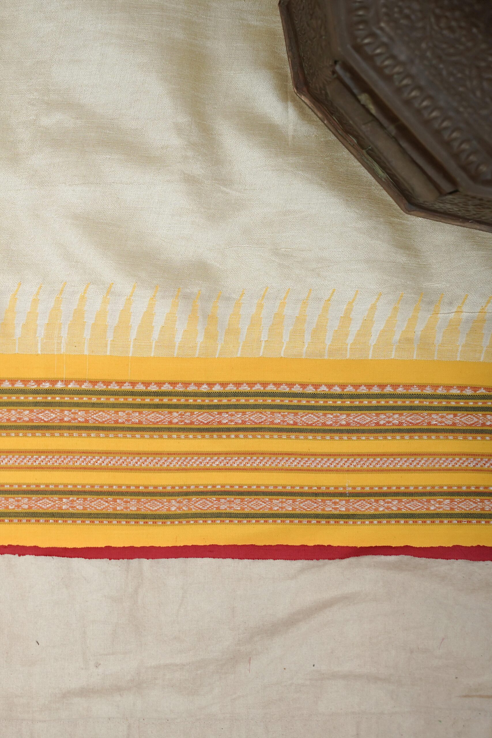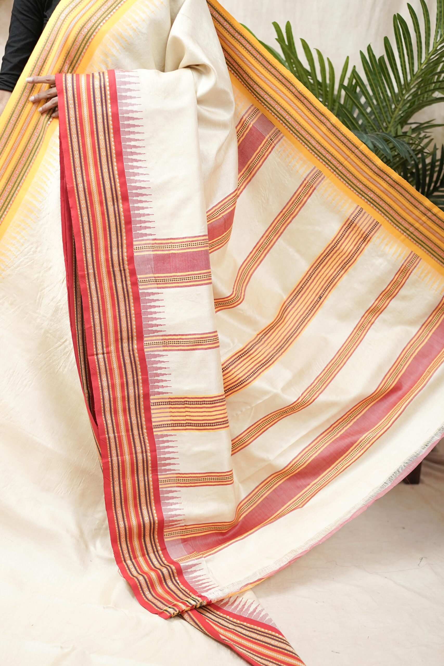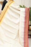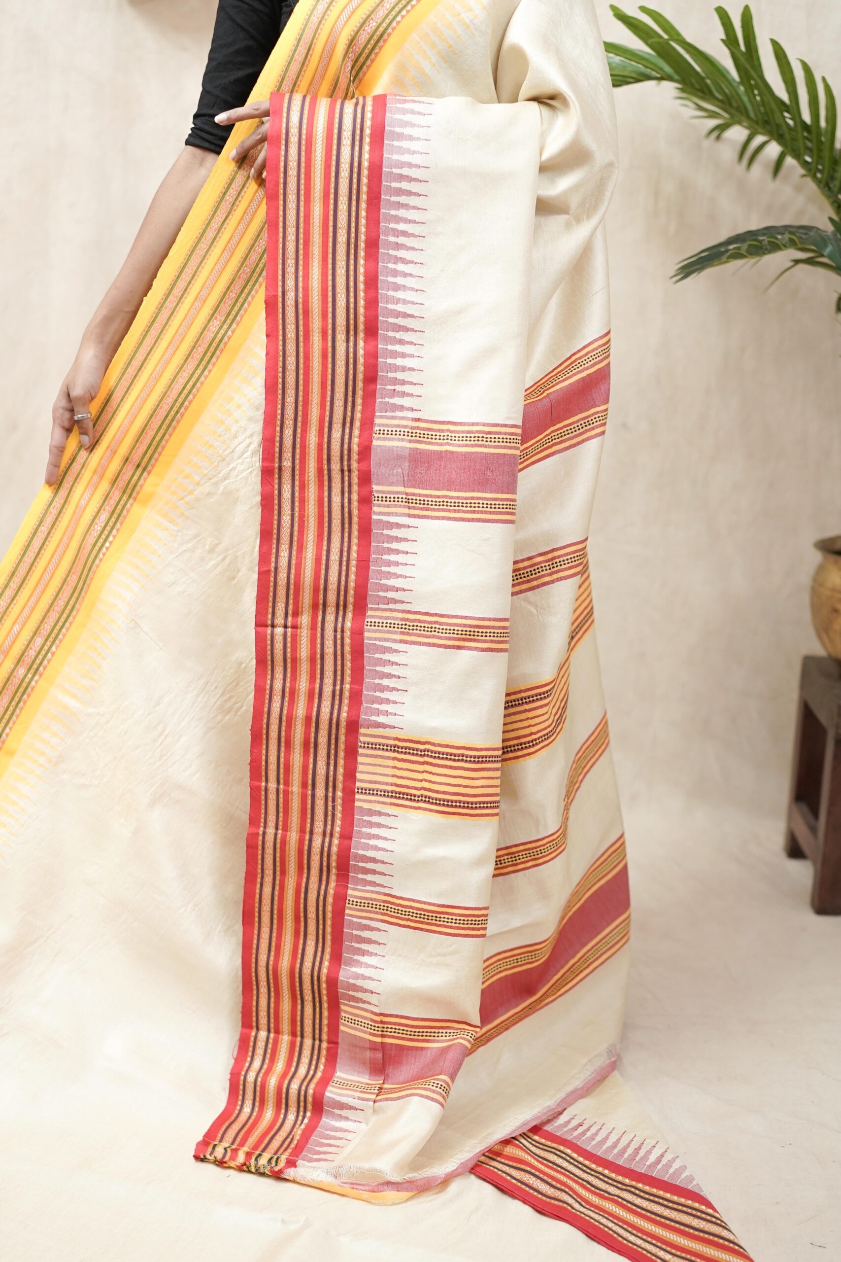 Indulge in the timeless beauty of our off-white Vidarbha tussar saree, this weave from Maharashtra is a fusion of tradition and artistry, woven from the finest tussar silk. Known for its natural sheen and rich texture, this weave carries an understated elegance, highlighted by the distinctive yellow-red Ganga Jamuna border in contrasting colors. A perfect choice for festive and formal occasions, it beautifully blends heritage with sophistication.