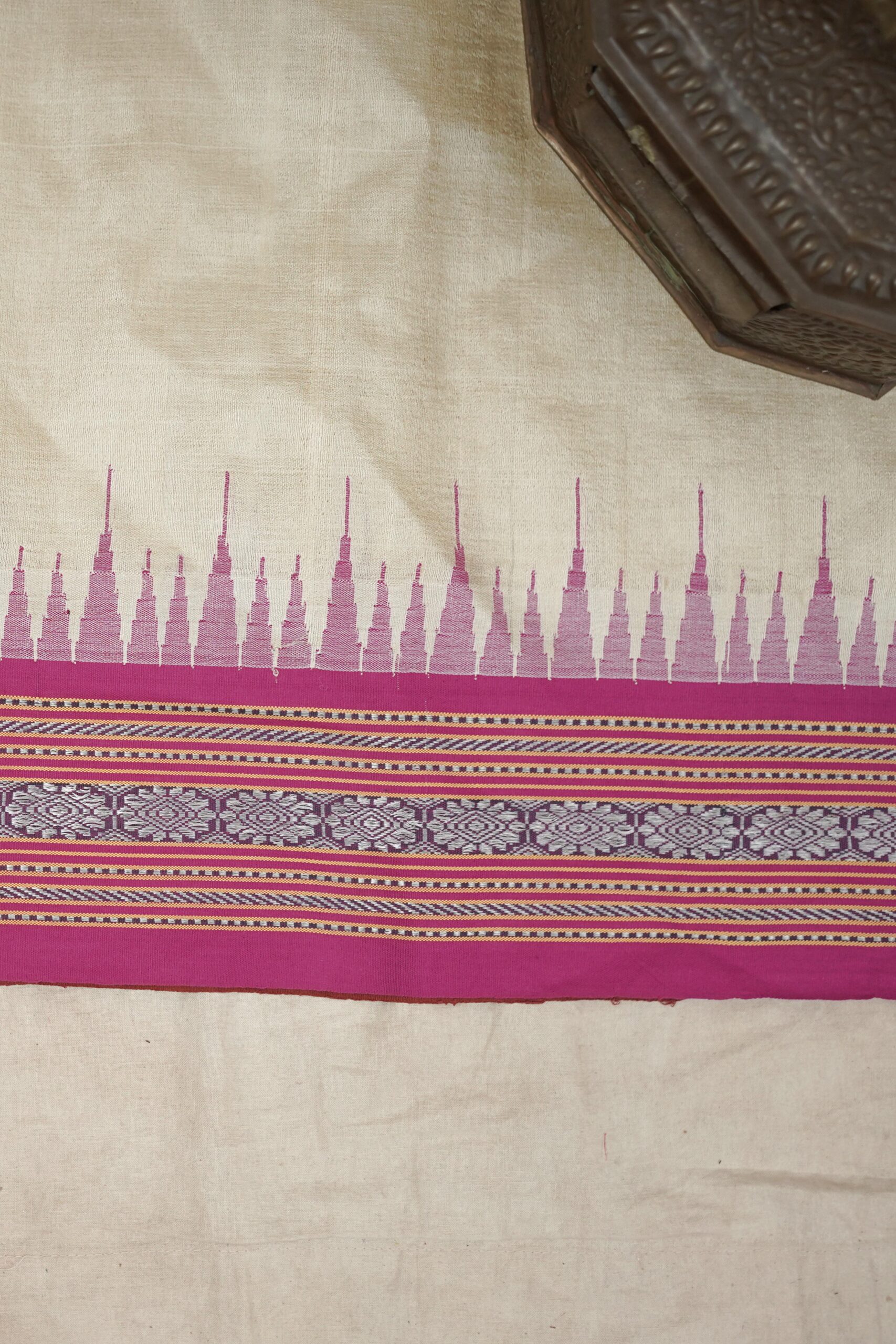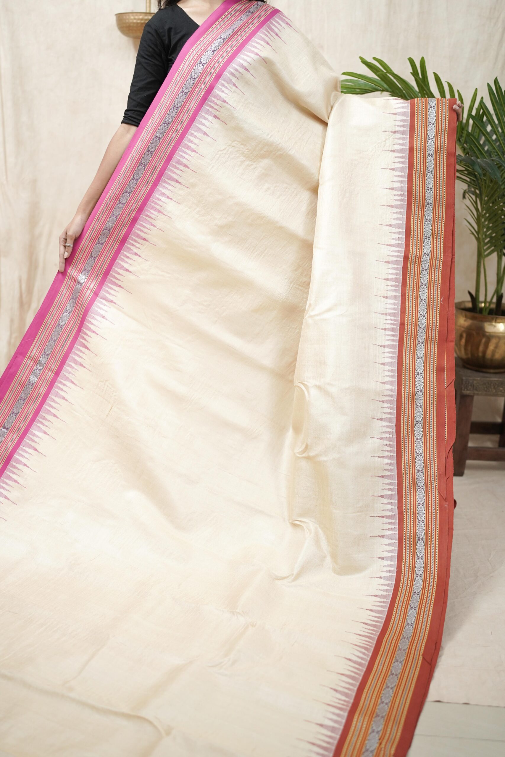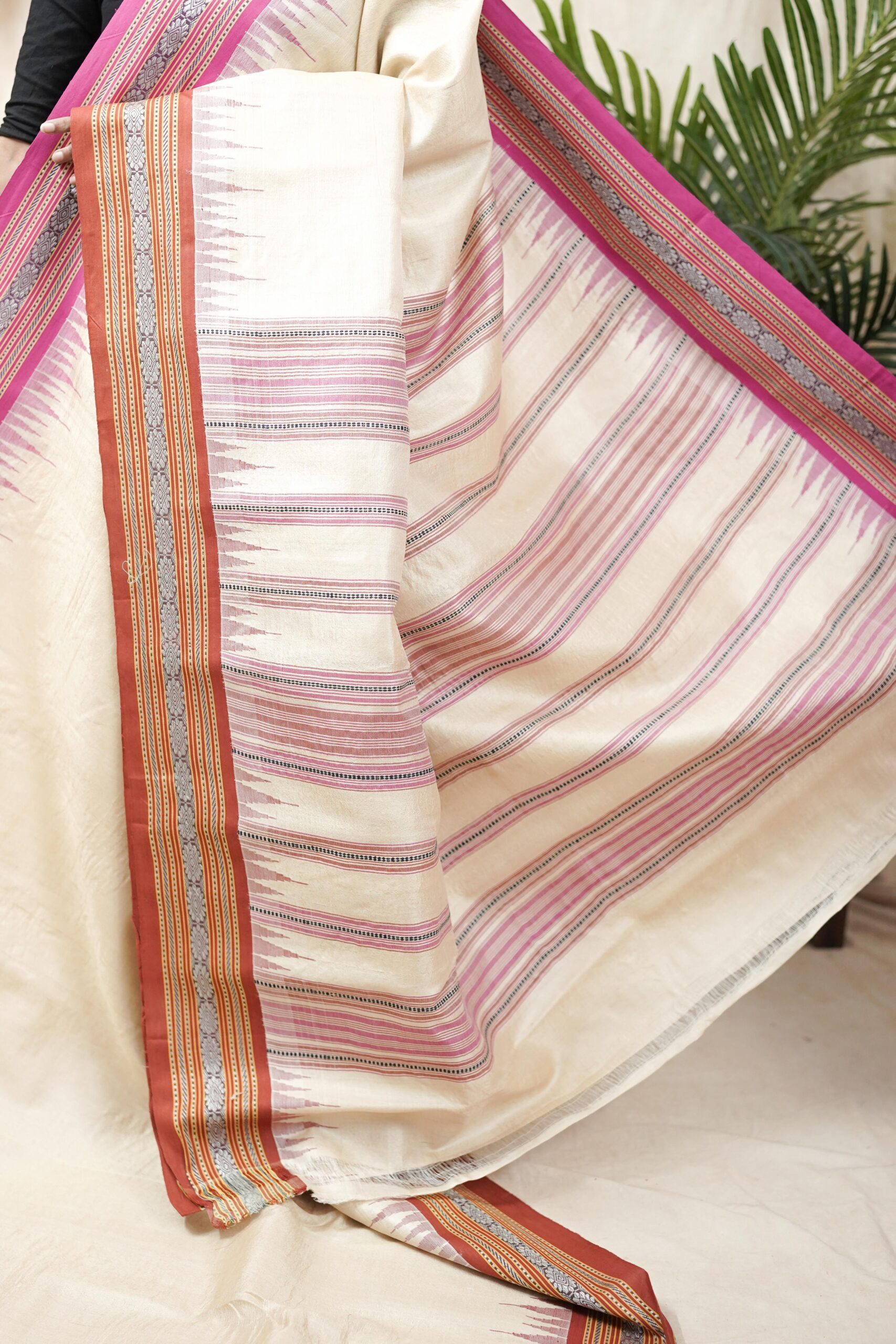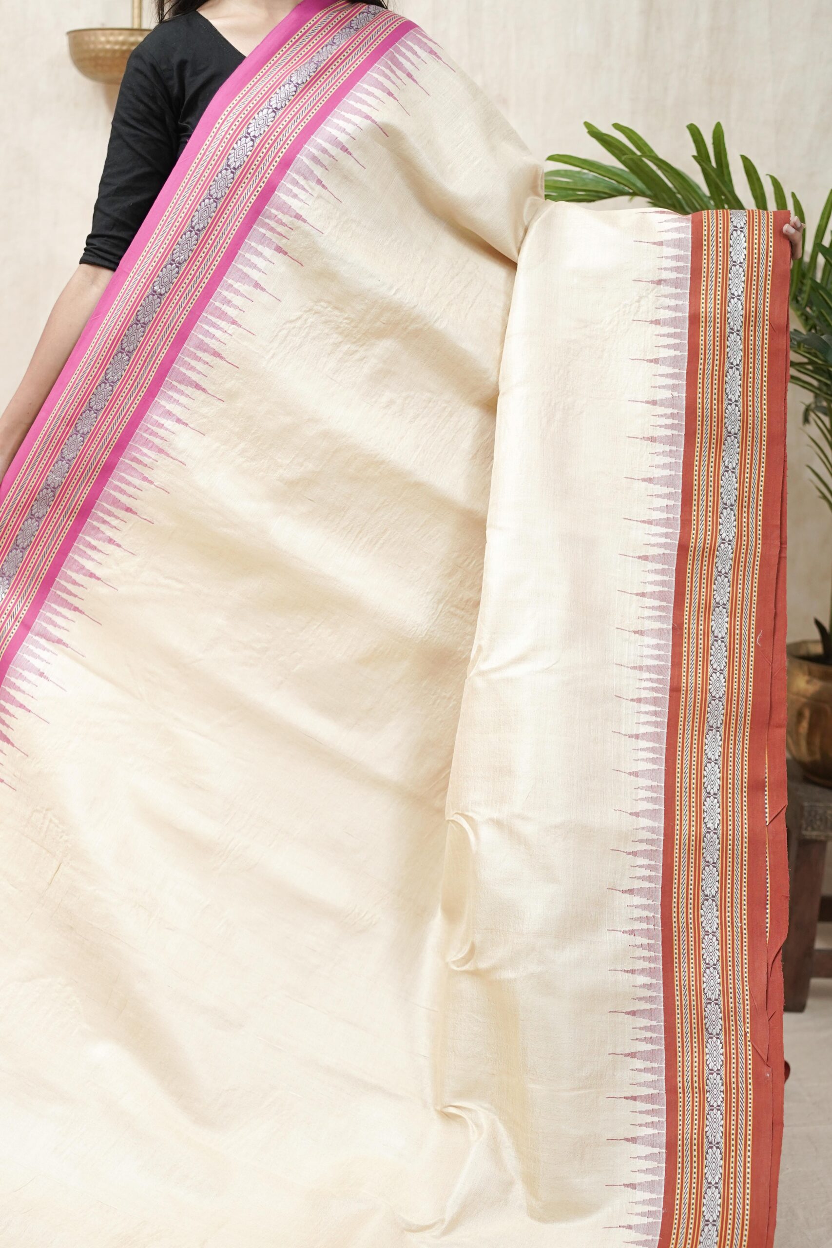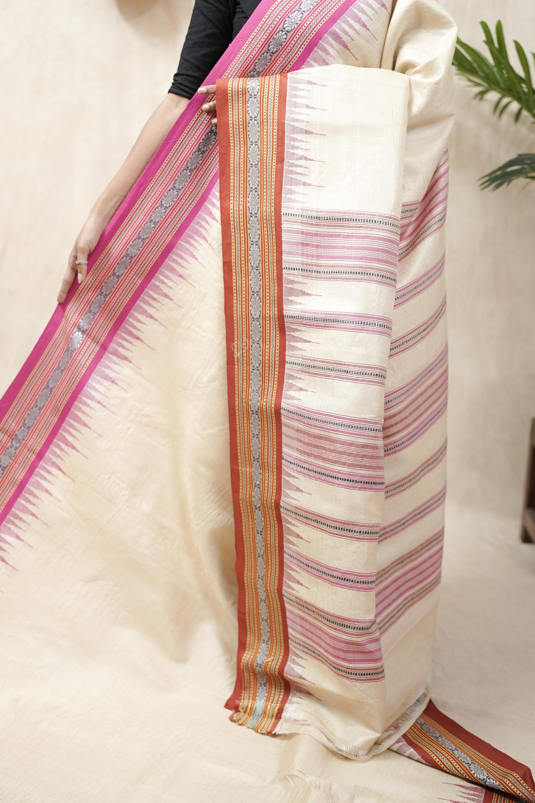 Indulge in the timeless beauty of our off-white Vidarbha tussar saree, this weave from Maharashtra is a fusion of tradition and artistry, woven from the finest tussar silk. Known for its natural sheen and rich texture, this weave carries an understated elegance, highlighted by the distinctive brown-pink Ganga Jamuna border in contrasting colors. A perfect choice for festive and formal occasions, it beautifully blends heritage with sophistication.