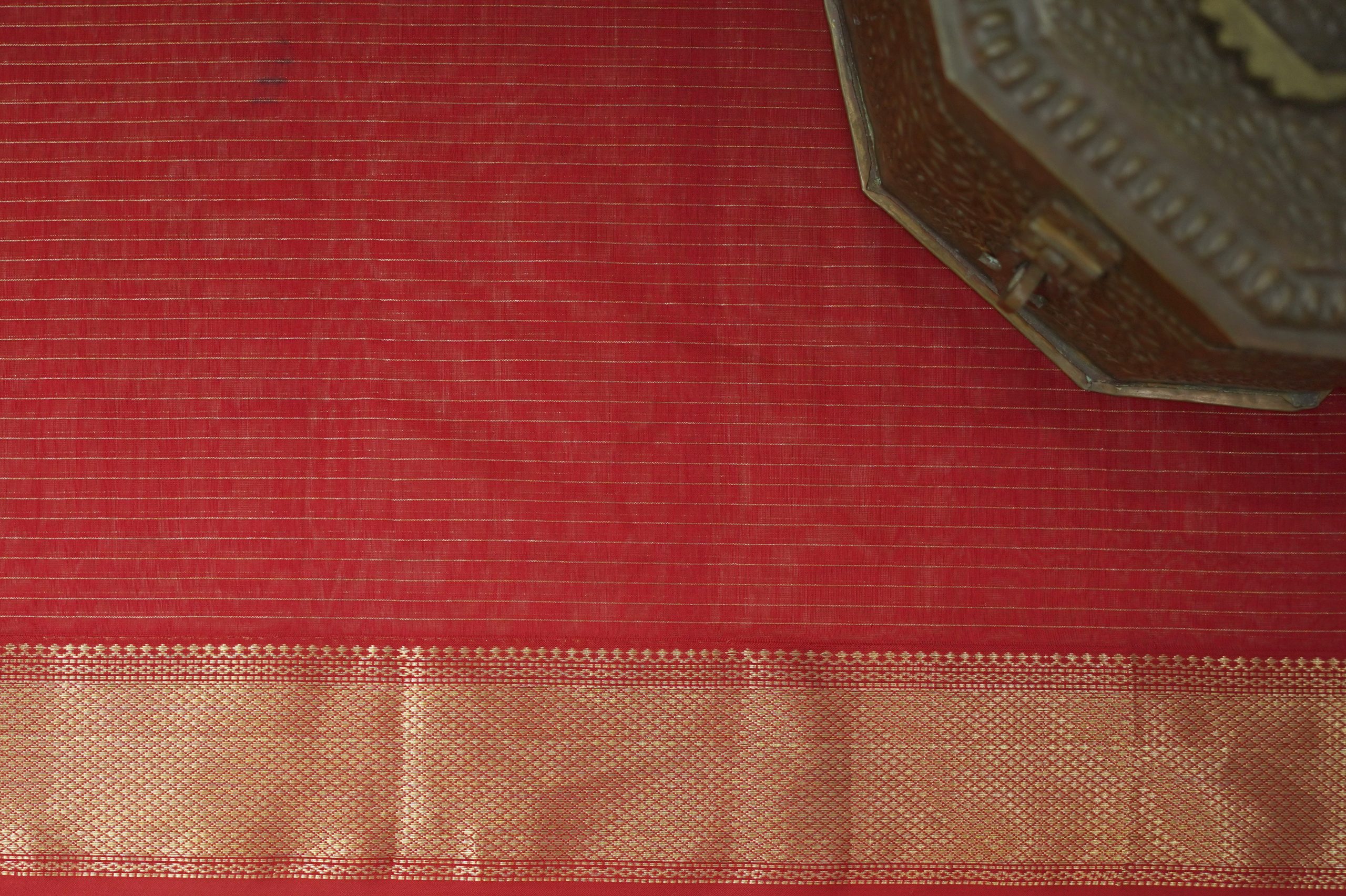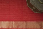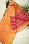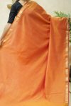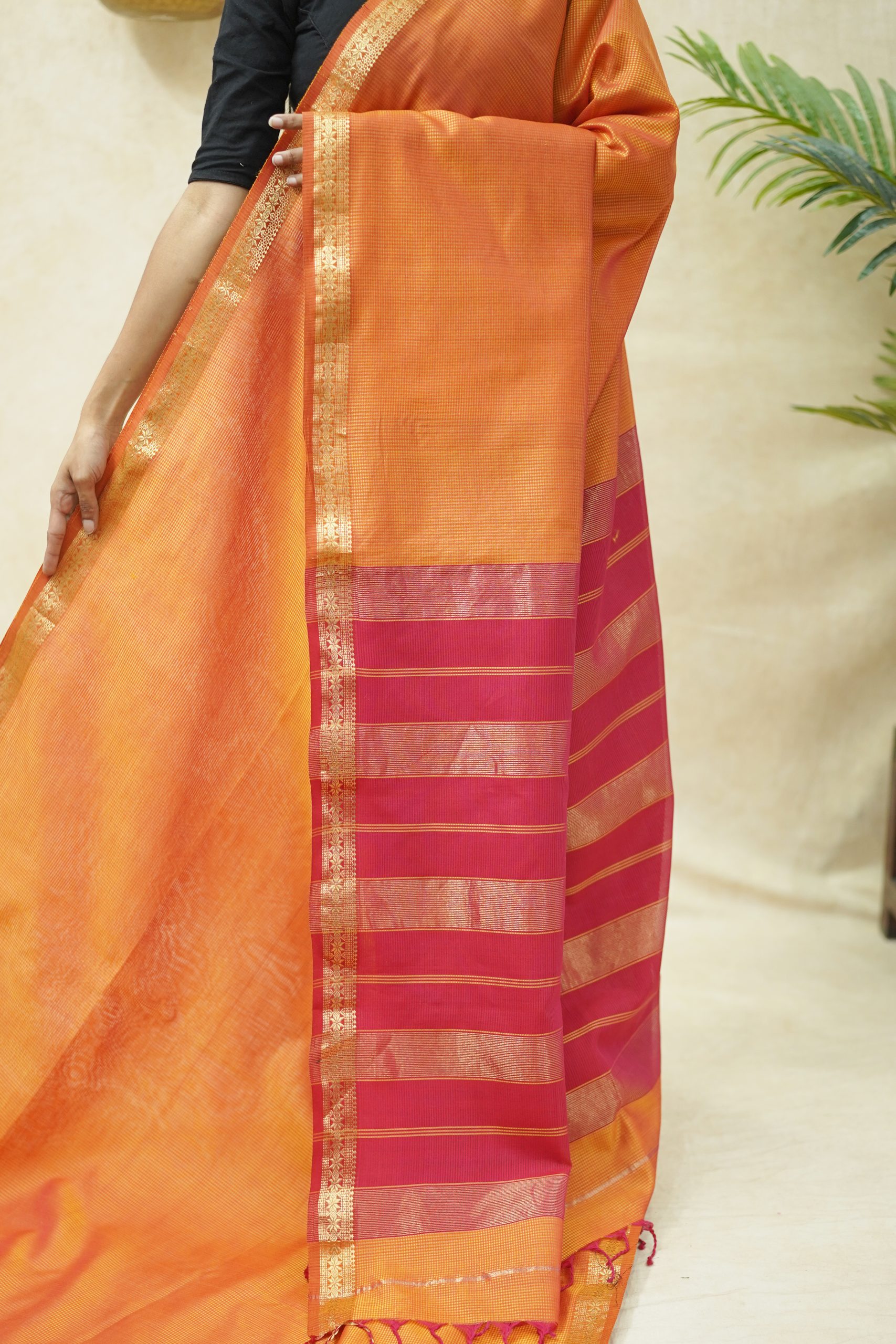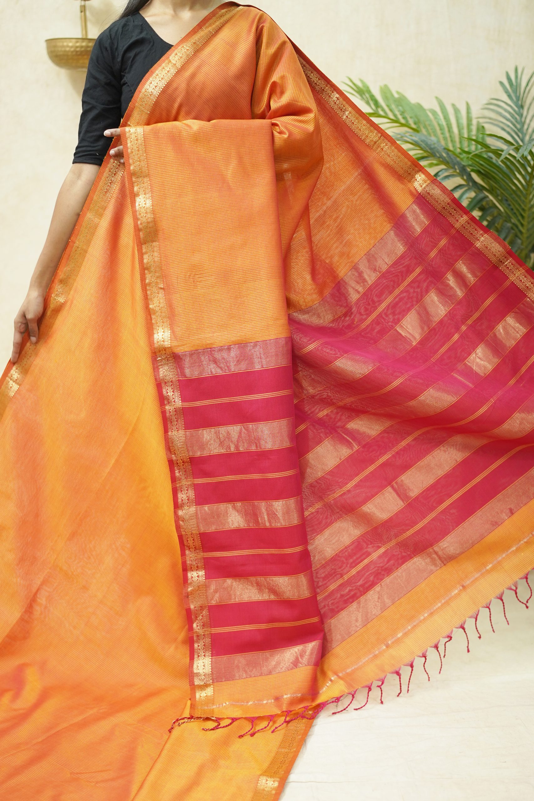 Elevate your ethnic wardrobe with our orange-golden dual tone Maheshwari sico saree, featuring fine woven textures, a classic golden zari border, and a striking striped golden zari palla in red colour. This saree blends traditional artistry with modern elegance, making it a perfect choice for festive occasions, weddings, and graceful celebrations.