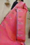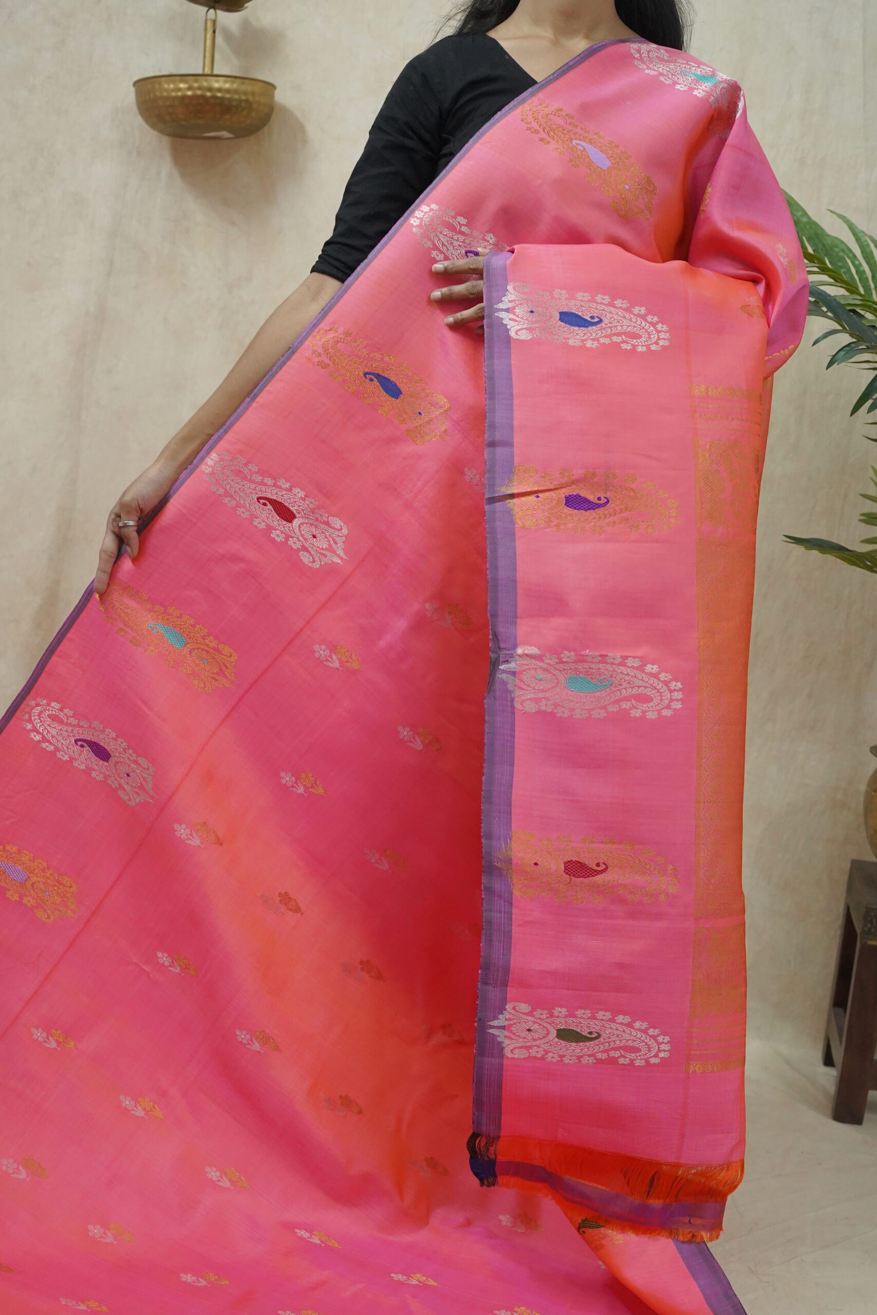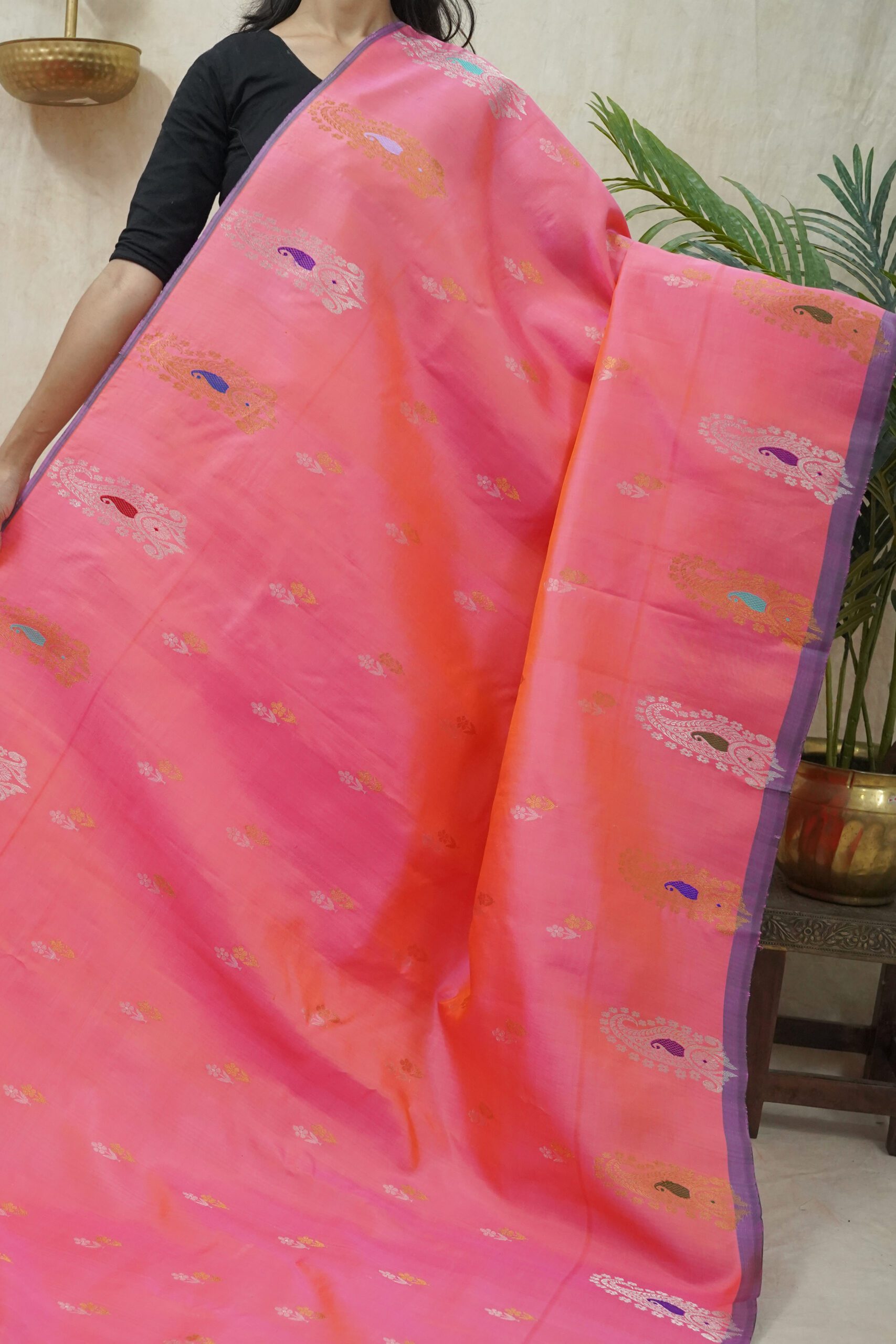 Indulge in the timeless beauty of orange-pink dual tone silk Gadwal saree, a graceful blend of tradition and elegance. Handwoven with pure mulberry silk, it features delicate buttas all across the body,enhanced by a vibrant yellow border. Perfect for weddings, festive occasions, and cultural celebrations.