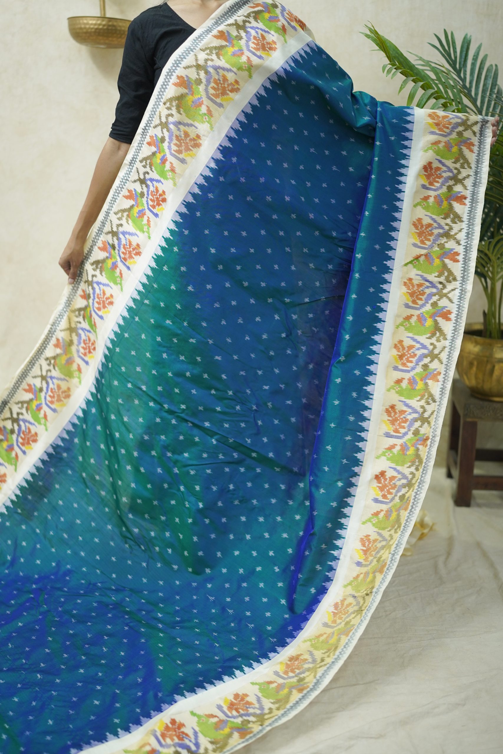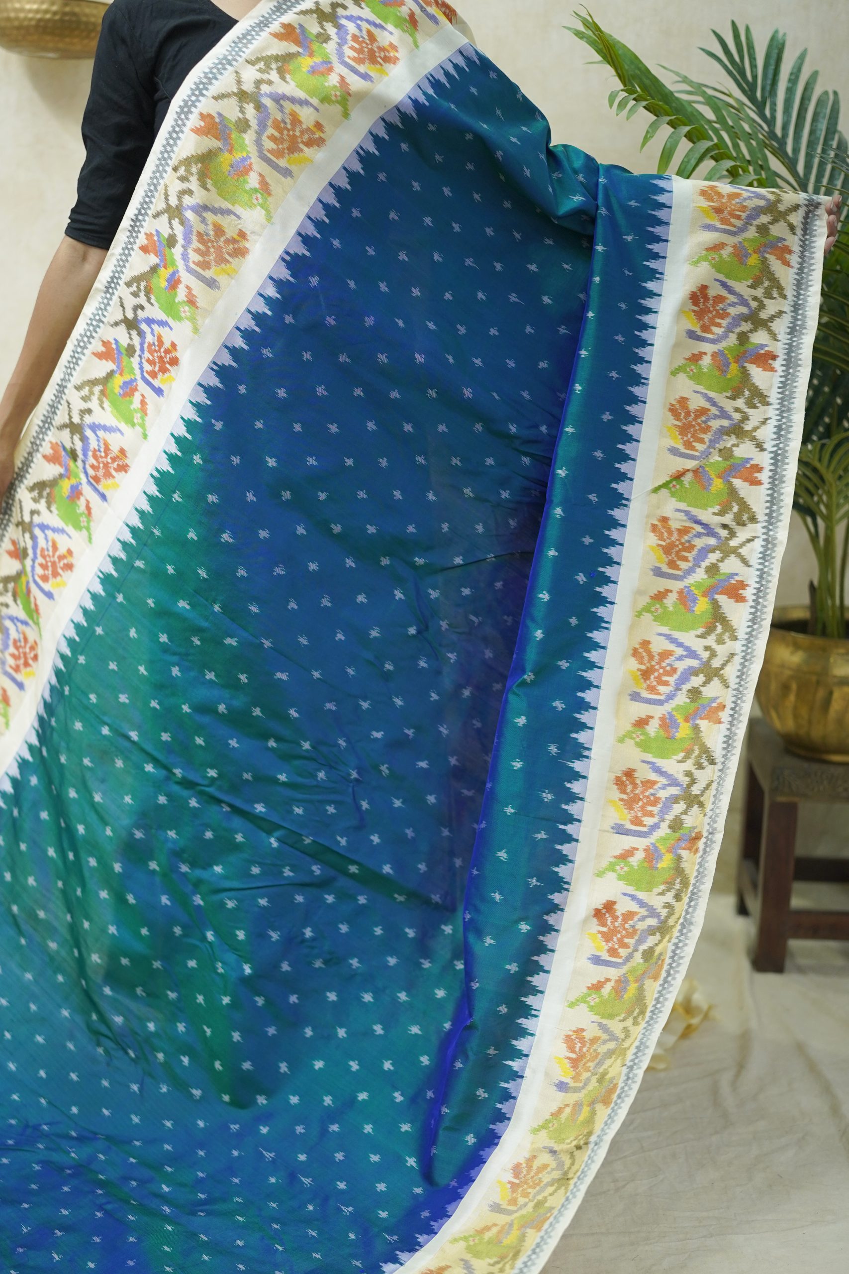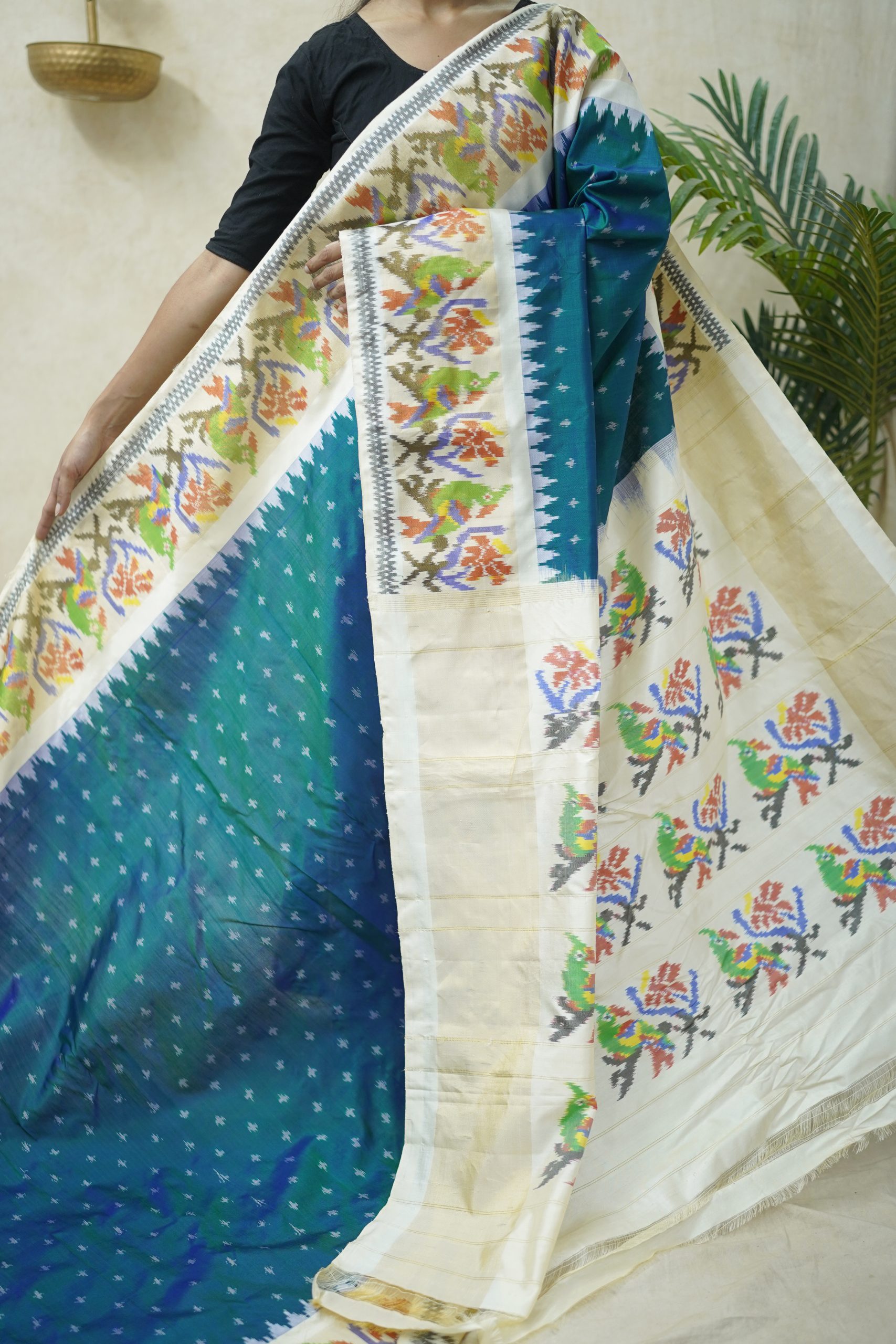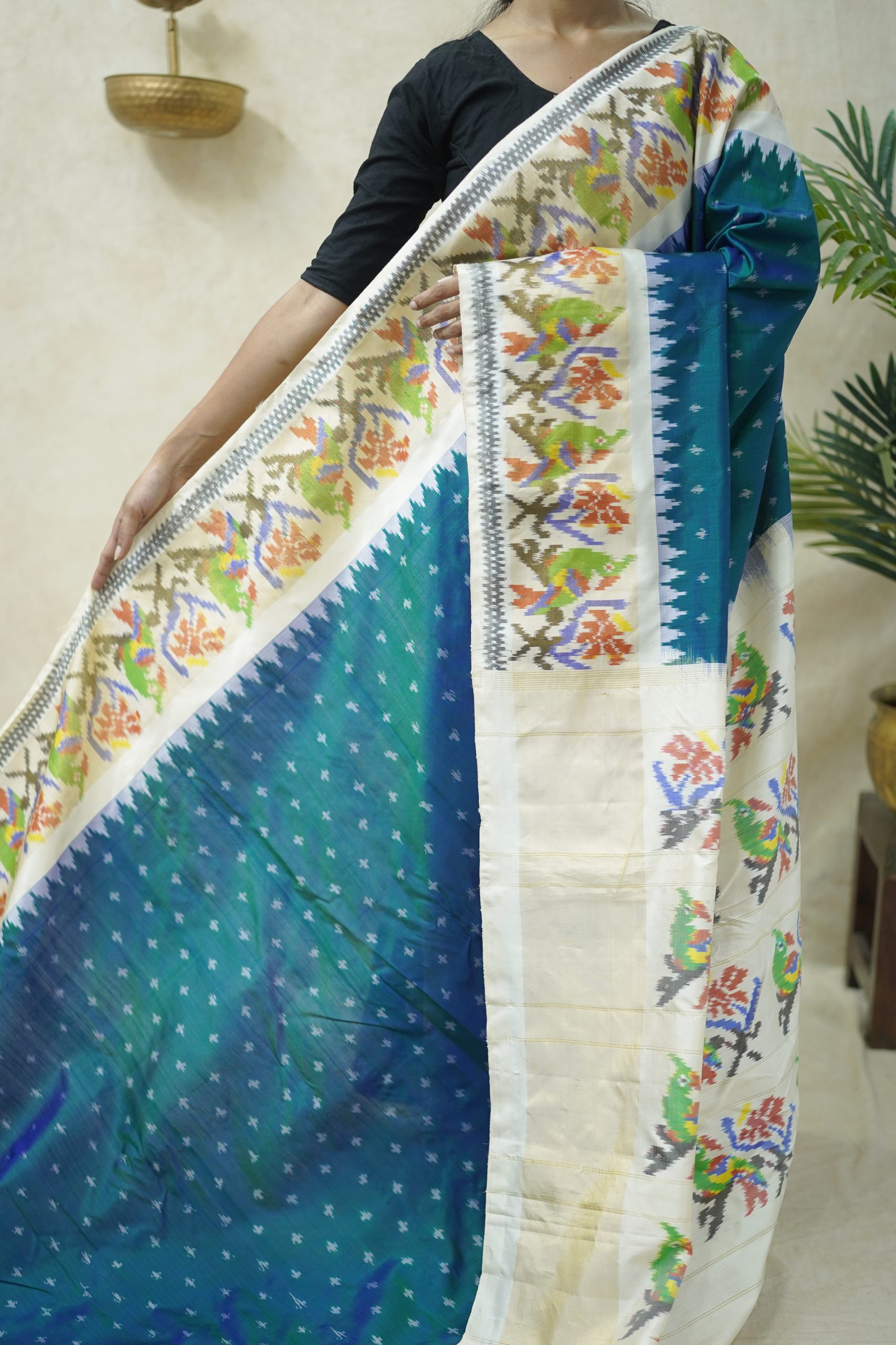 Add a touch of elegance to your ethnic wardrobe with our peacock blue handwoven Pochampally silk saree, featuring ikkat-inspired motifs on the body. The highlight of this saree is the striking cream coloured border with vibrant multicolor bird motifs that add a regal touch. Perfect for any occasion, it beautifully blends tradition with modern charm.