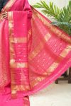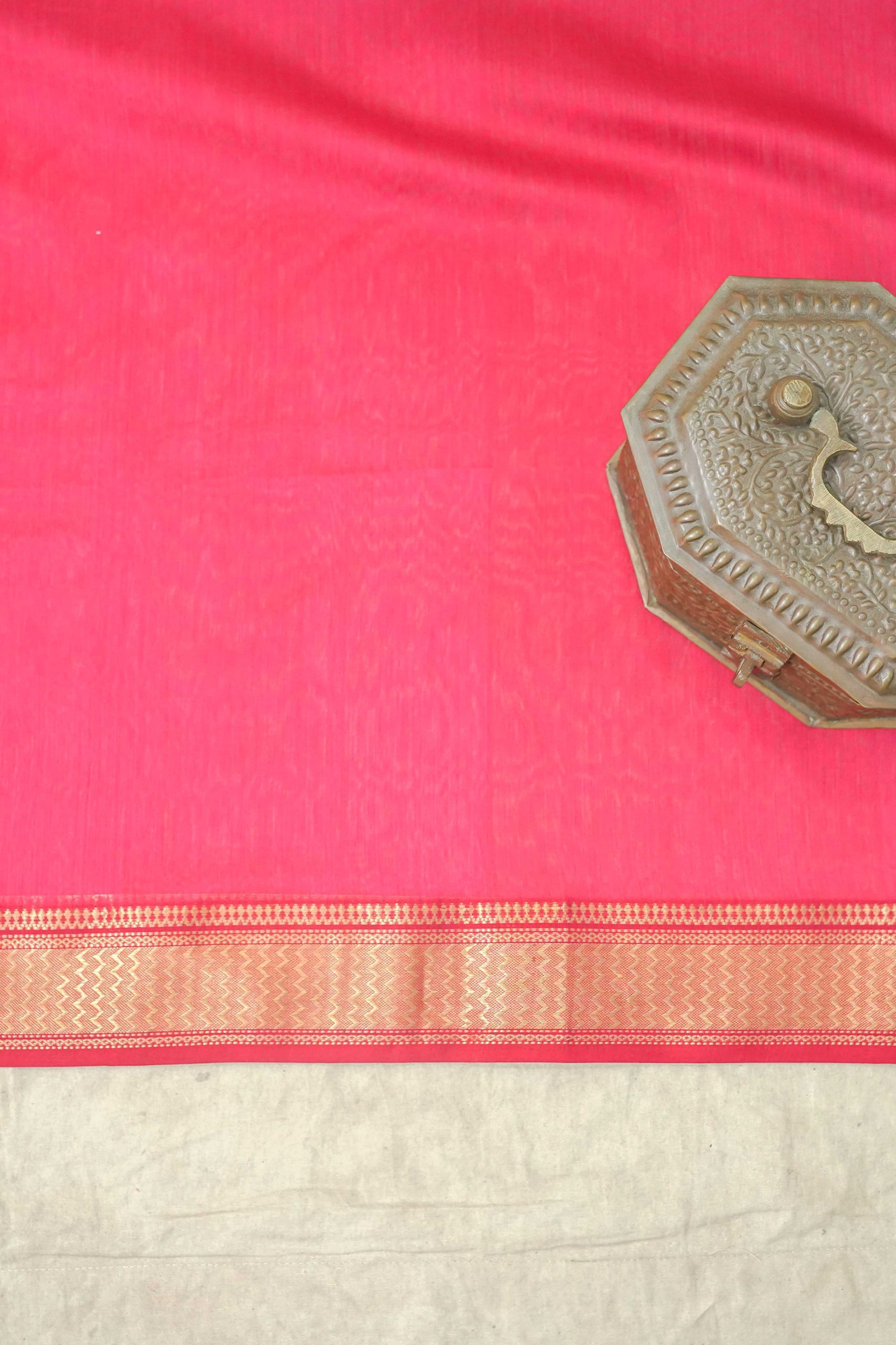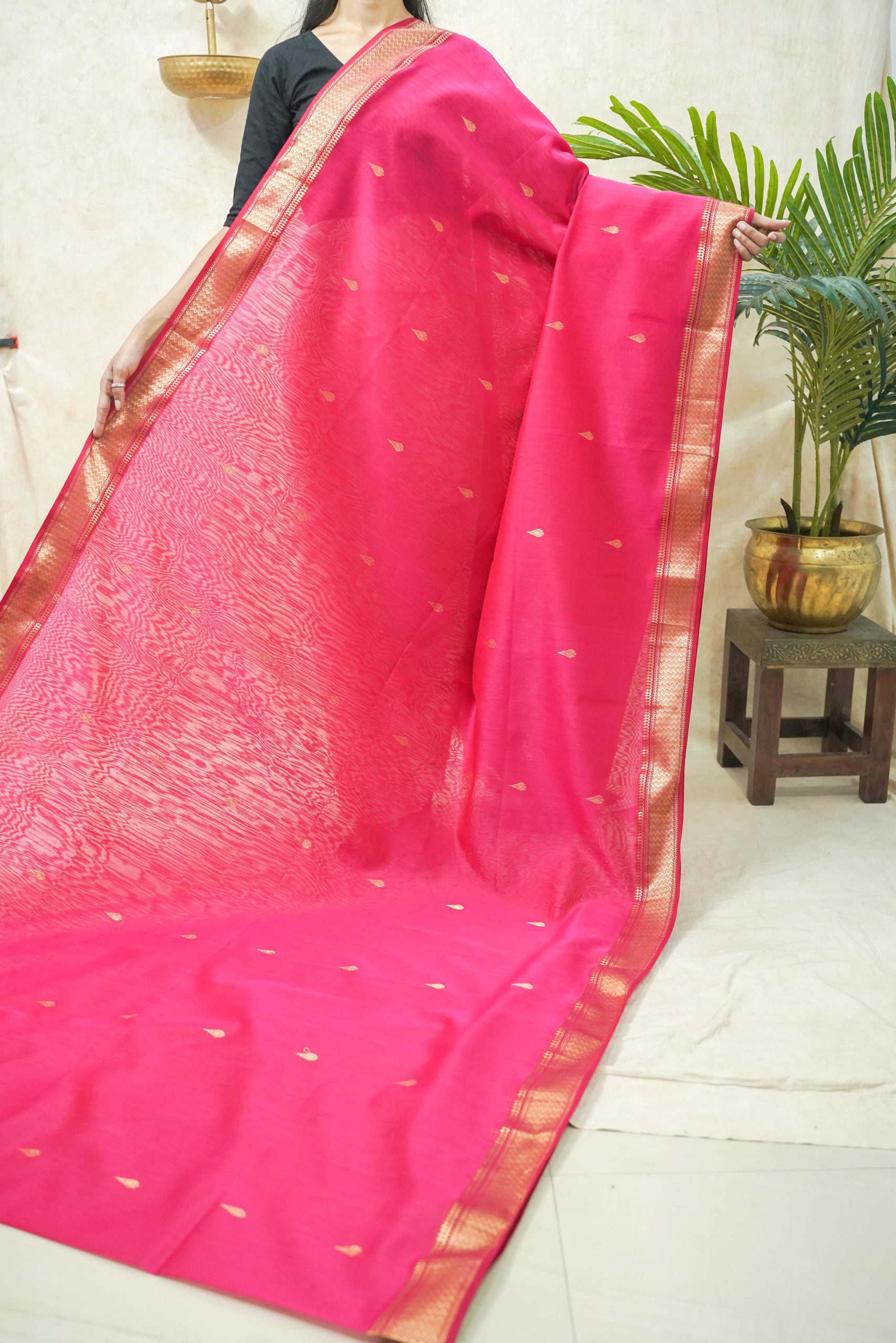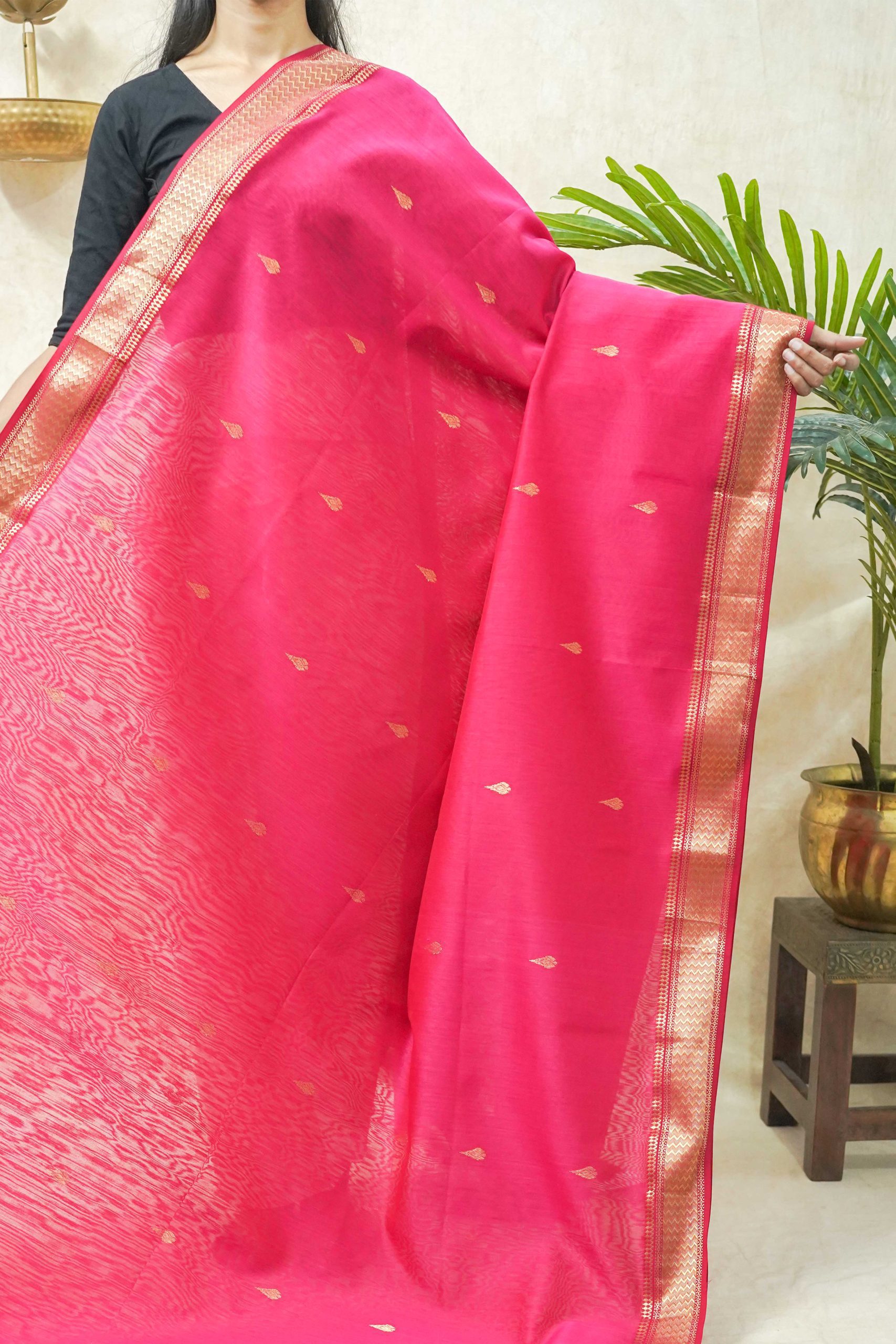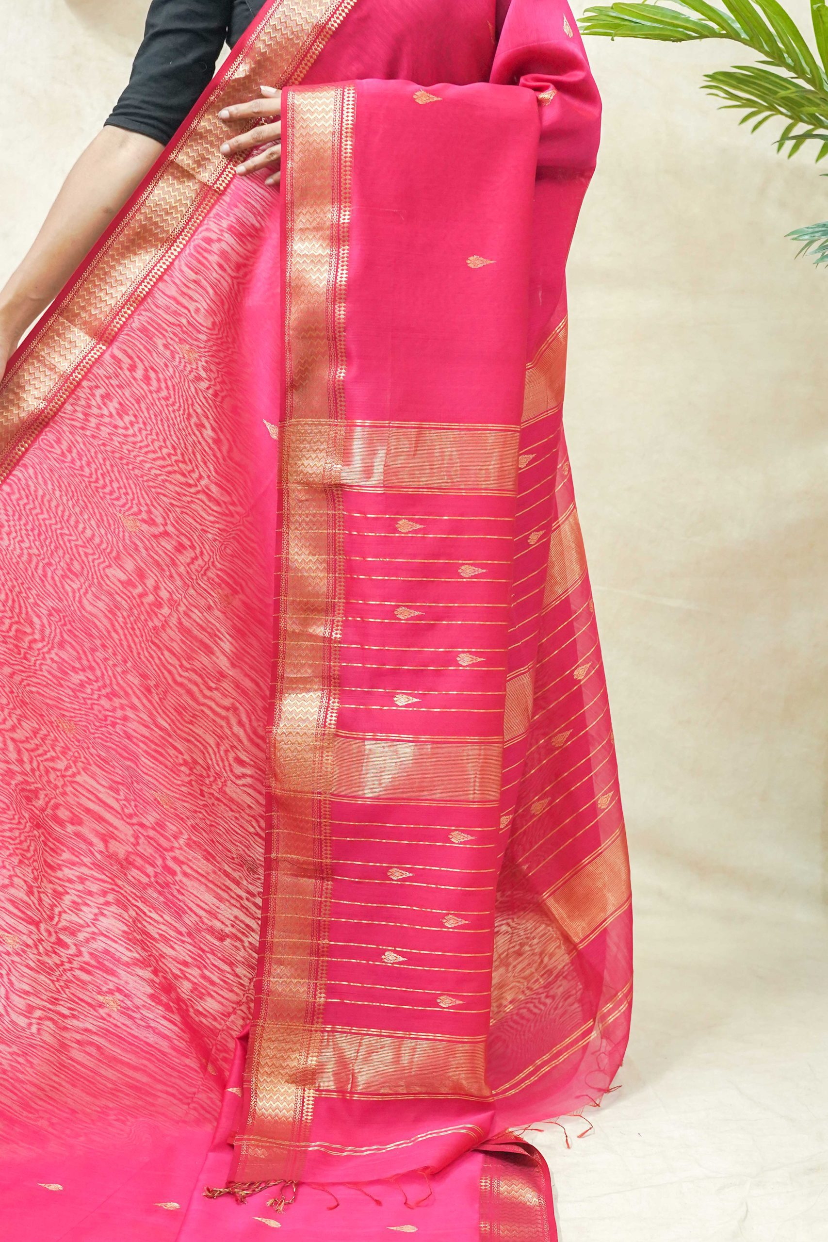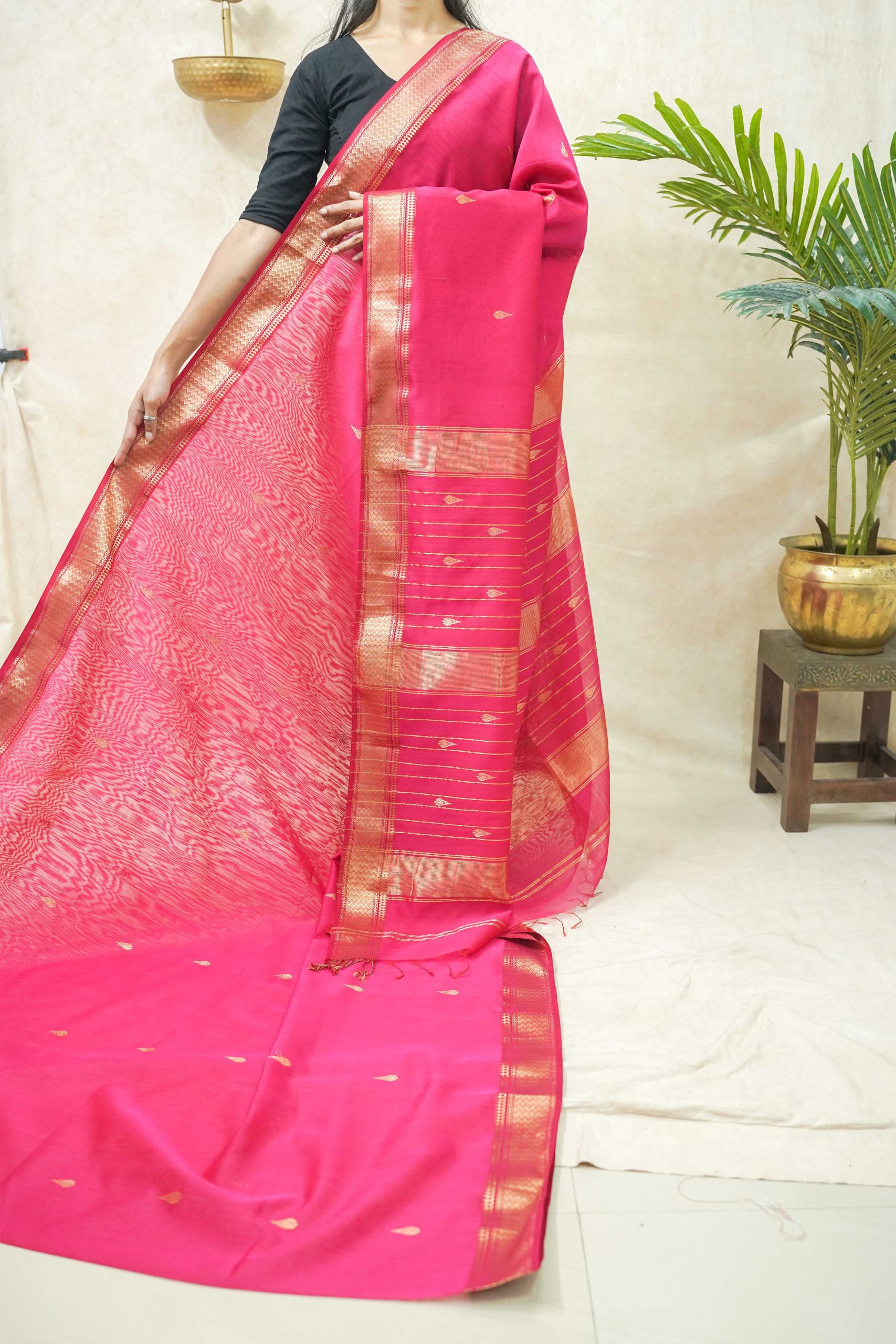 Elevate your ethnic wardrobe with our rani pink Maheshwari Sico Saree, featuring intricate small butas, a classic in Narmada border in golden zari, and a striking golden zari palla. This saree blends traditional artistry with modern elegance, perfect for any special occasion.