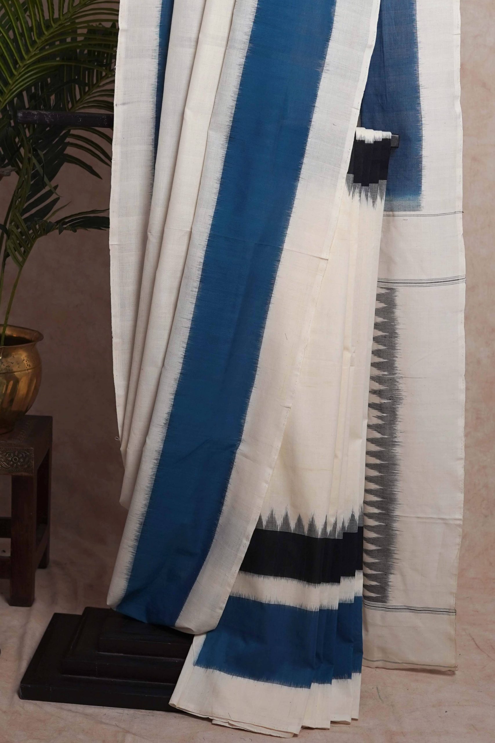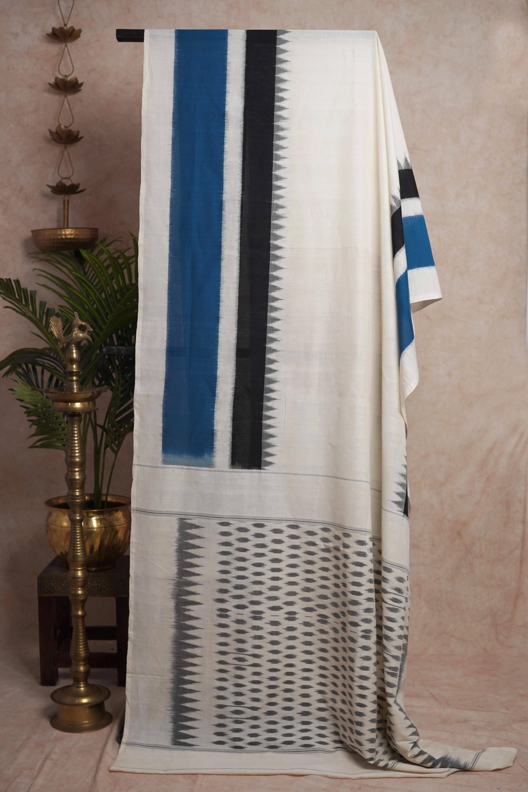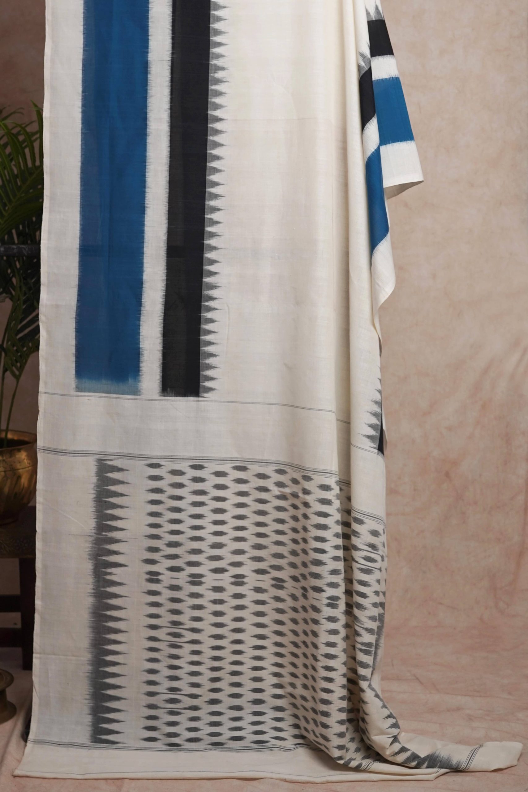Enhance your ethnic collection with our stunning cotton Pochampally saree, featuring a off-white body adorned with intricate ikat motifs for a captivating visual appeal. The matching or contrasting black & blue border adds a refined touch, perfectly framing the design and ensuring a seamless finish.