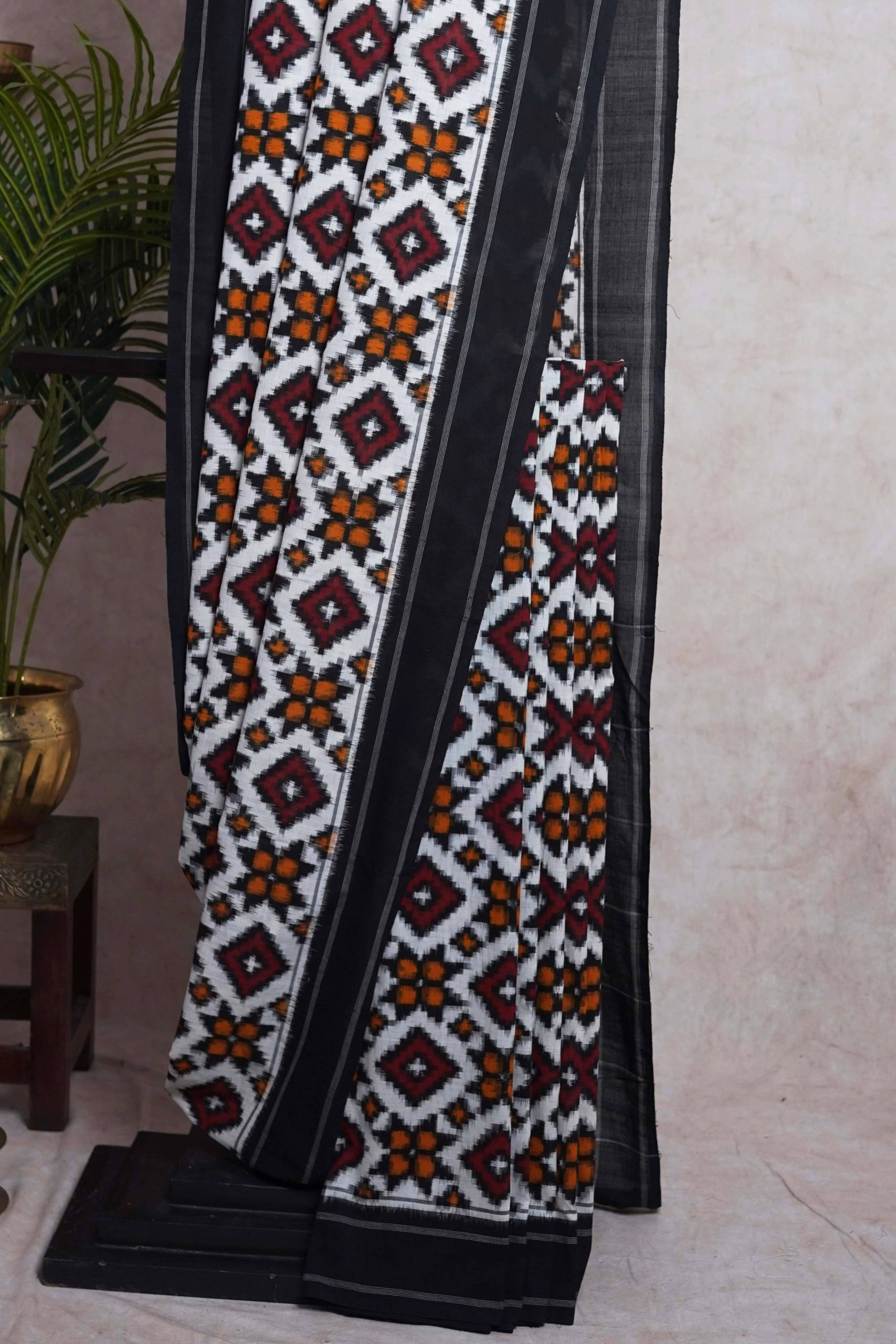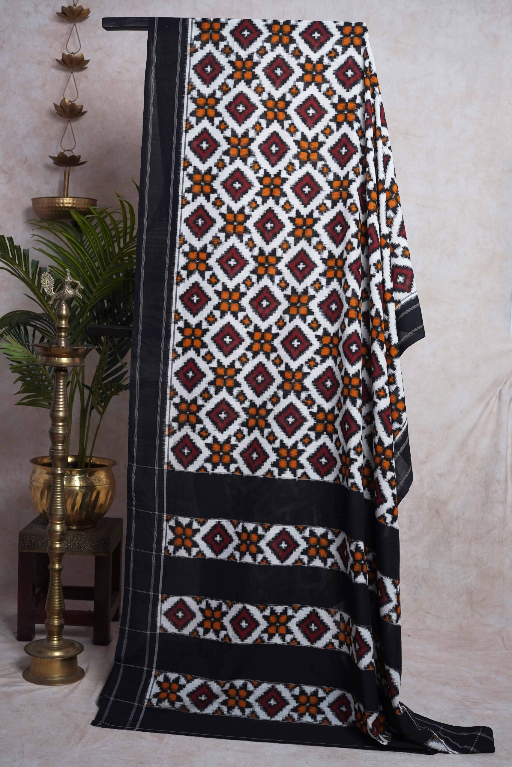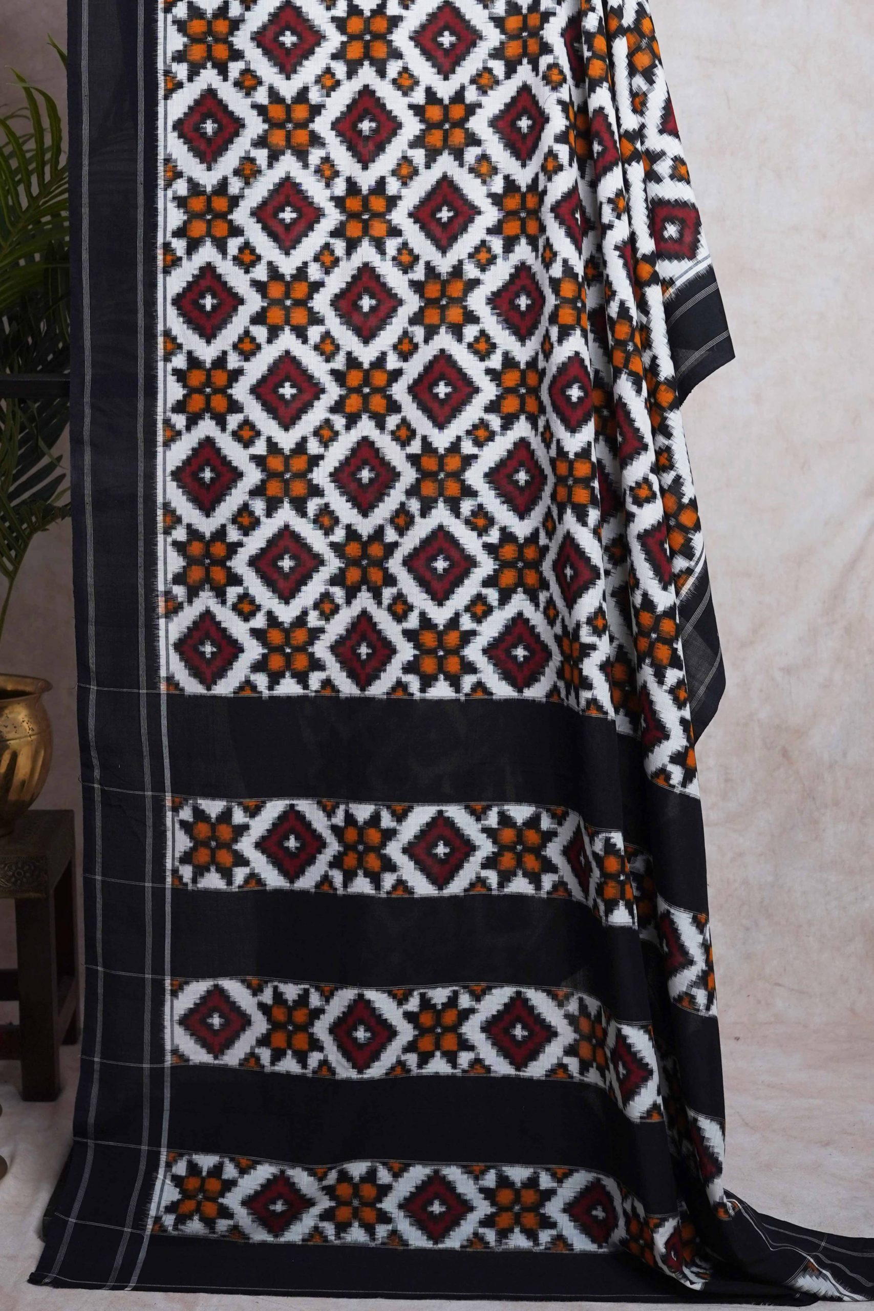 Elevate your ethnic wardrobe with our beautiful handwoven double ikkat cotton Pochampally saree with Telia Rumal innspired motifs.The features intricate geometric patterns in the vibrant colourrs on an off white base.The black border frames the design beautifully.