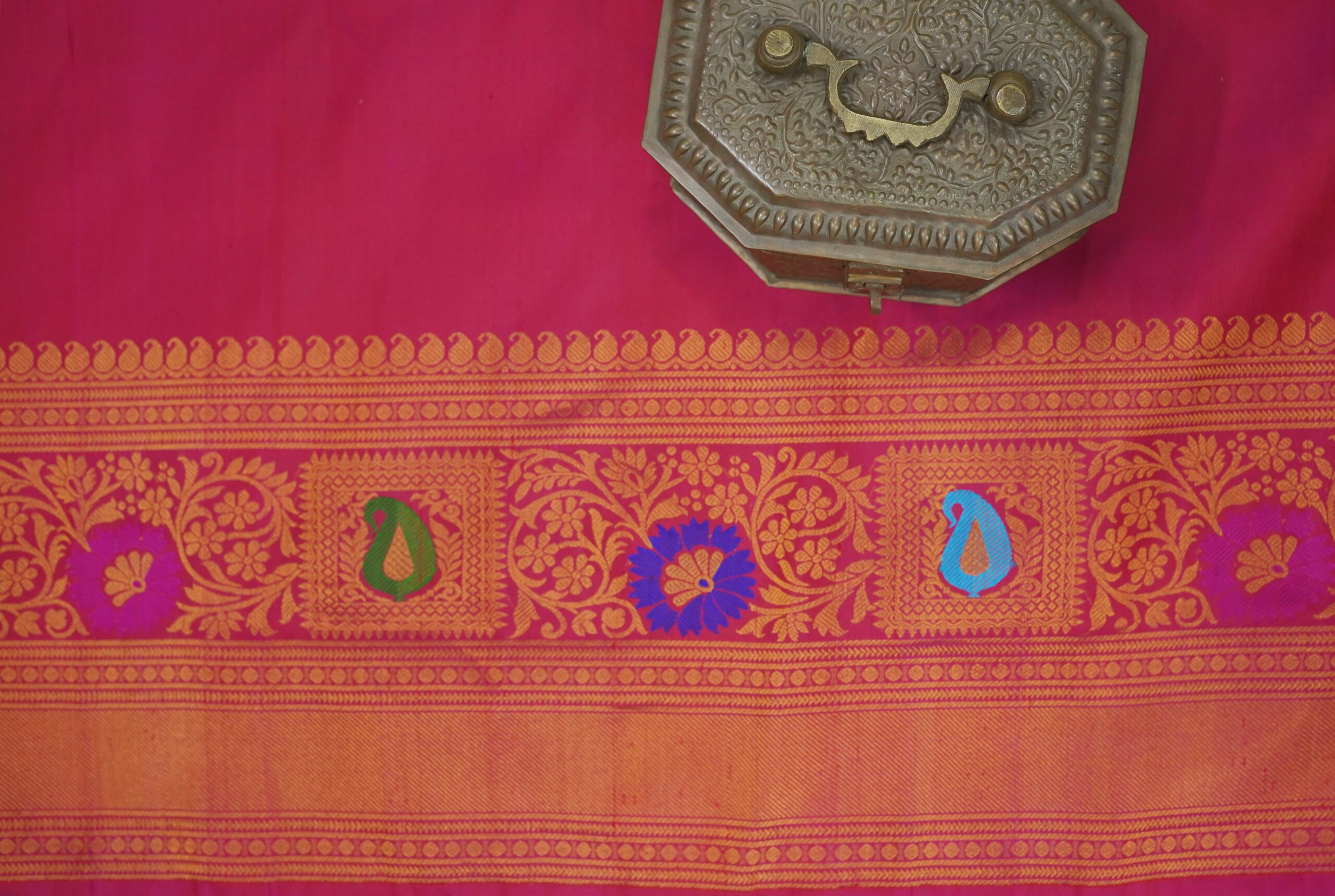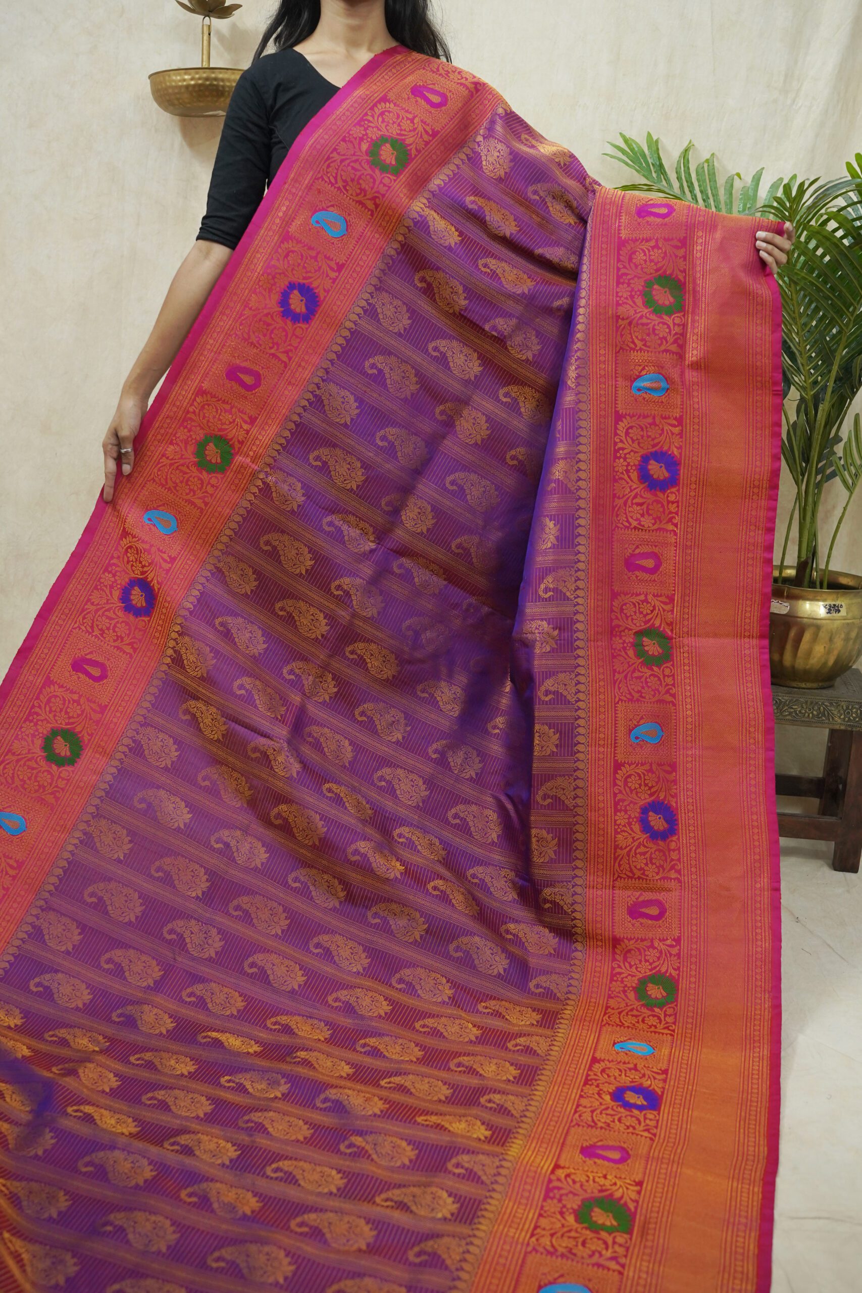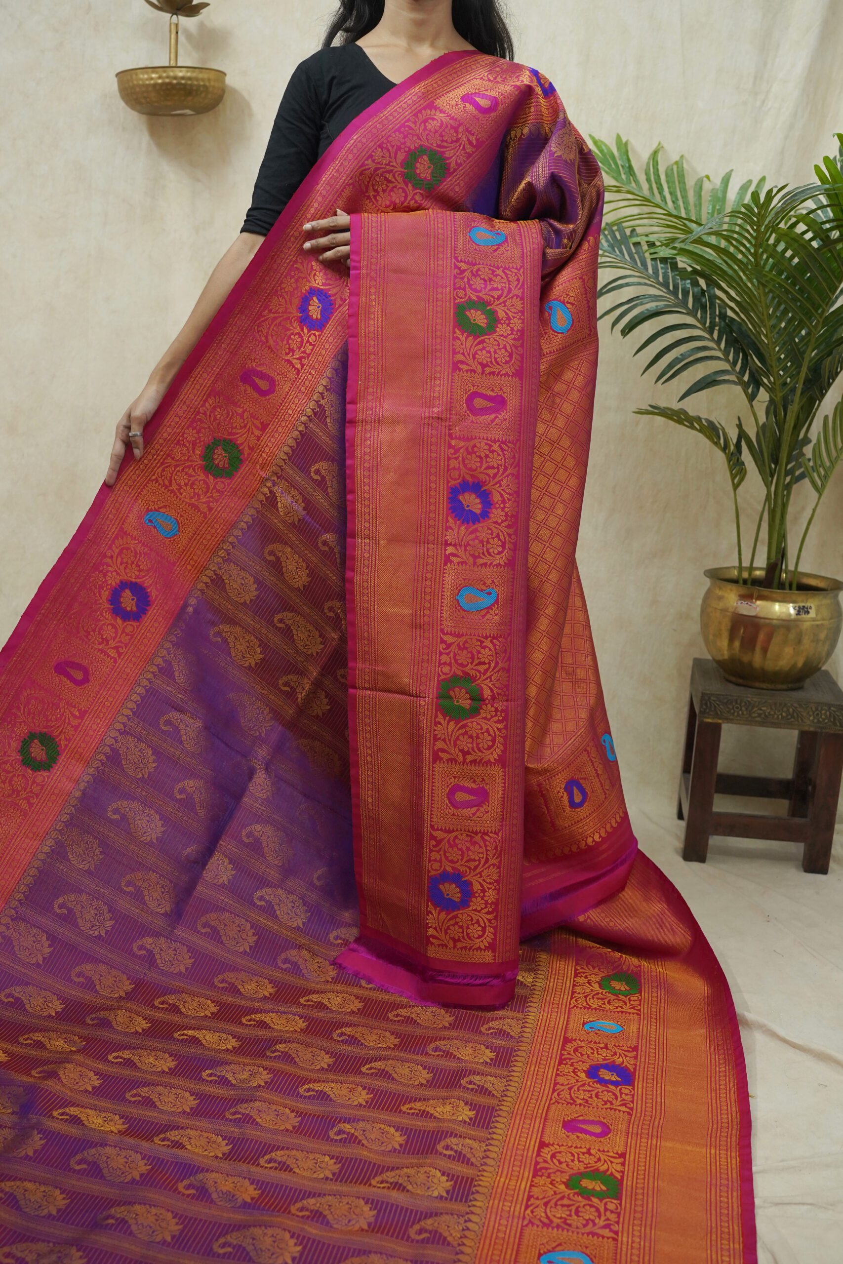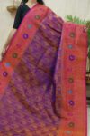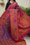 Indulge in the timeless beauty of purple silk Gadwal Saree,a graceful blend of tradition and elegance. Handwoven with pure mulberry silk, it features intricate motifs in golden zari on the purple body, enhanced by rich golden zari with floral designs on the pink border. Perfect for weddings, festive occasions, and cultural celebrations.