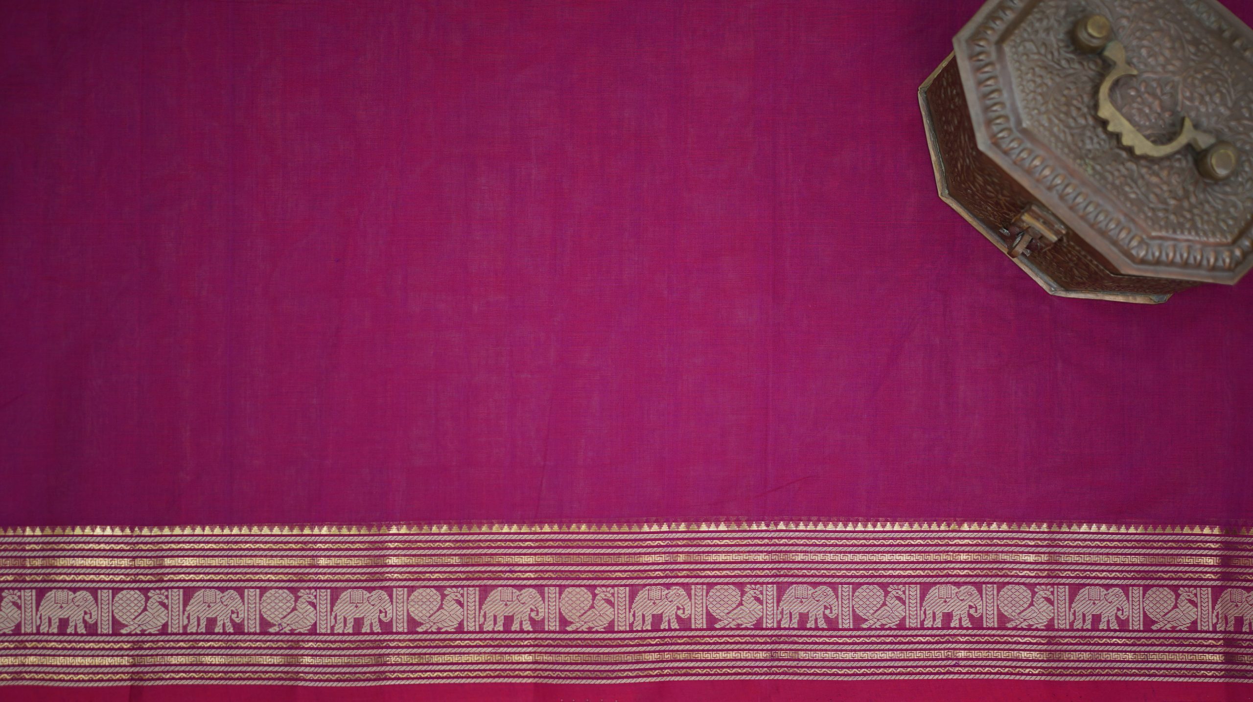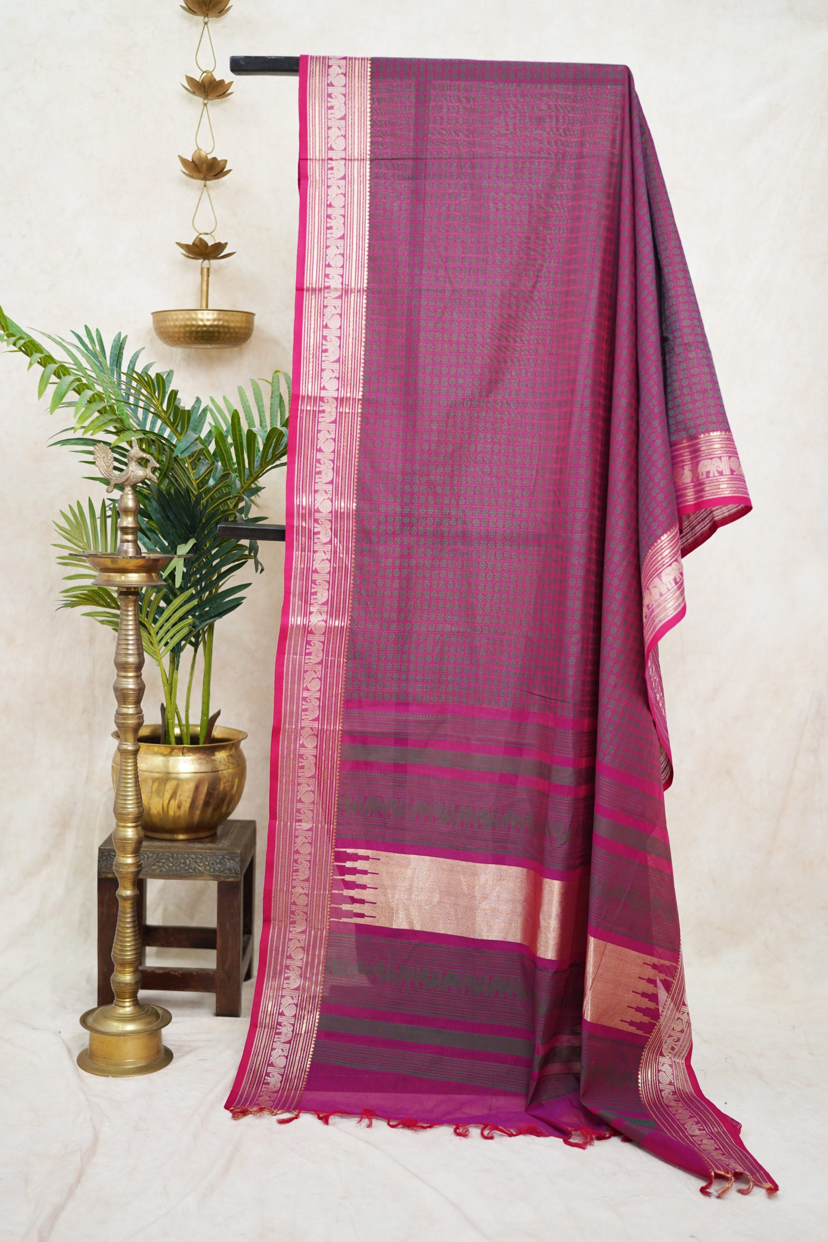 Enhance your ethnic ensemble with our dark purple Kanchipuram cotton saree, featuring intricate 20,000 butas all across with a striking and traditional zari work border. Perfect for any special occasion, this saree combines traditional artistry with modern elegance.