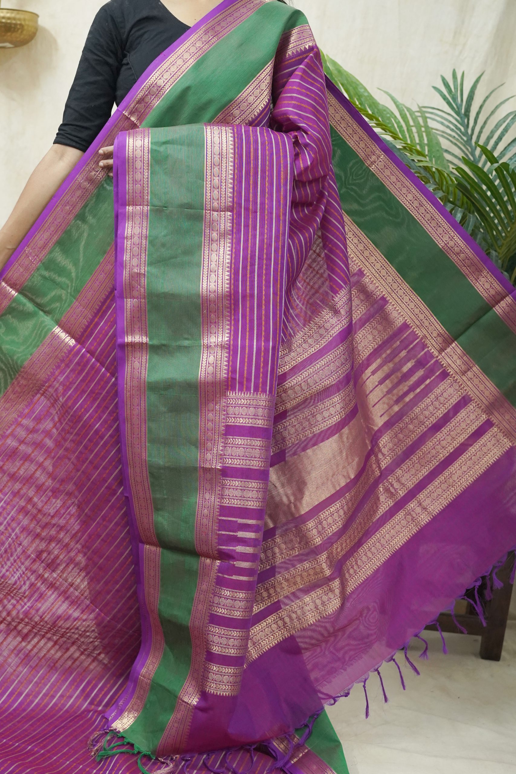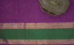 Step into the limelight with our exquisite purple Kanchipuram sico saree, featuring a harmonious blend of thread work and zari work. The vibrant green border with golden zari provides a striking contrast, enhancing the overall appeal and adding a touch of festive charm. The pallu is embellished with elaborate zari work, ensuring that the saree radiates opulence and makes a lasting impression.