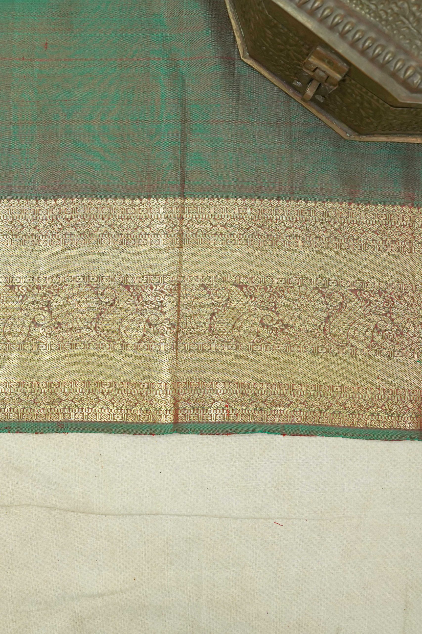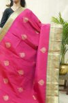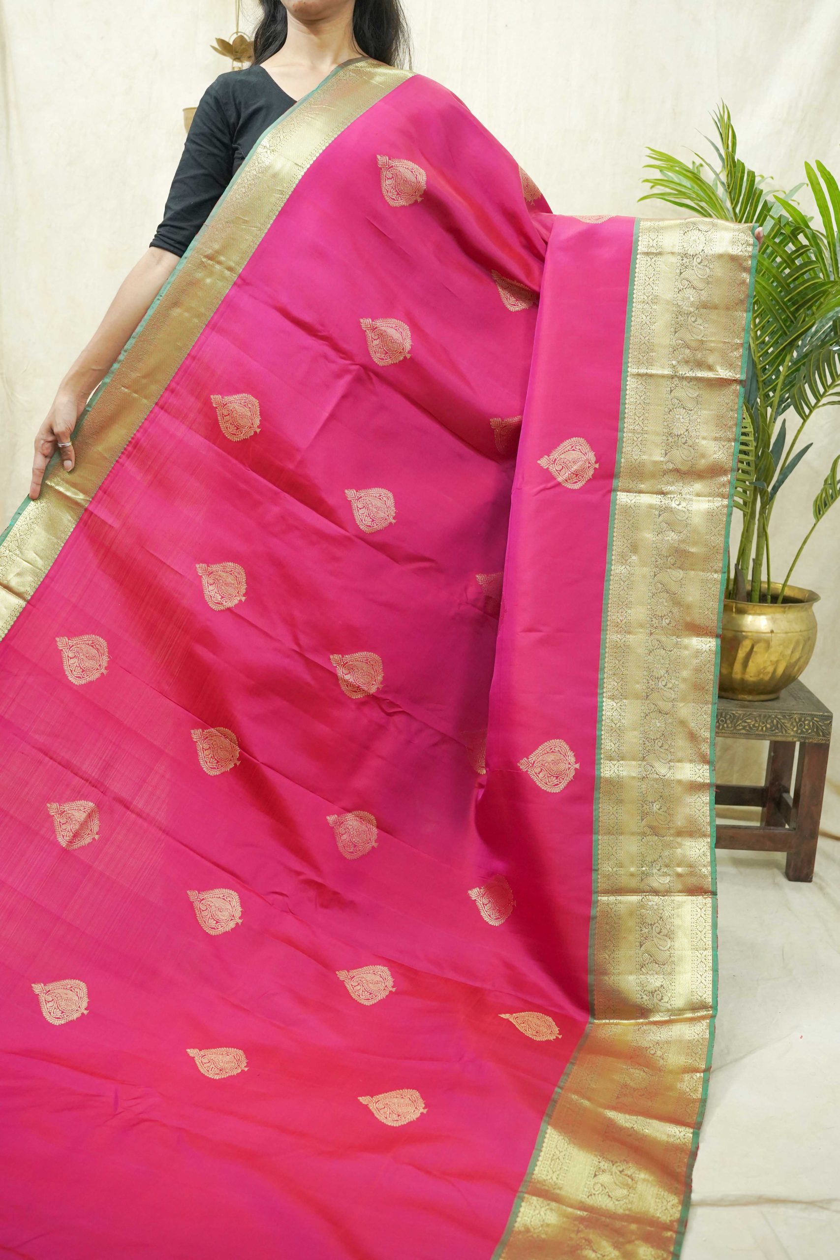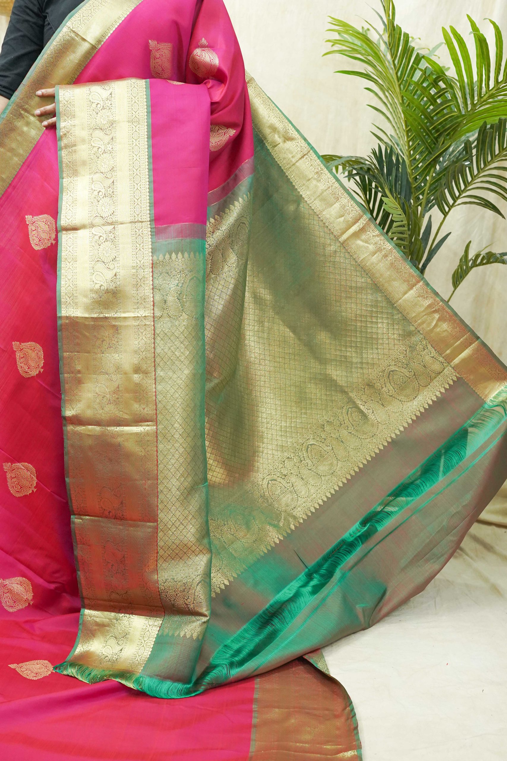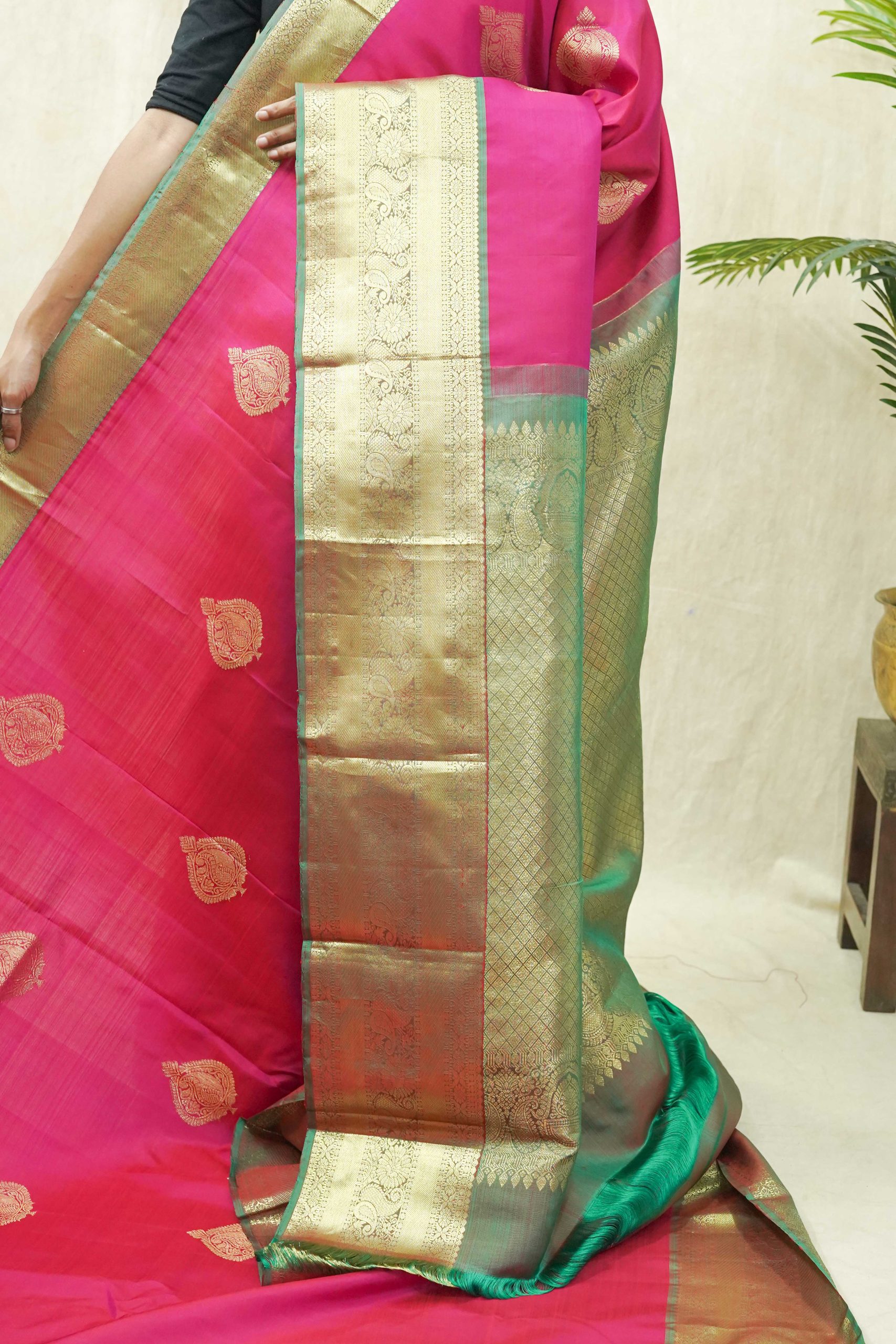 Our exquisite rani pink Kanjeevaram silk saree is designed with big motifs in golden zari all across the body . The pallu is adorned with intricate zari work, adding a unique and charming touch. The green coloured palla adds a striking contrast to the very look of the saree.