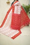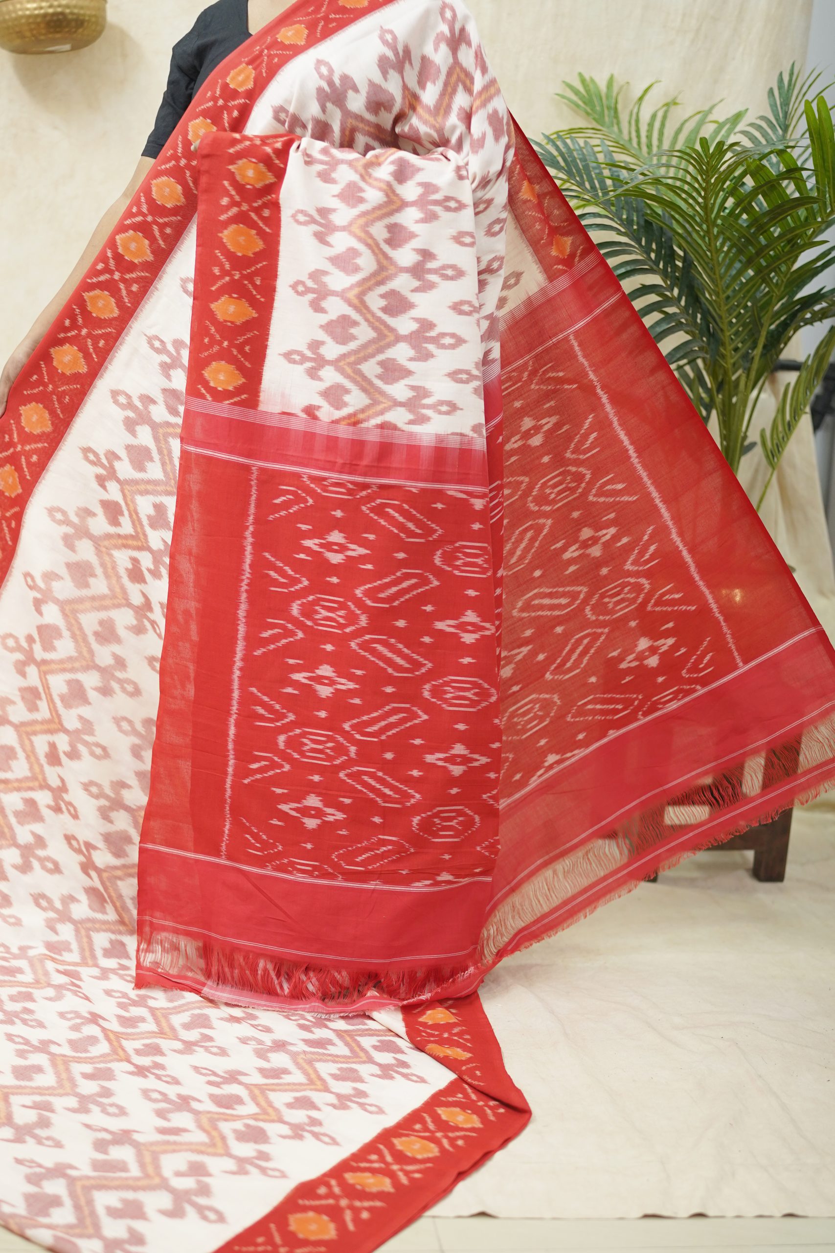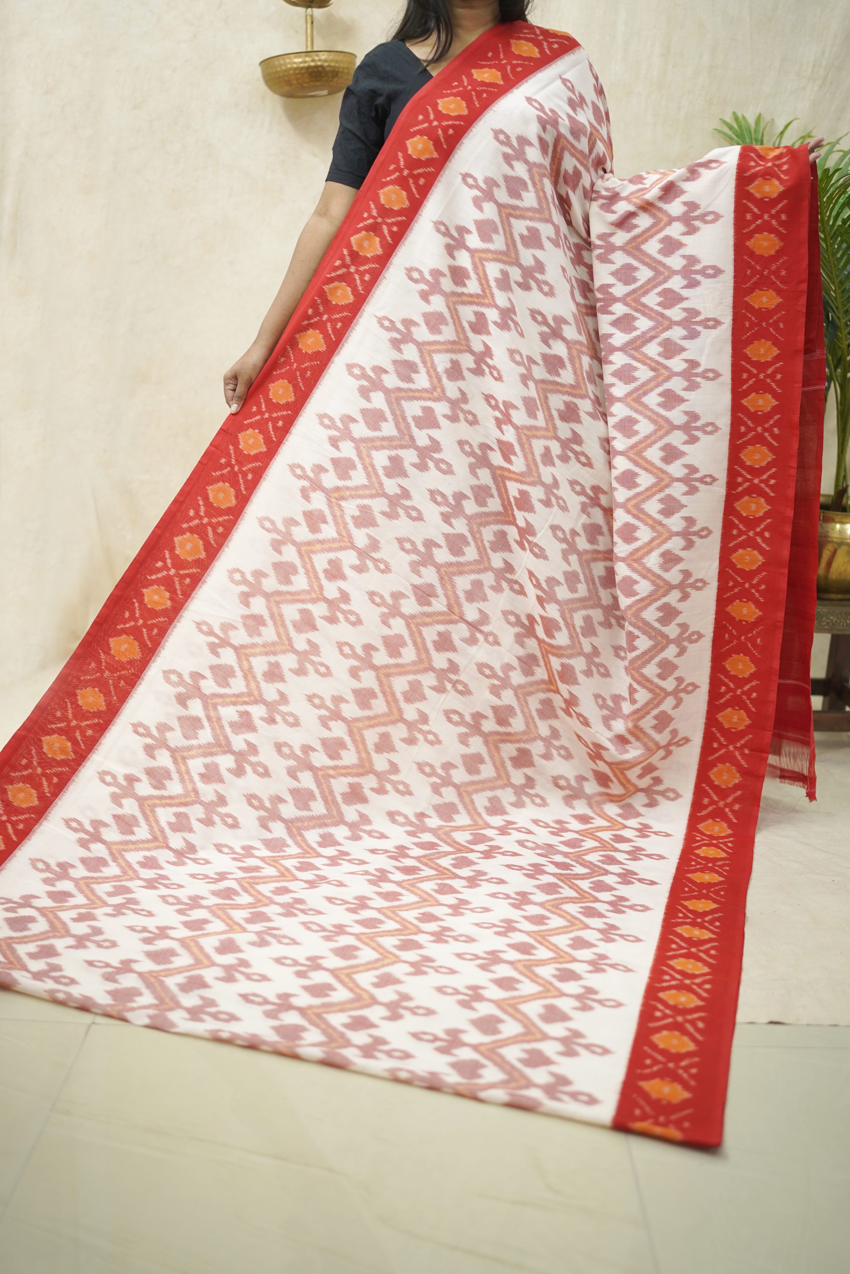 Step into the spotlight with our exquisite handwoven cotton pochampally saree featuring a stunning off white body creating a bold and lively appearance that exudes confidence and charm. The highlight of this saree is the contrasting red border with ikkat motifs which add a touch of traditonal sophistication