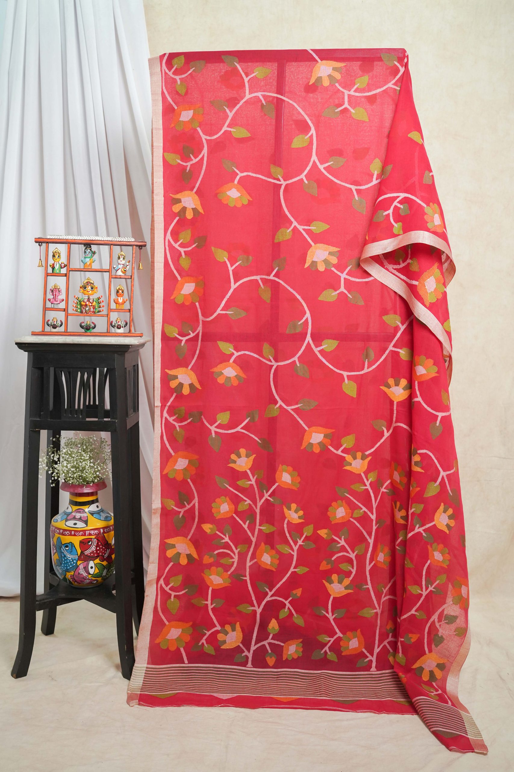 Embrace the pride of Bengal with our red handwoven Cotton Jamdani Saree. Woven with care and adorned with intricate floral patterns, this saree is a true testament to Bengal’s rich weaving heritage. Soft, breathable, and gracefully elegant, it blends timeless craftsmanship with the region’s cultural pride. Perfect for cherished moments, from tranquil mornings to grand celebrations.