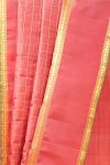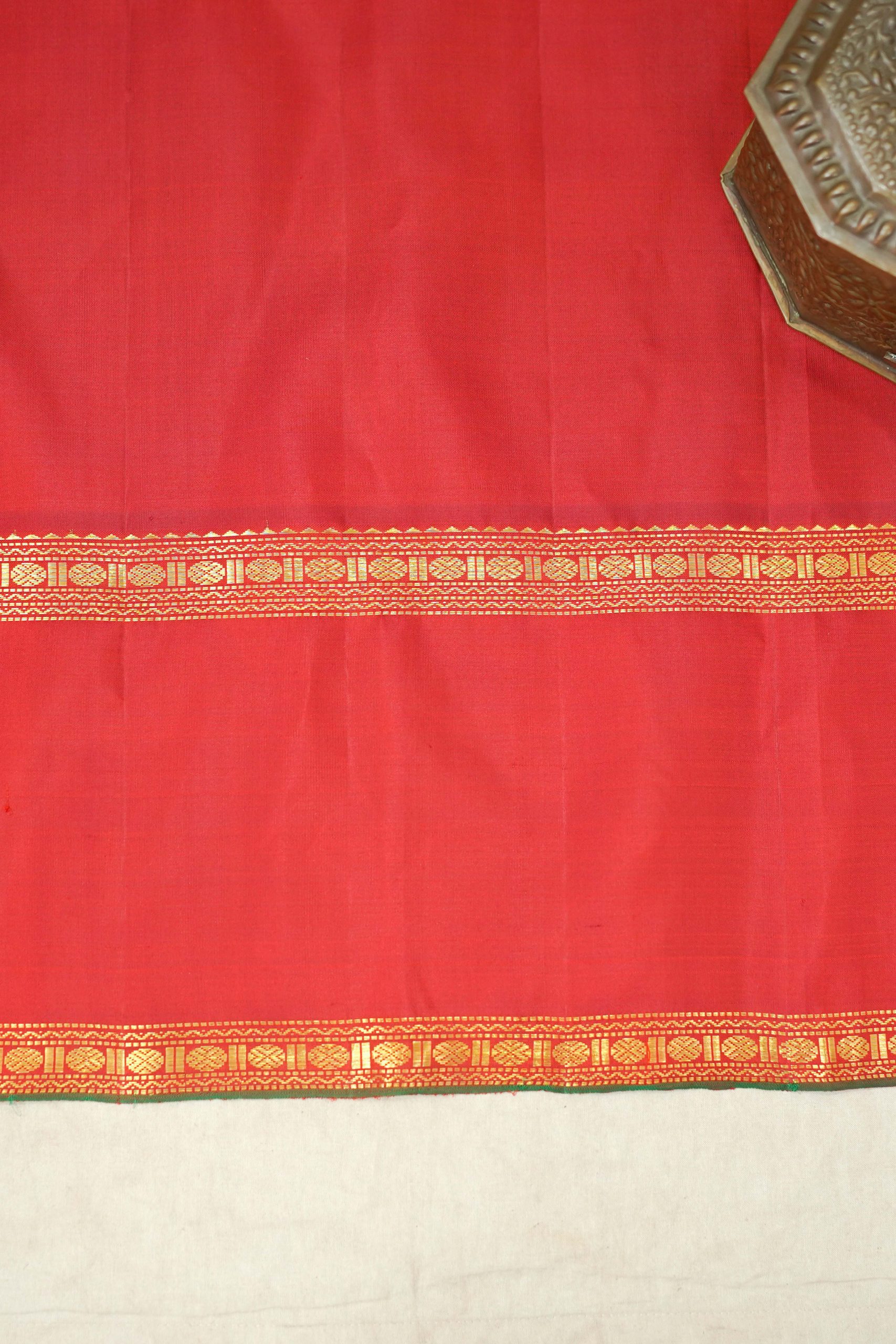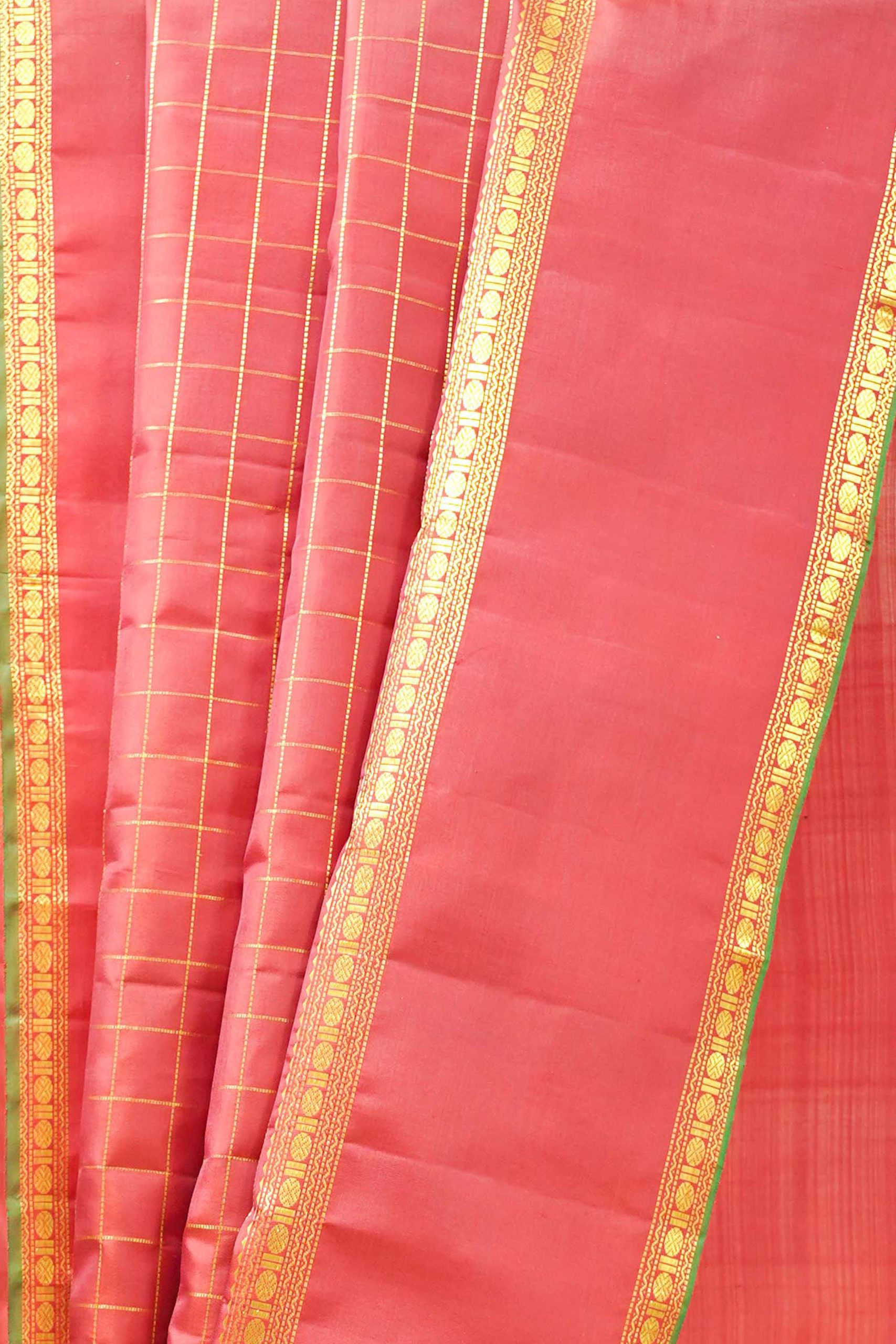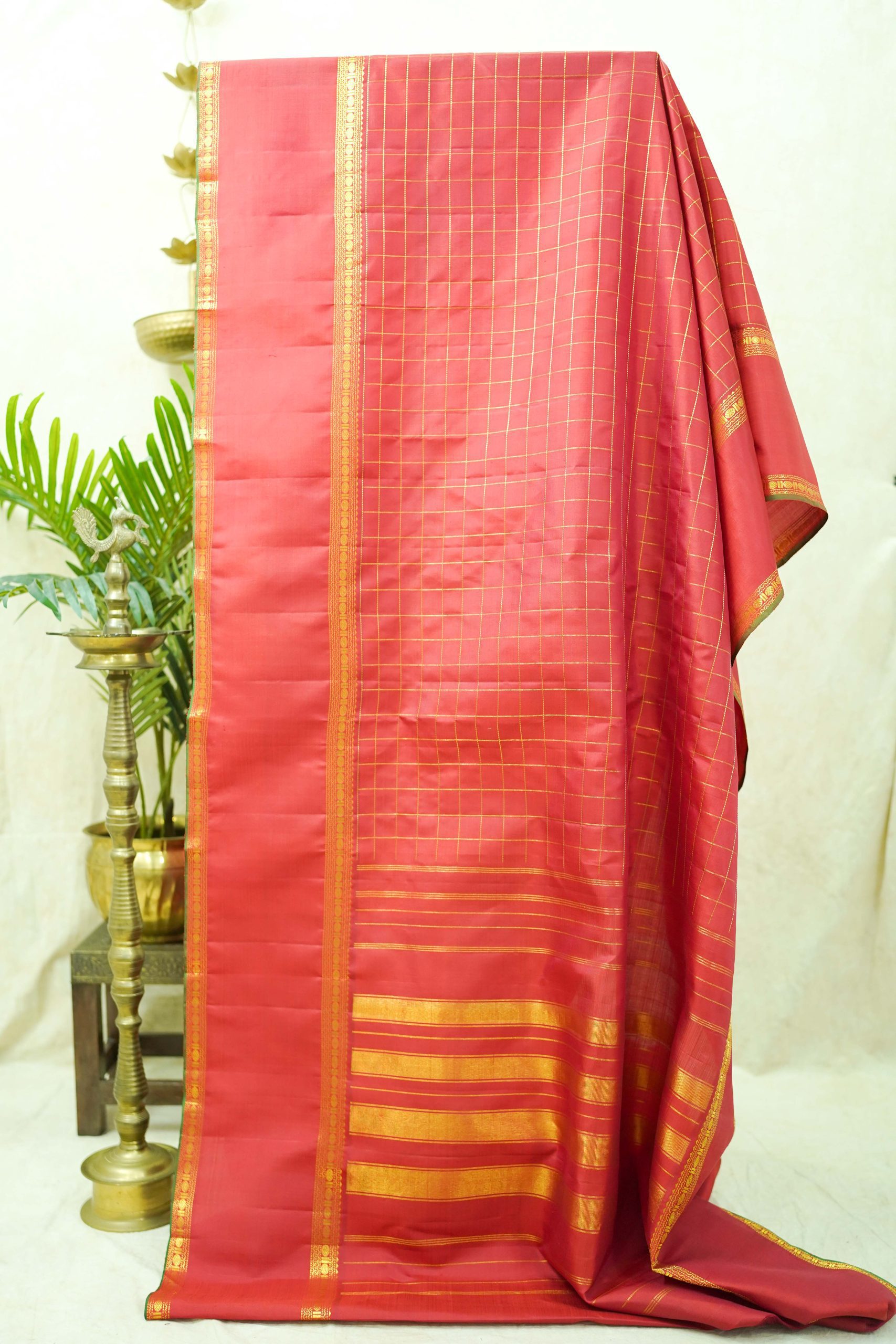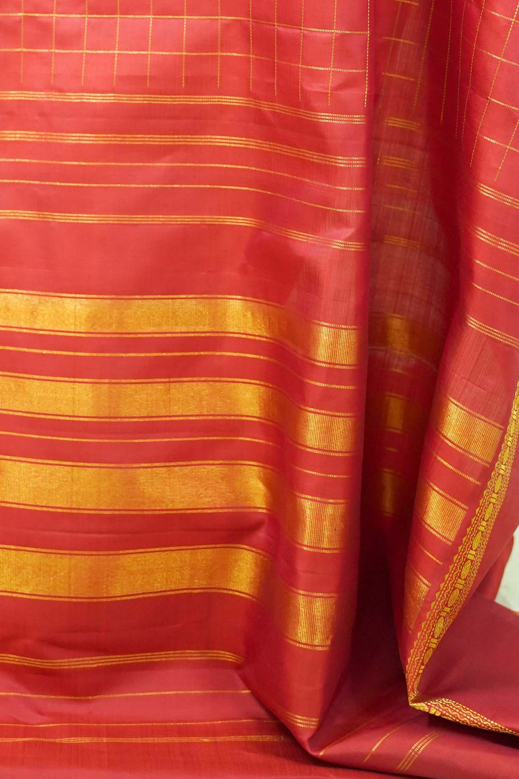 Our exquisite red Kanjeevaram silk saree designed in golden zari checks all across the body. The pallu is adorned with intricate zari work, adding a unique and charming touch. The green coloured selvege adds a striking contrast to the very look of the saree.