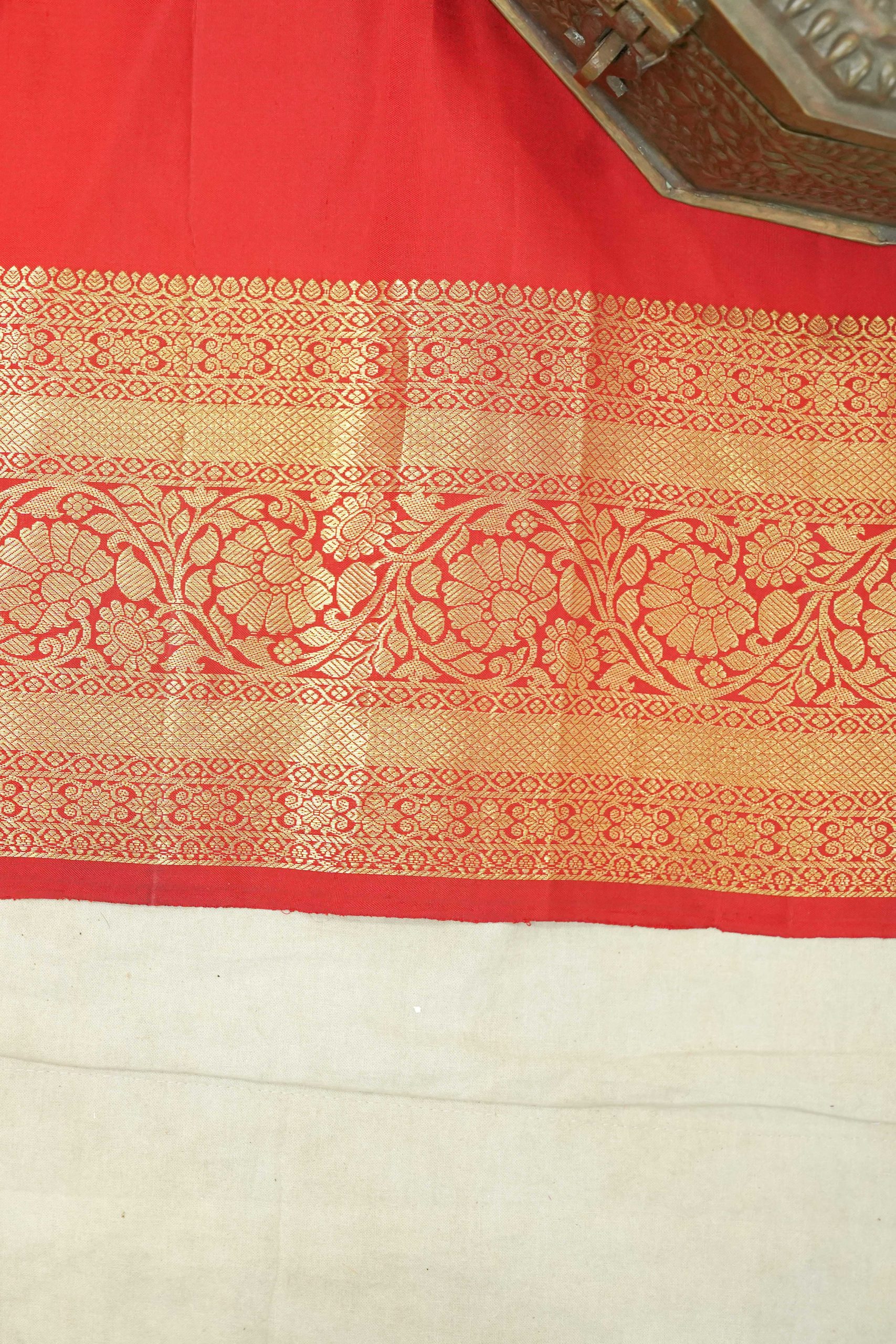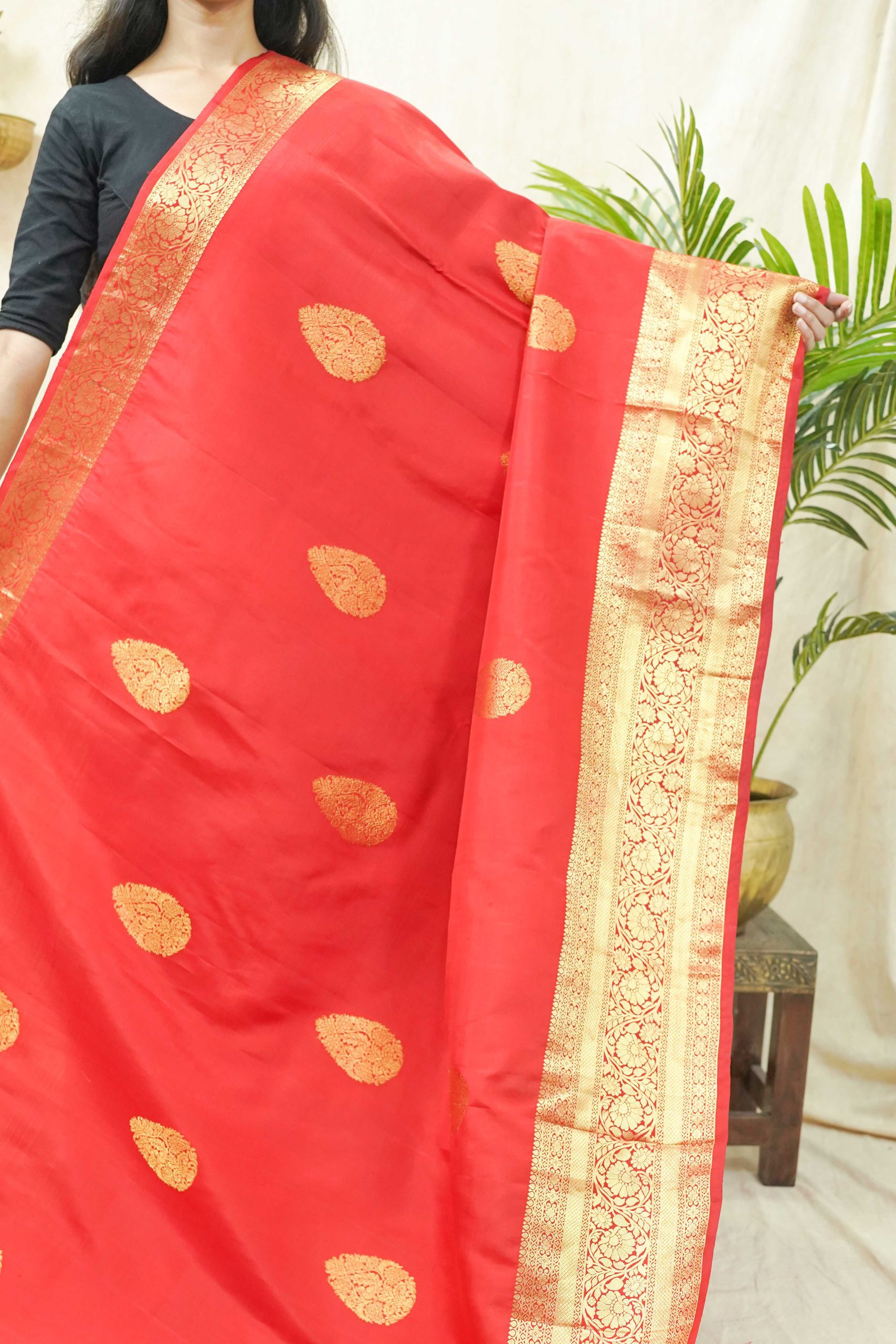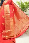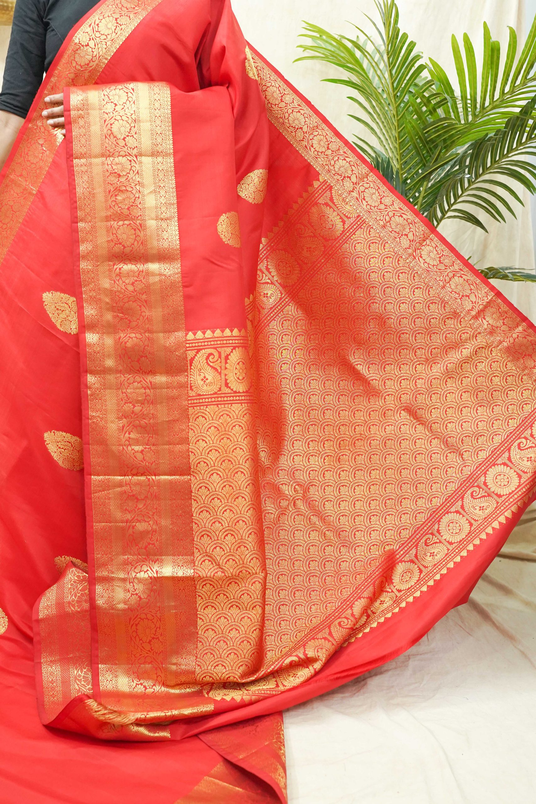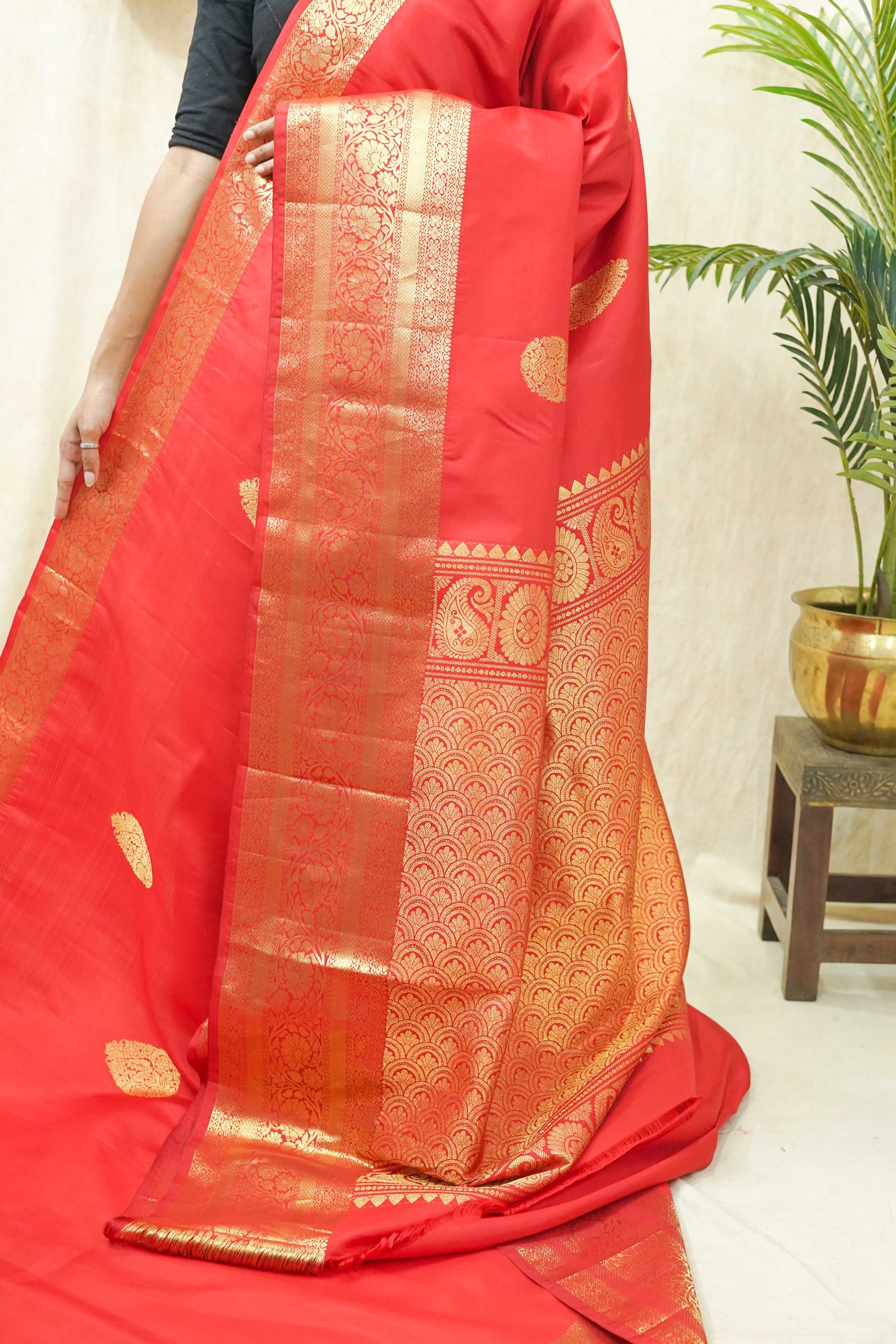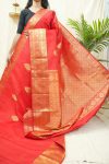 Our exquisite red Kanjeevaram silk saree is designed to captivate with its delicate big butas and intricate motifs. The traditional motifs in golden zari adds a touch of auspiciousness and classic elegance, enhancing the saree’s overall appeal. The pallu is adorned with golden zari adding a unique and charming touch.