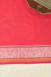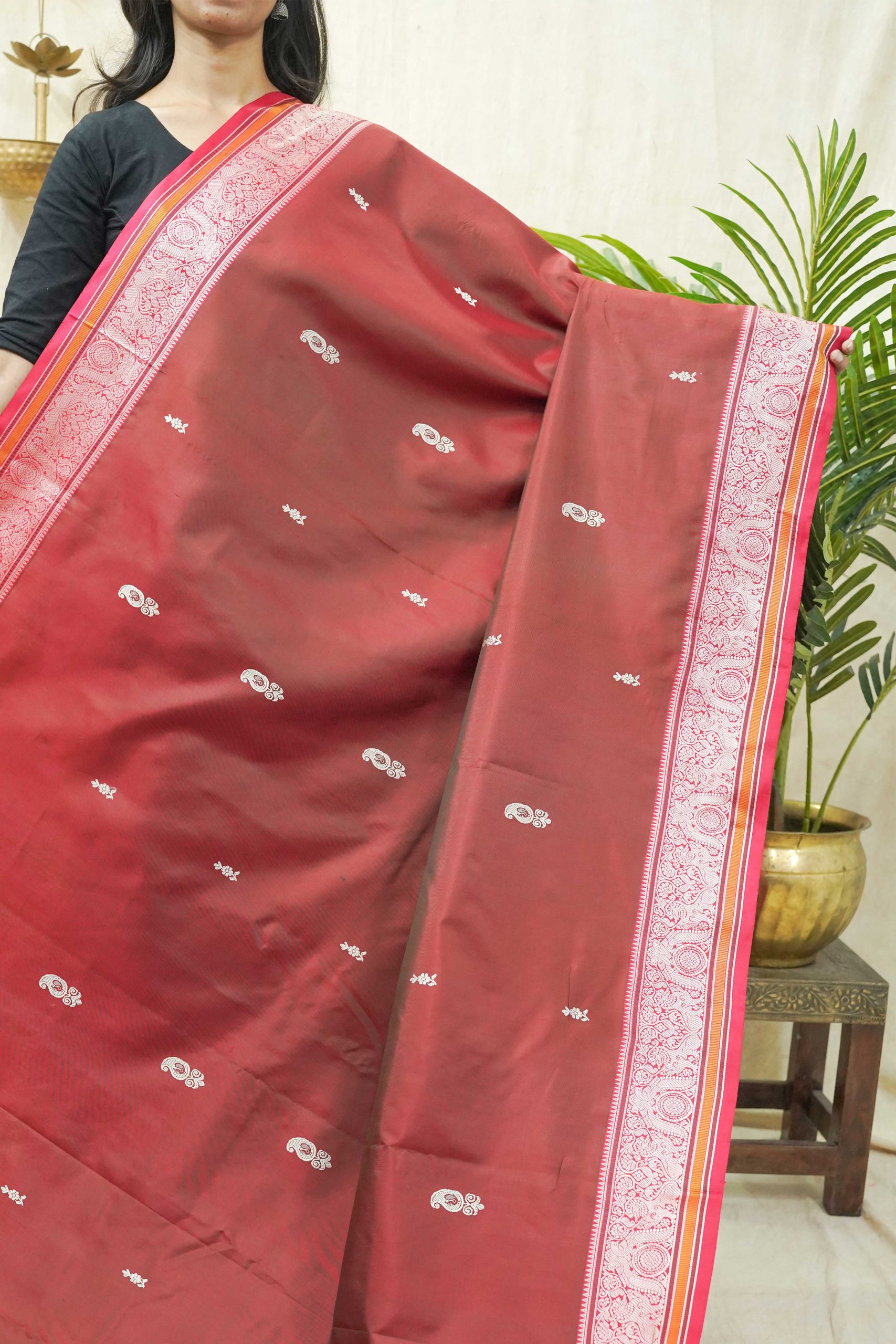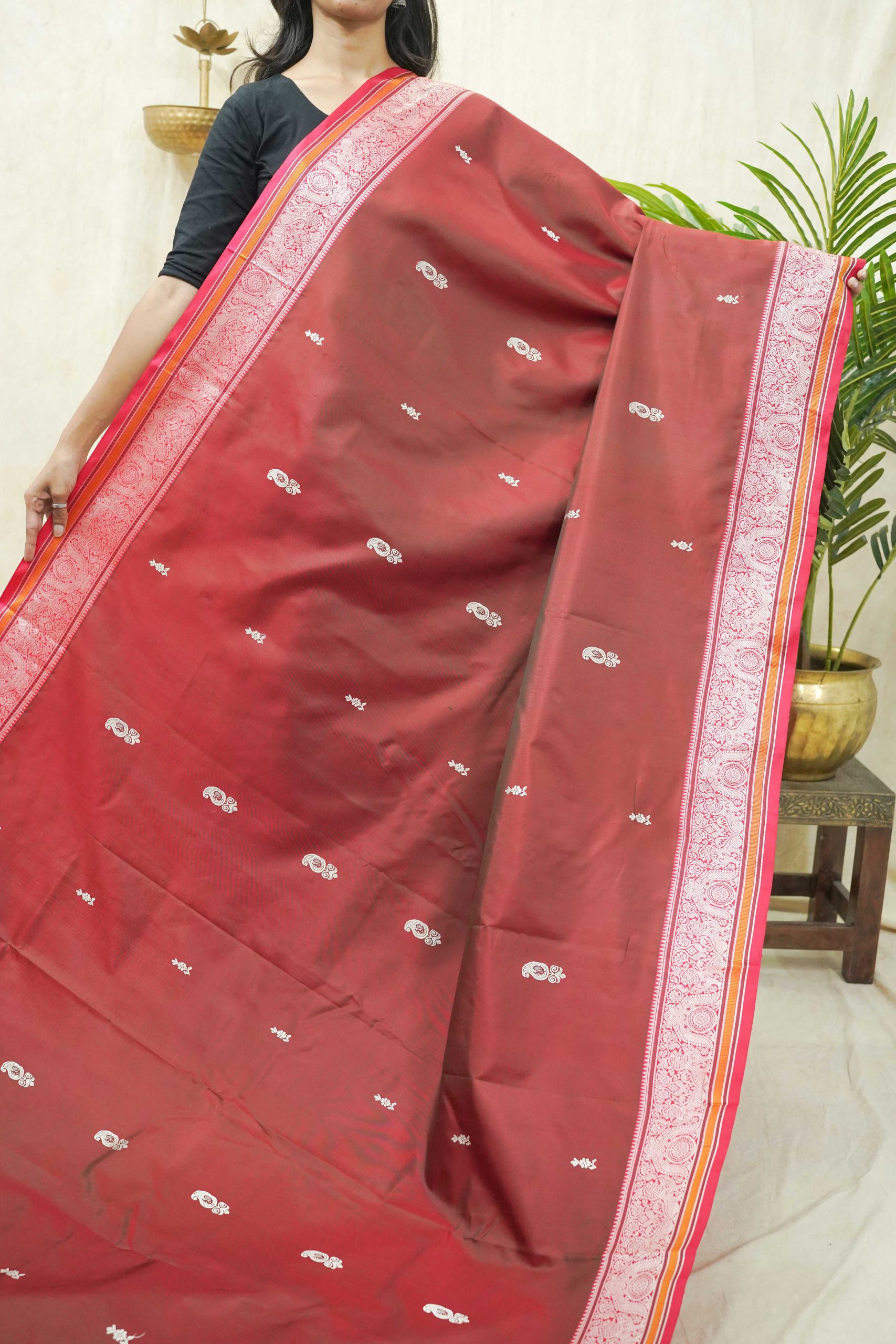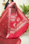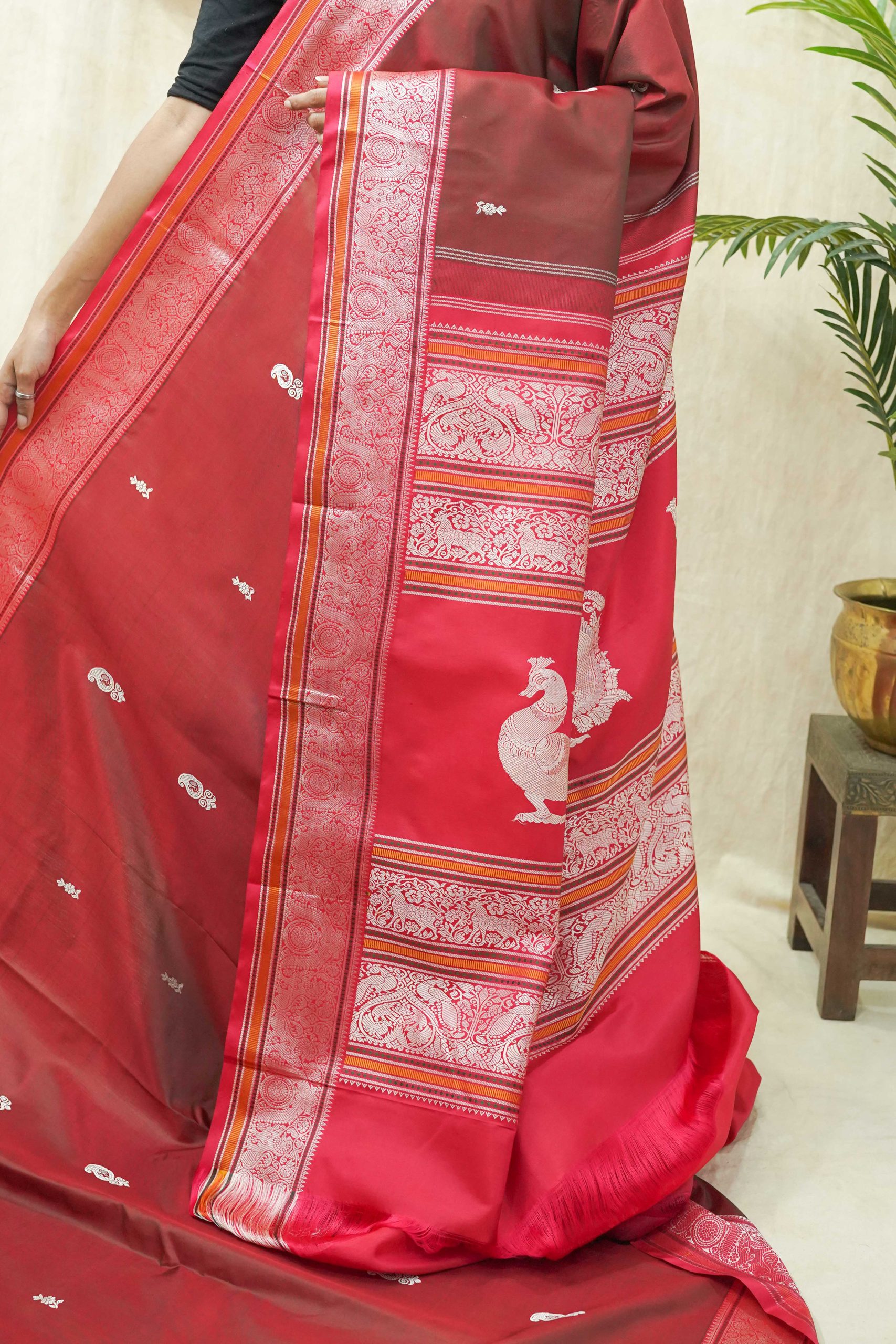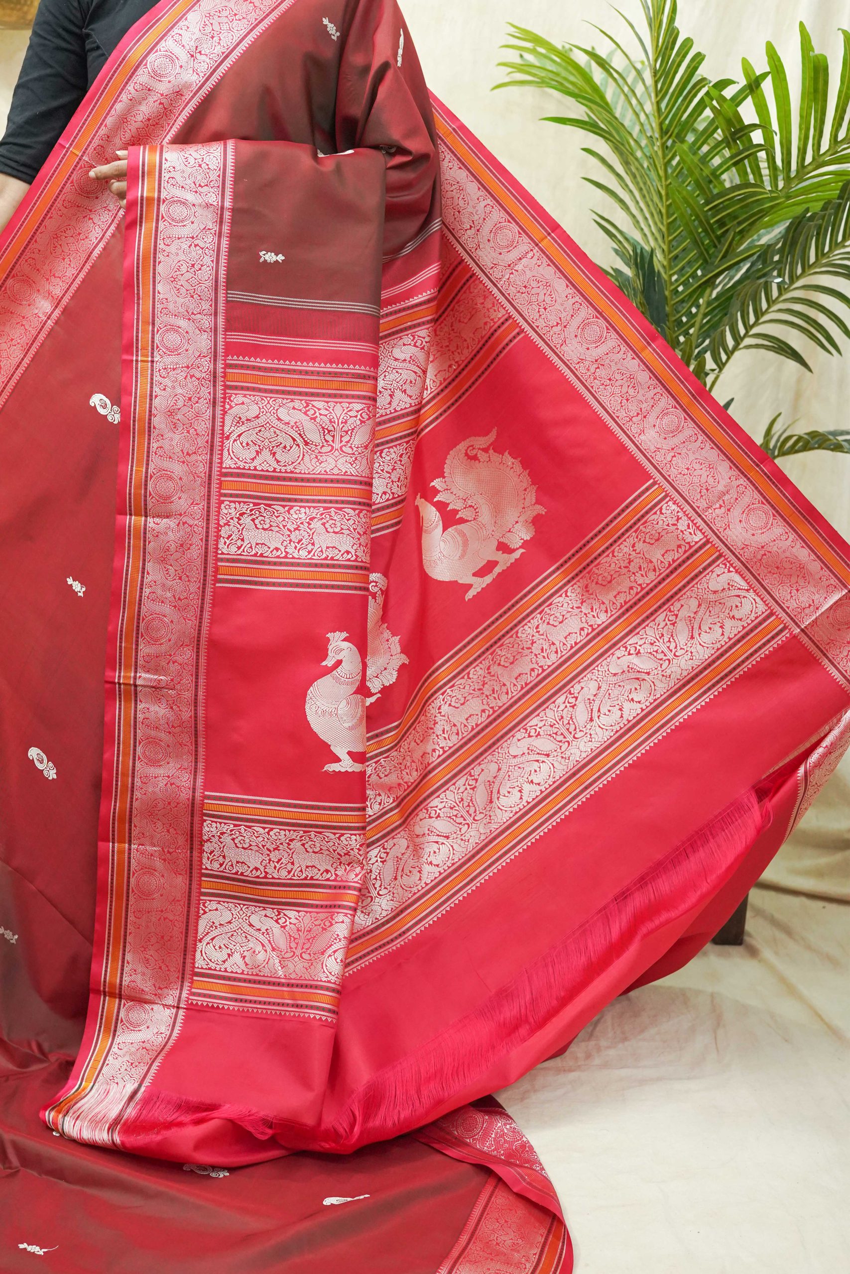 Indulge in the luxurious beauty of our red and maroon dual tone Kanjeevaram silk saree, which features a stunning animal and bird motif border and pallu, adorned with intricate thread work motifs inspired by nature . The absence of Zari work allow the intricate thread work and detailed motifs to shine through, creating a refined and elegant look.