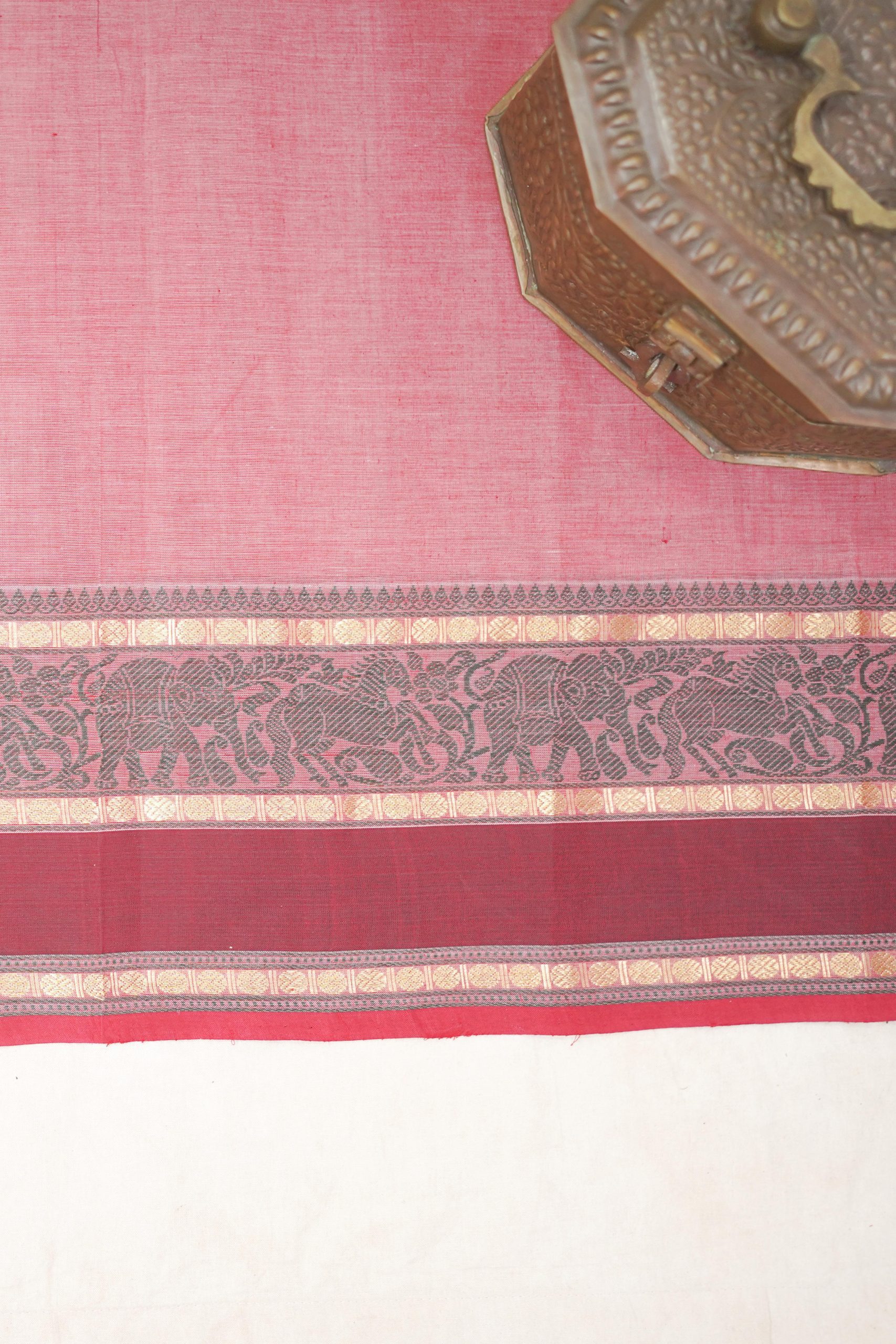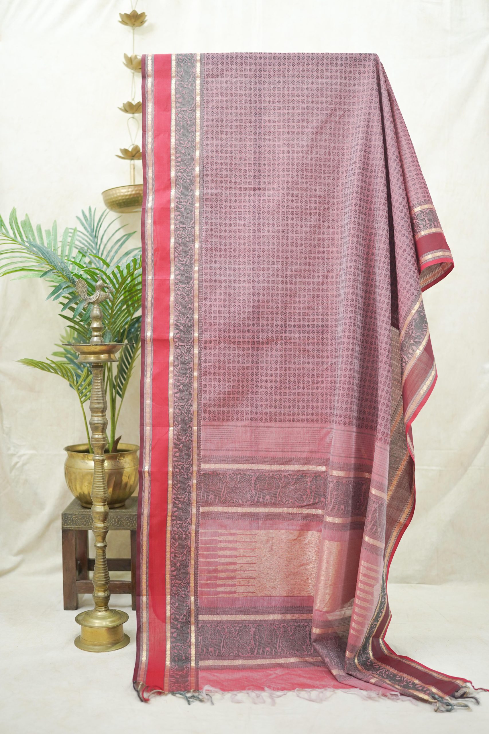 Enhance your ethnic ensemble with our red & off-white dual tone Kanchipuram cotton saree, featuring intricate 20,000 butas all across with a striking red and maroon ganga jamuna border. Perfect for any special occasion, this saree combines traditional artistry with modern elegance.