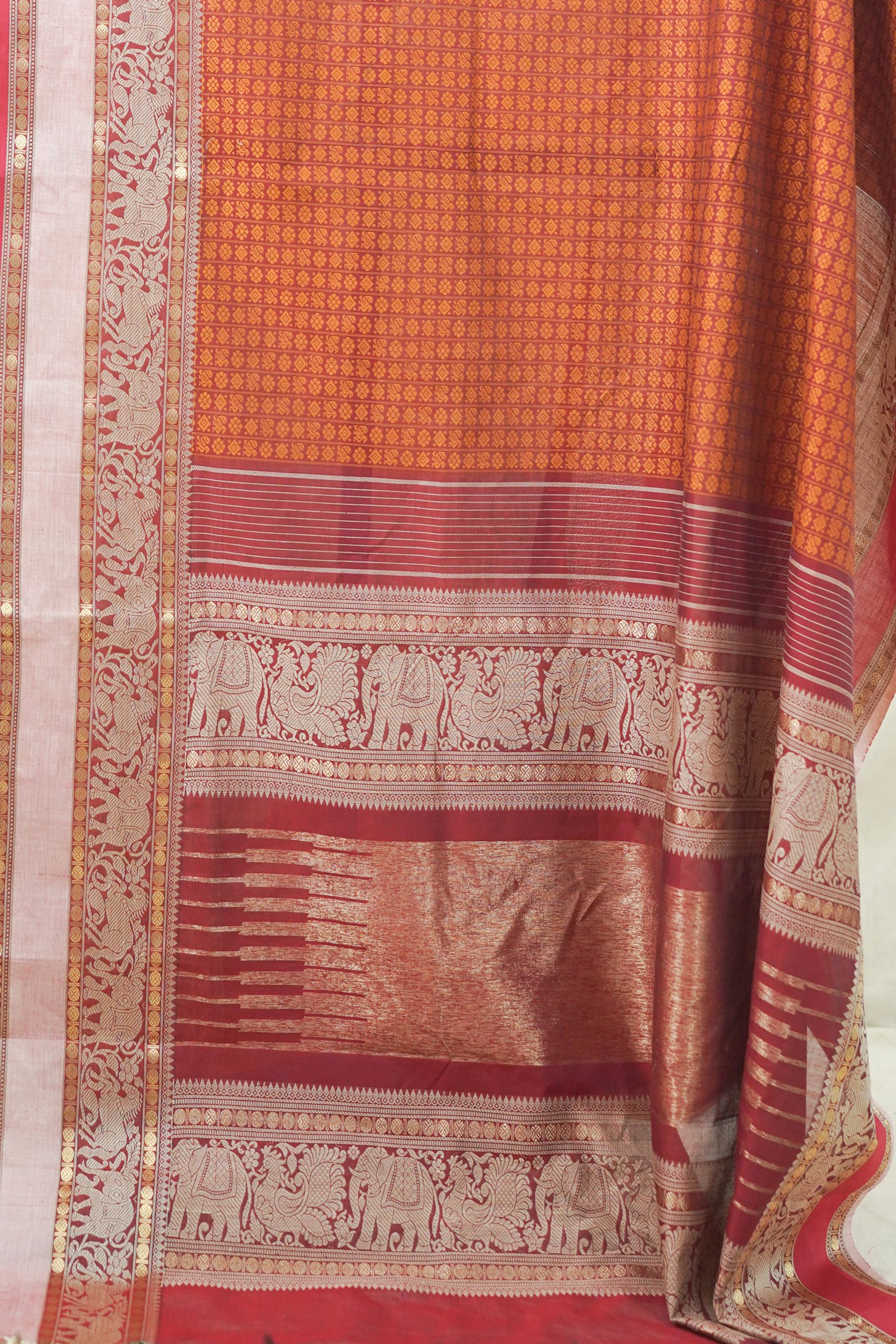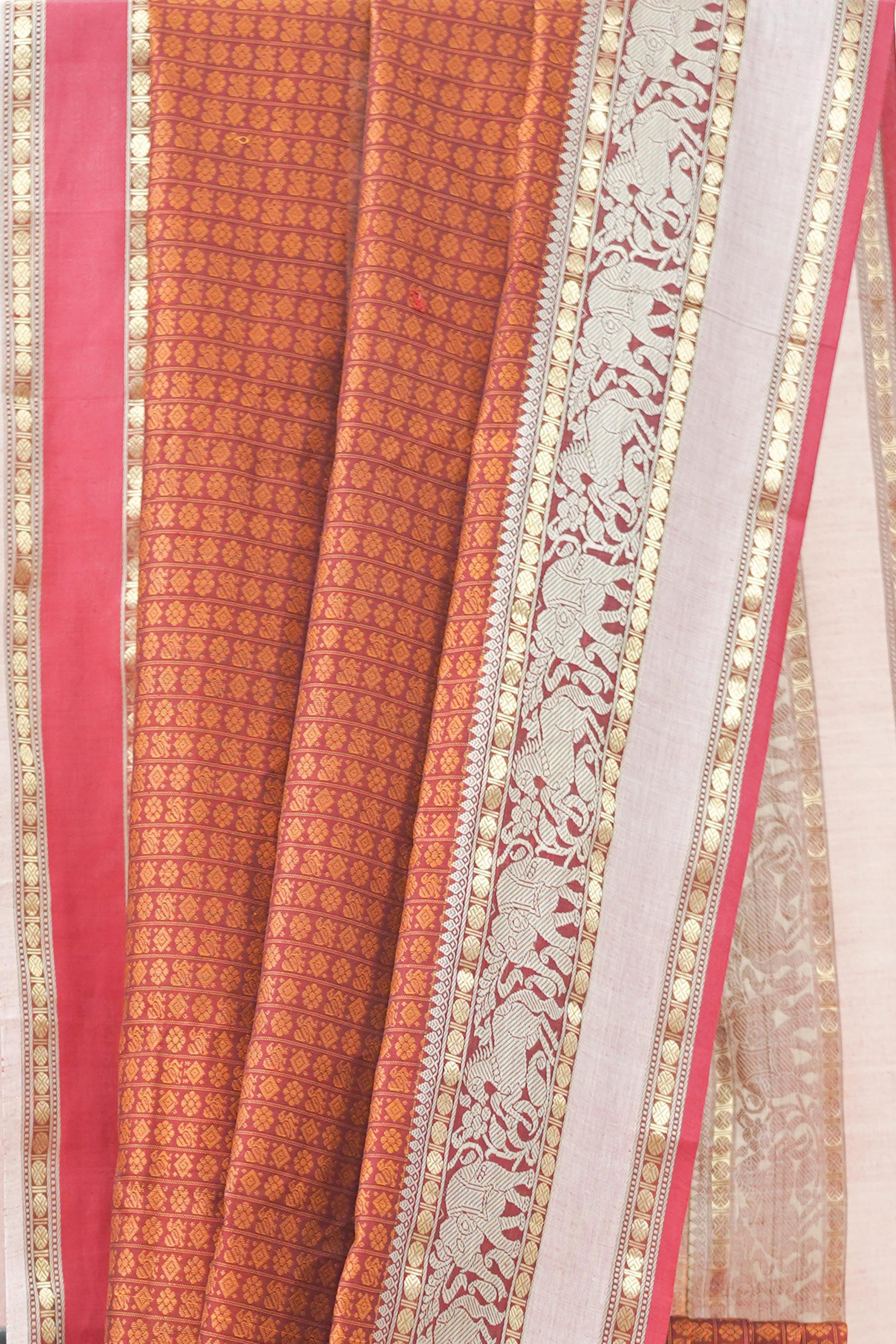 Enhance your ethnic ensemble with our red & dark brown dual tone Kanchipuram cotton saree, featuring intricate 20,000 butas all across with a striking red border. Perfect for any special occasion, this saree combines traditional artistry with modern elegance.