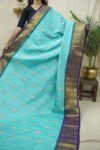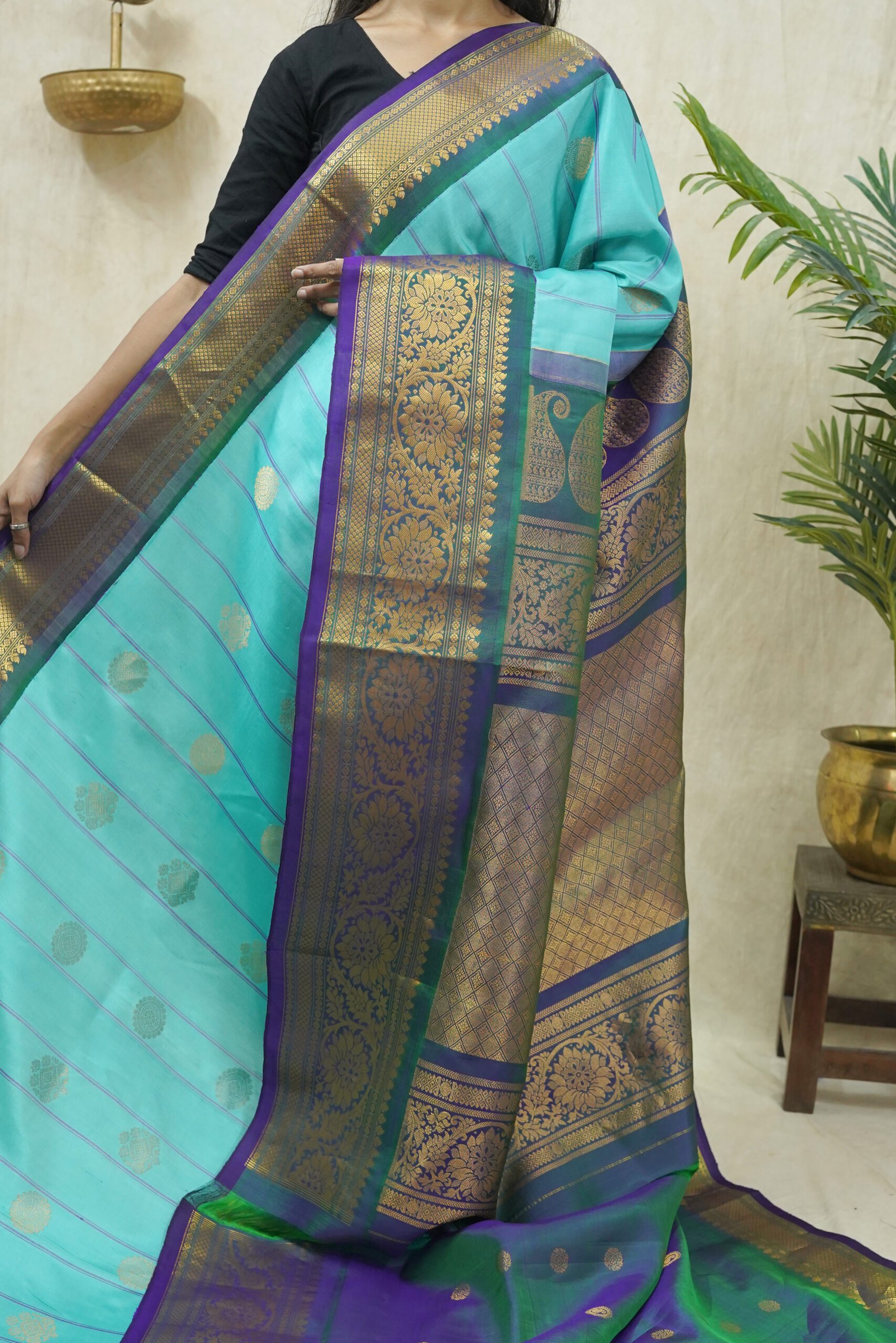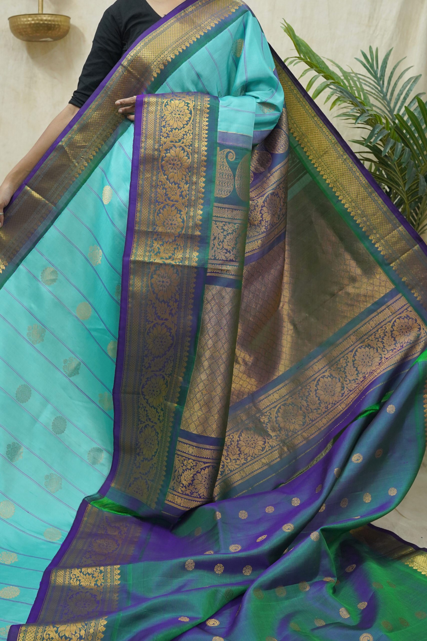 Indulge in the timeless beauty of sky blue -green dual tone silk Gadwal saree, a graceful blend of tradition and elegance. Handwoven with pure mulberry silk, it features delicate buttas all across the body,enhanced by a vibrant yellow border. Perfect for weddings, festive occasions, and cultural celebrations.