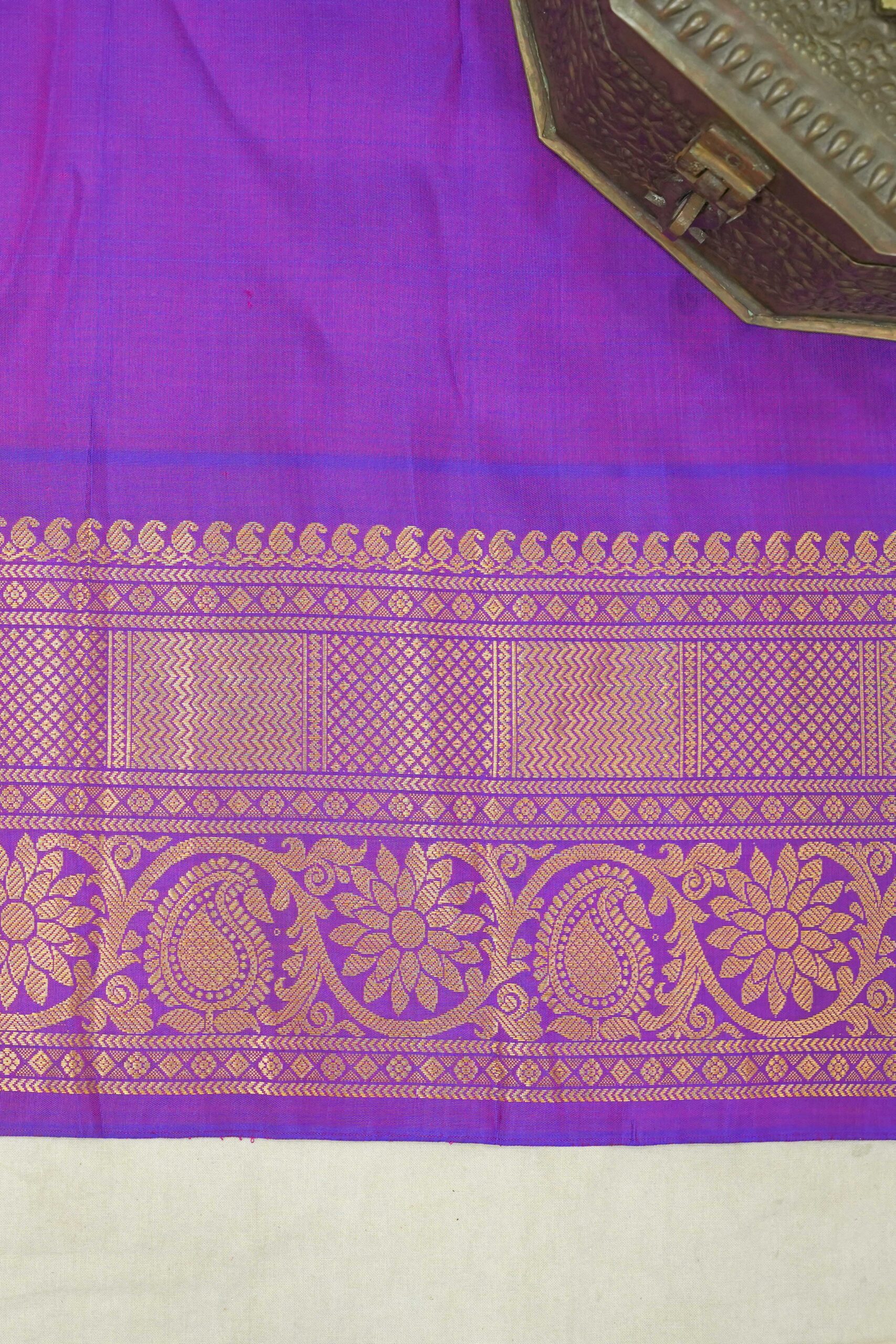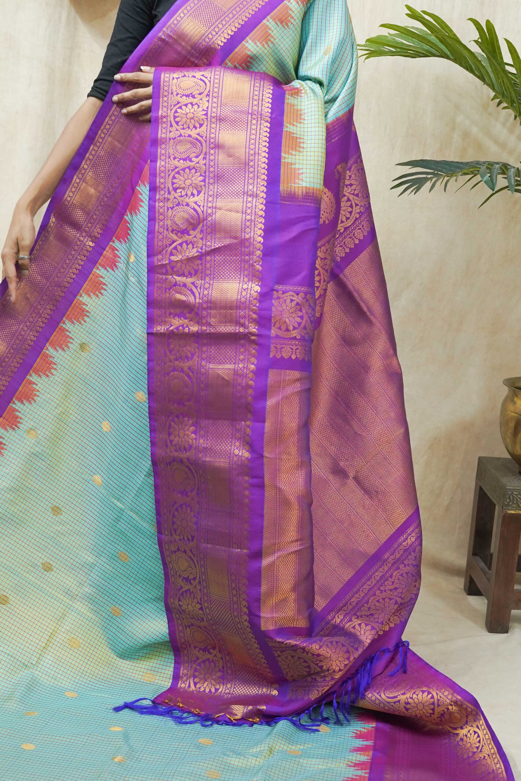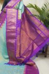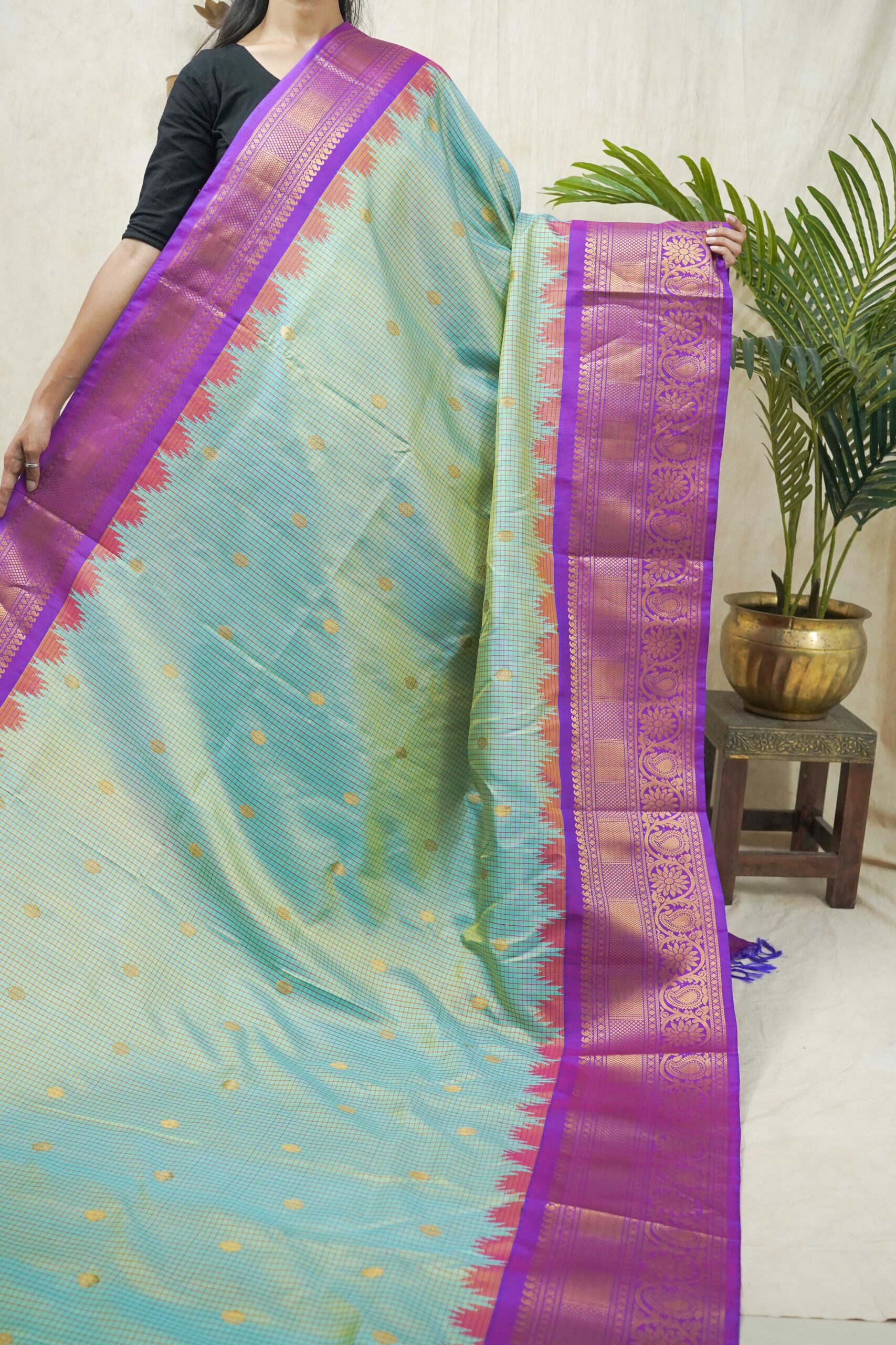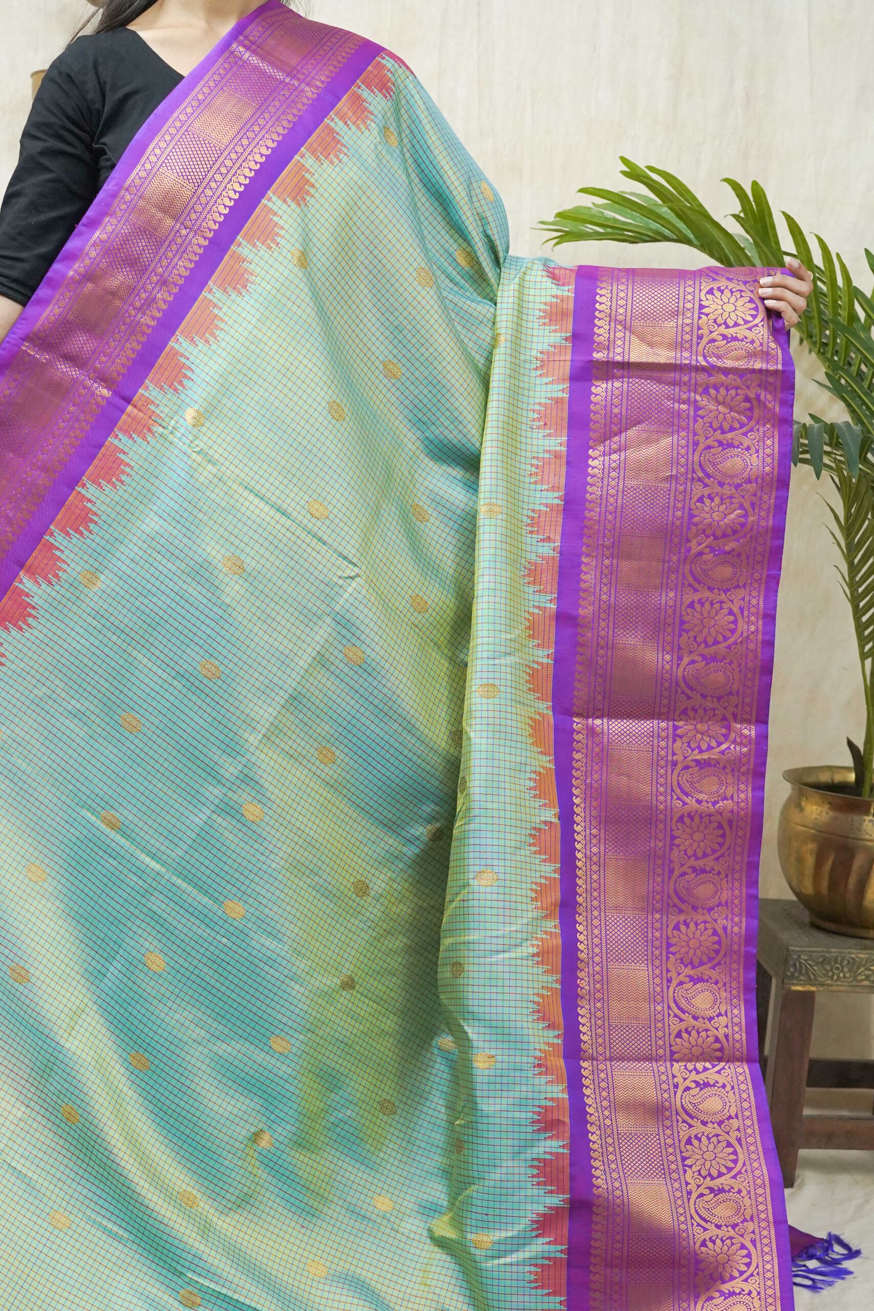 Indulge in the timeless beauty of sky blue-yellow dual tone silk Gadwal saree, a graceful blend of tradition and elegance. Handwoven with pure mulberry silk, it features delicate buttas all across the body,enhanced by a vibrant purple border. Perfect for weddings, festive occasions, and cultural celebrations.