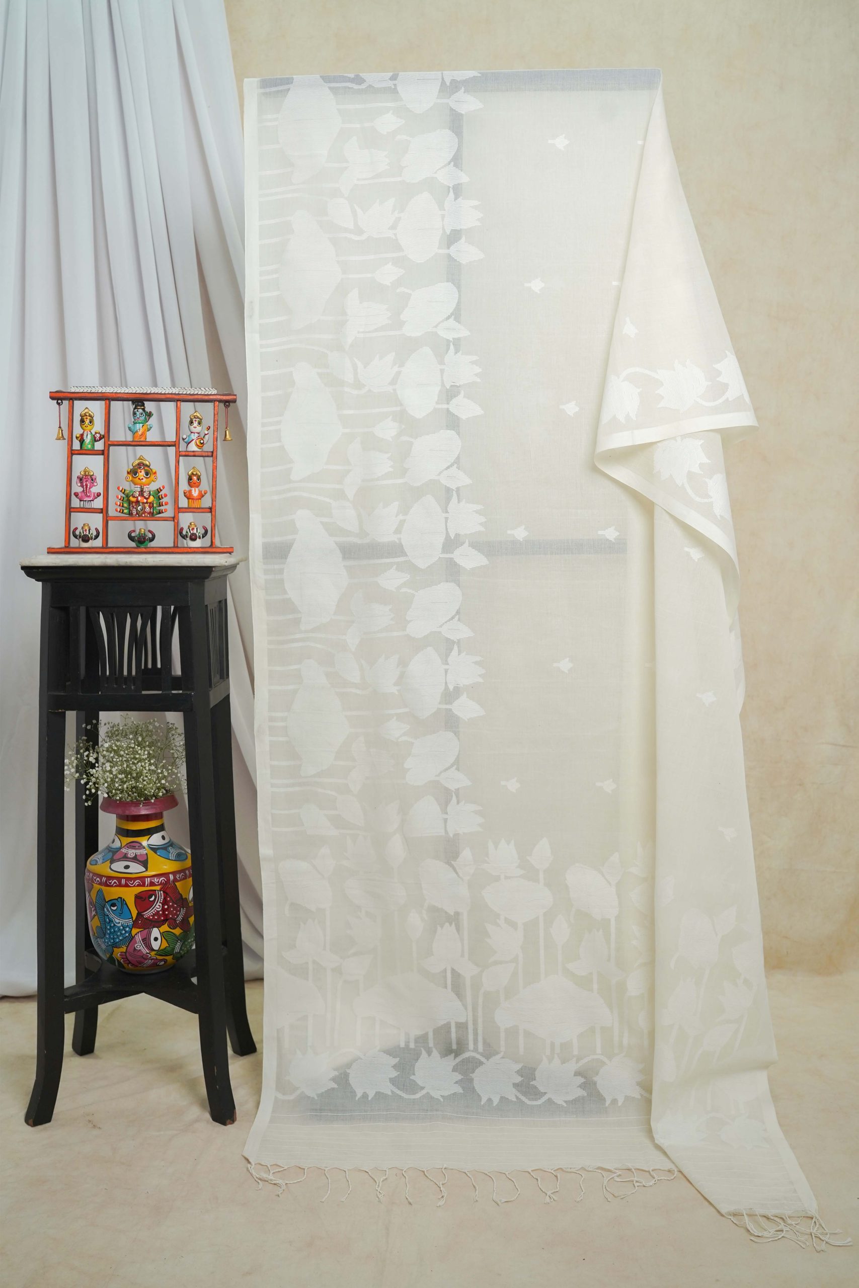 | Embrace the pride of Bengal with our white handwoven Cotton Jamdani Saree. Woven with care and adorned with intricate floral patterns, this saree is a true testament to Bengal’s rich weaving heritage. Soft, breathable, and gracefully elegant, it blends timeless craftsmanship with the region’s cultural pride. Perfect for cherished moments, from tranquil mornings to grand celebrations. |