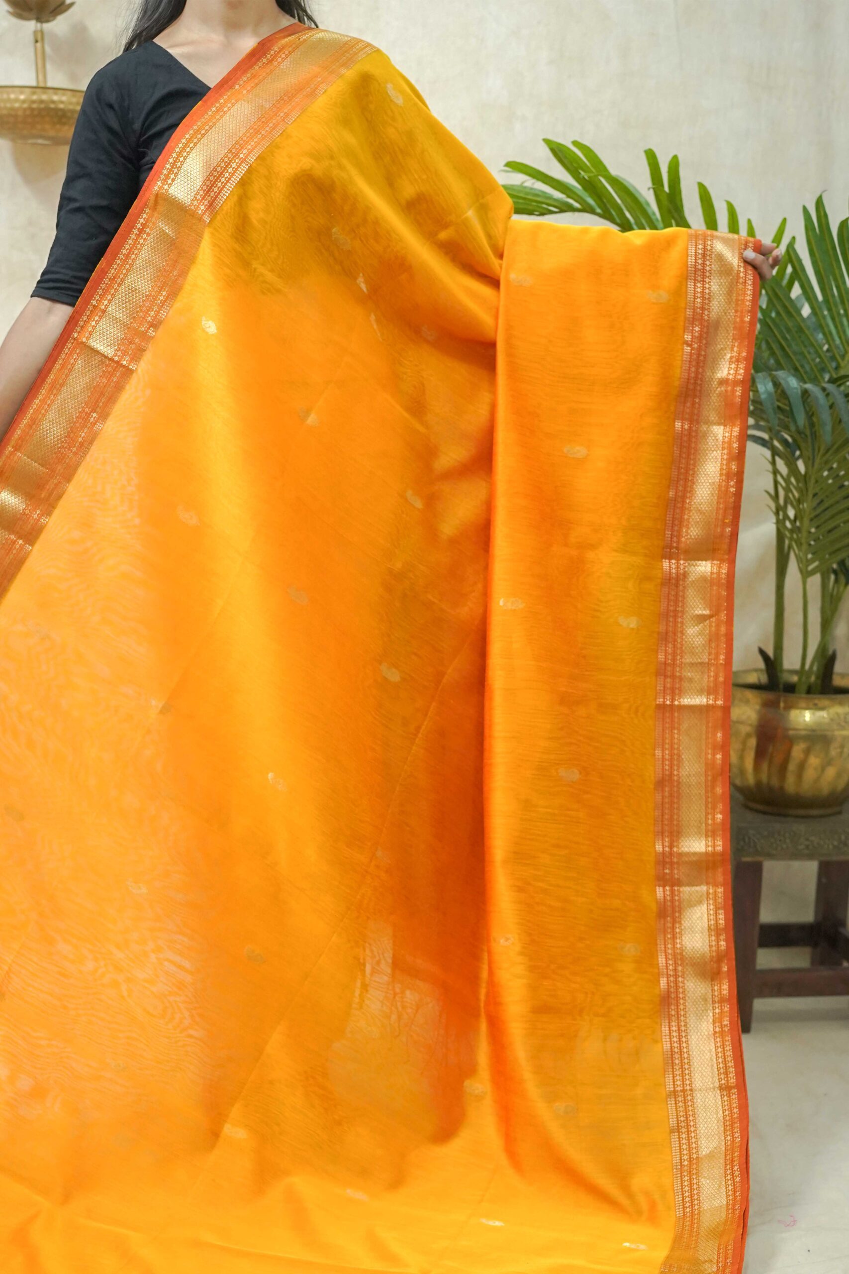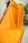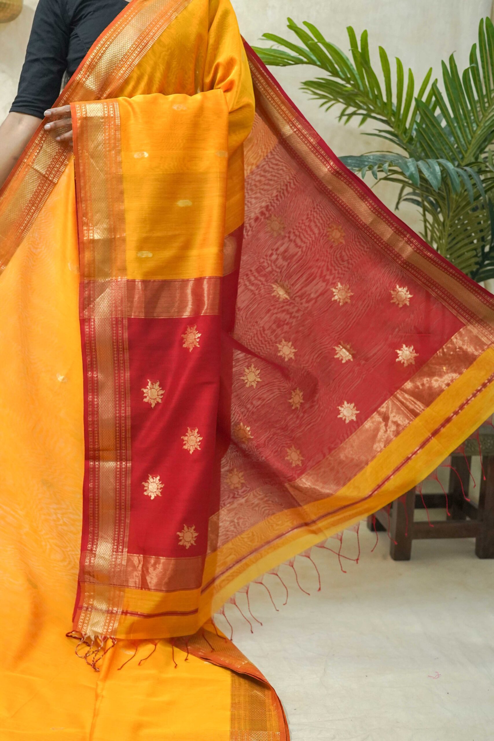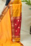 Introducing our radiant Kanchipuram sico saree in a rich shade of golden yellow, adorned with a contrasting deep red pallu intricately woven with golden zari motifs. The shimmering zari border enhances its regal appeal, making it a perfect choice for festive occasions and grand celebrations.”
