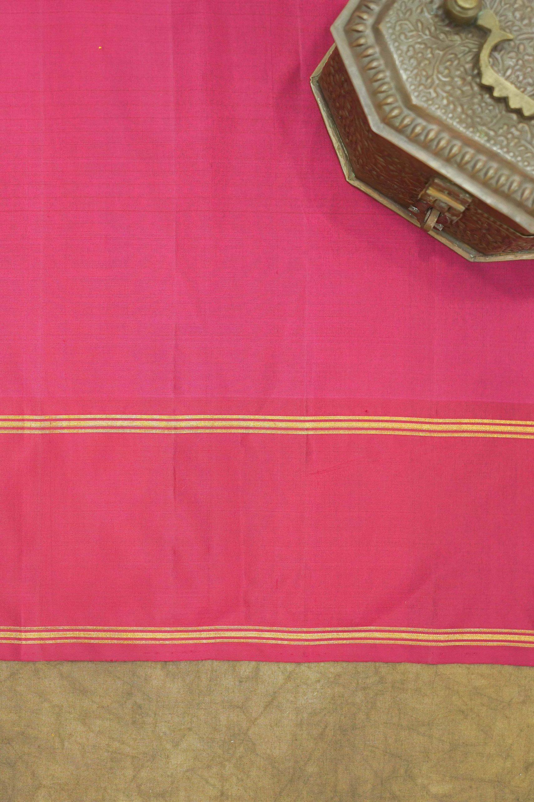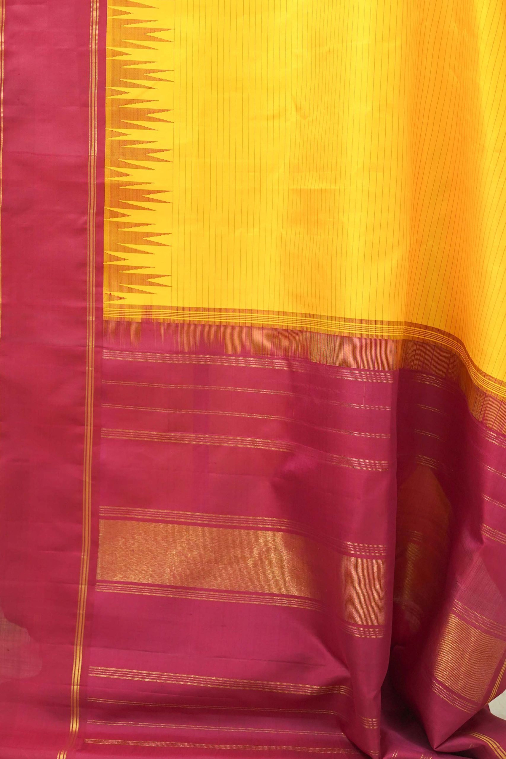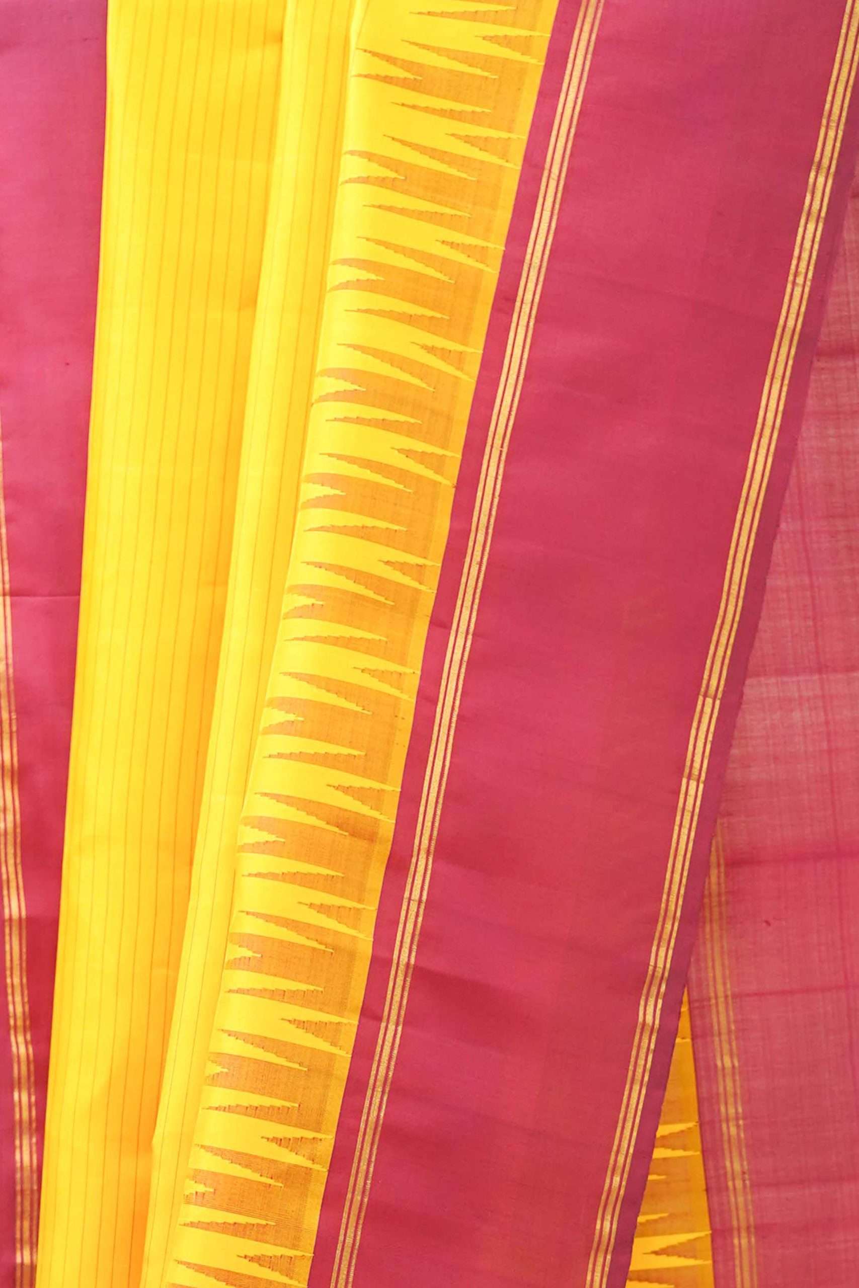 Our exquisite yellow Kanjeevaram silk saree designed with stripes all across the body in threadwork. The pallu is adorned with intricate zari work, adding a unique and charming touch. The reddish-maroon border adds a striking contrast to the very look of the saree.