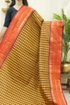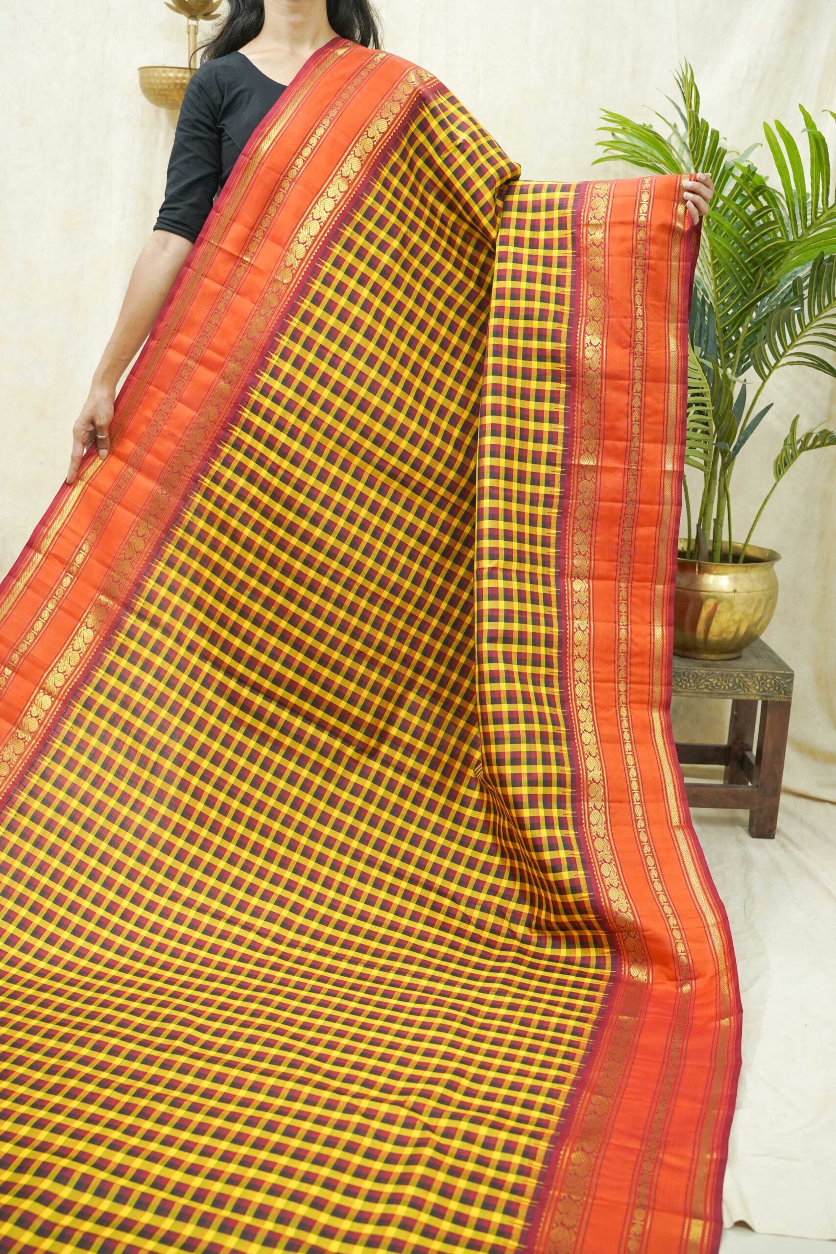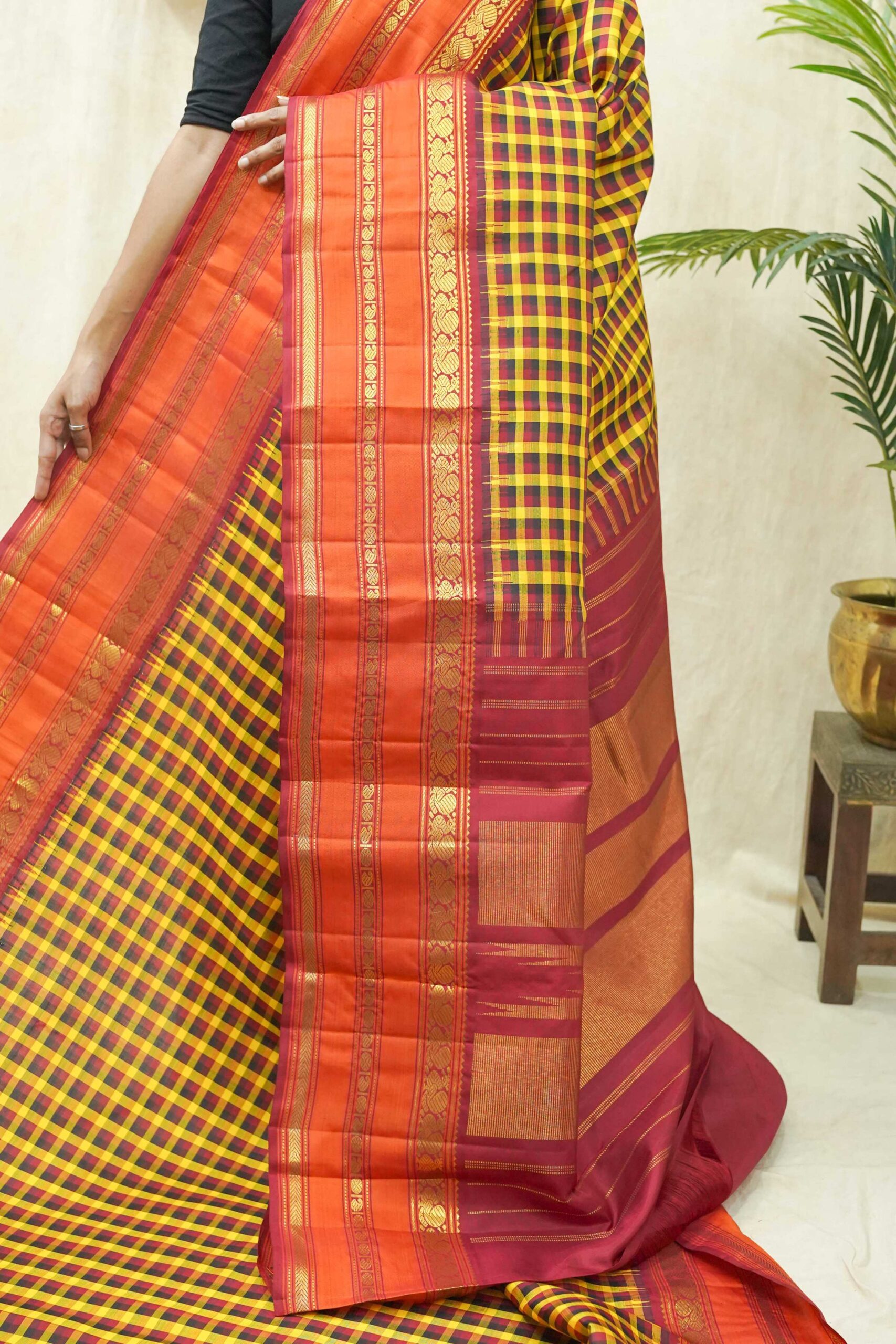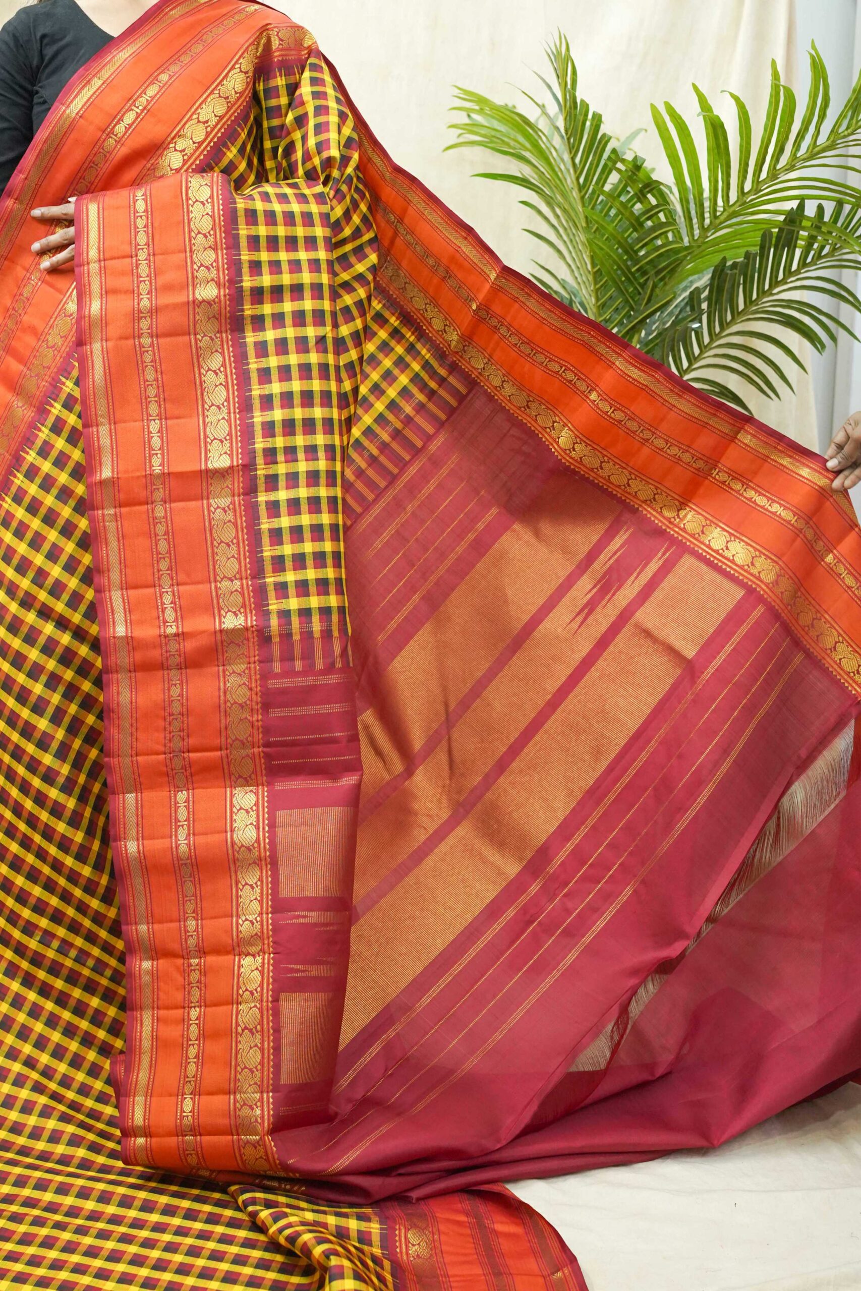 Our exquisite This stunning saree blends tradition with elegance. Featuring a vibrant yellow and maroon checked body, it is beautifully complemented by a rich maroon pallu with golden zari stripes and intricate orange borders. Perfect for festive occasions or cultural celebrations, this saree adds charm, grace, and timeless appeal to any wardrobe.