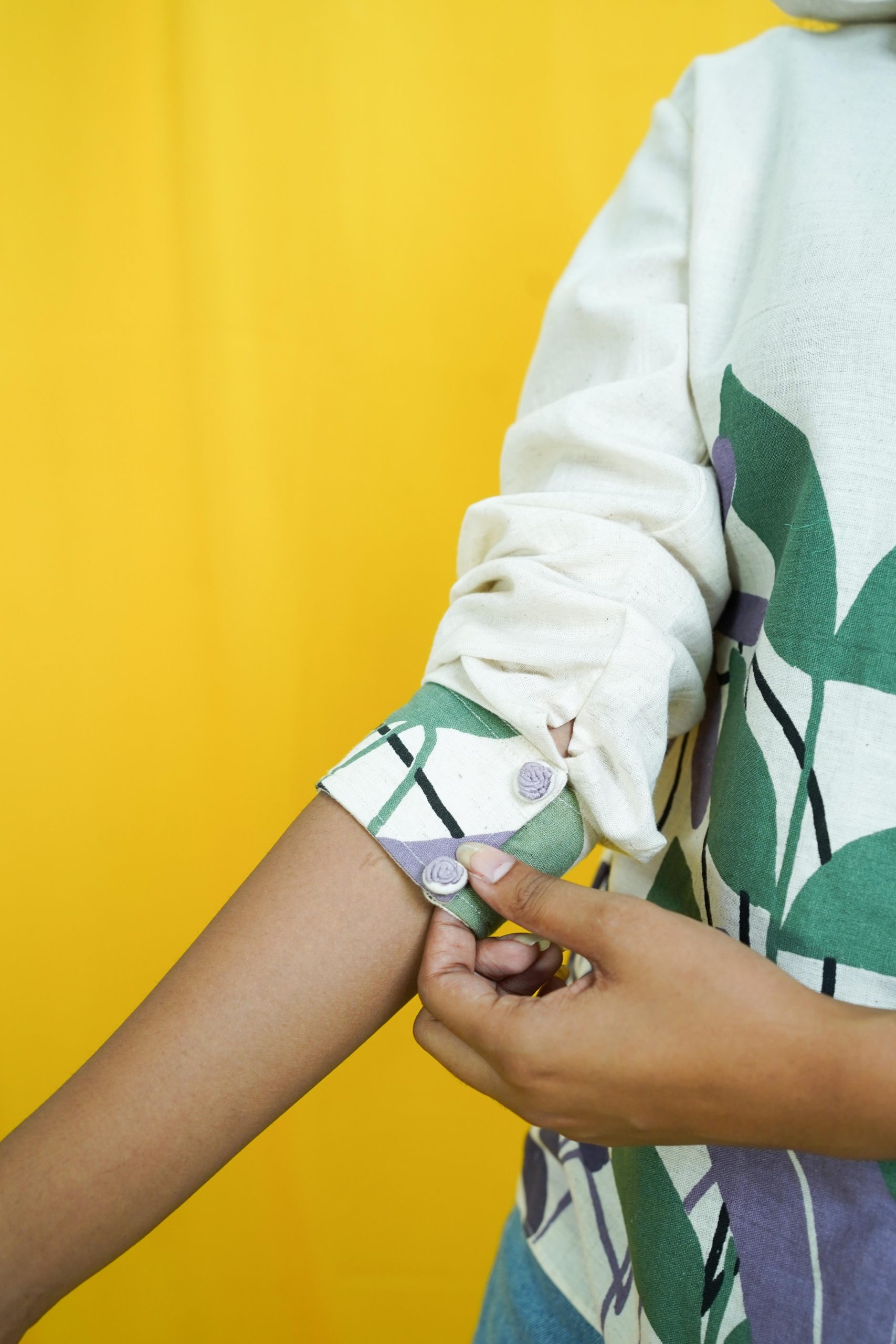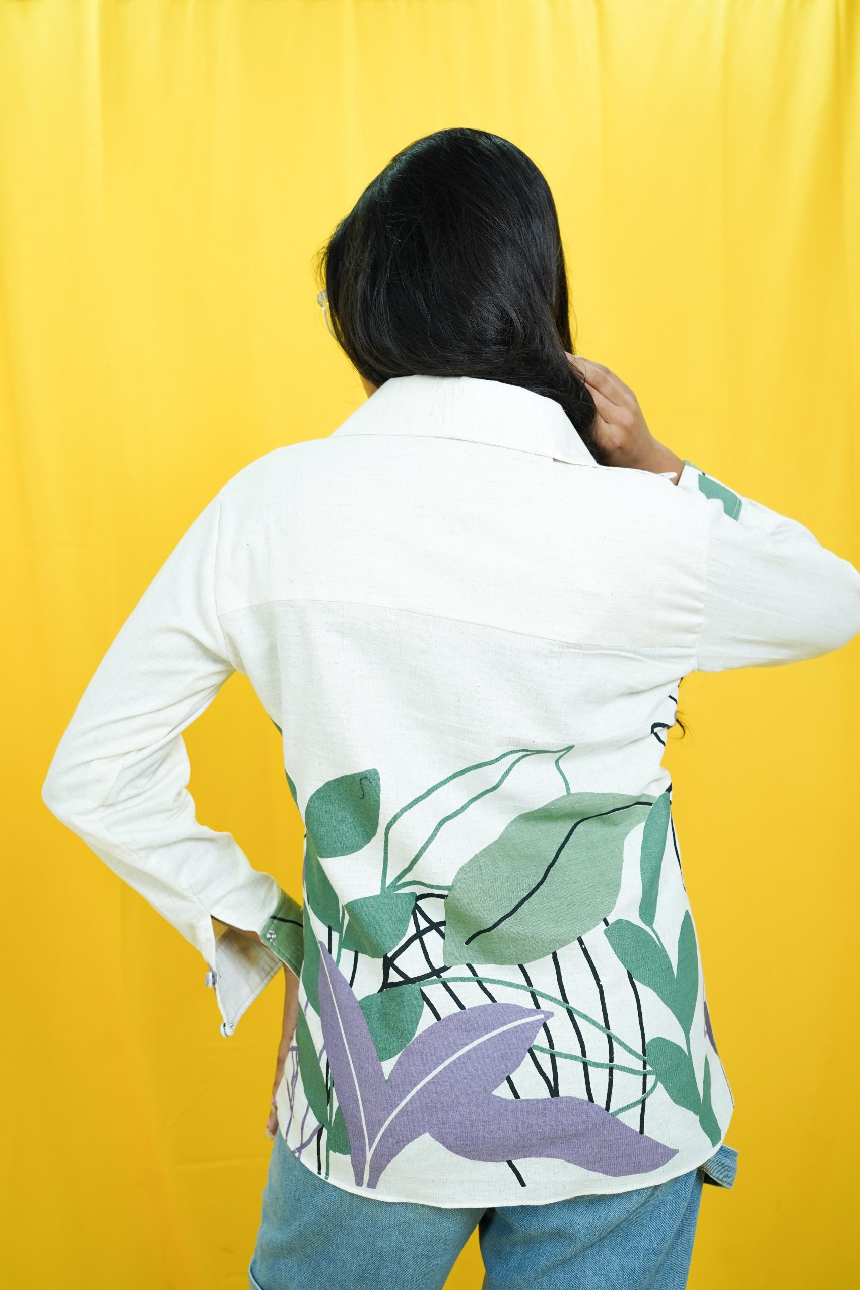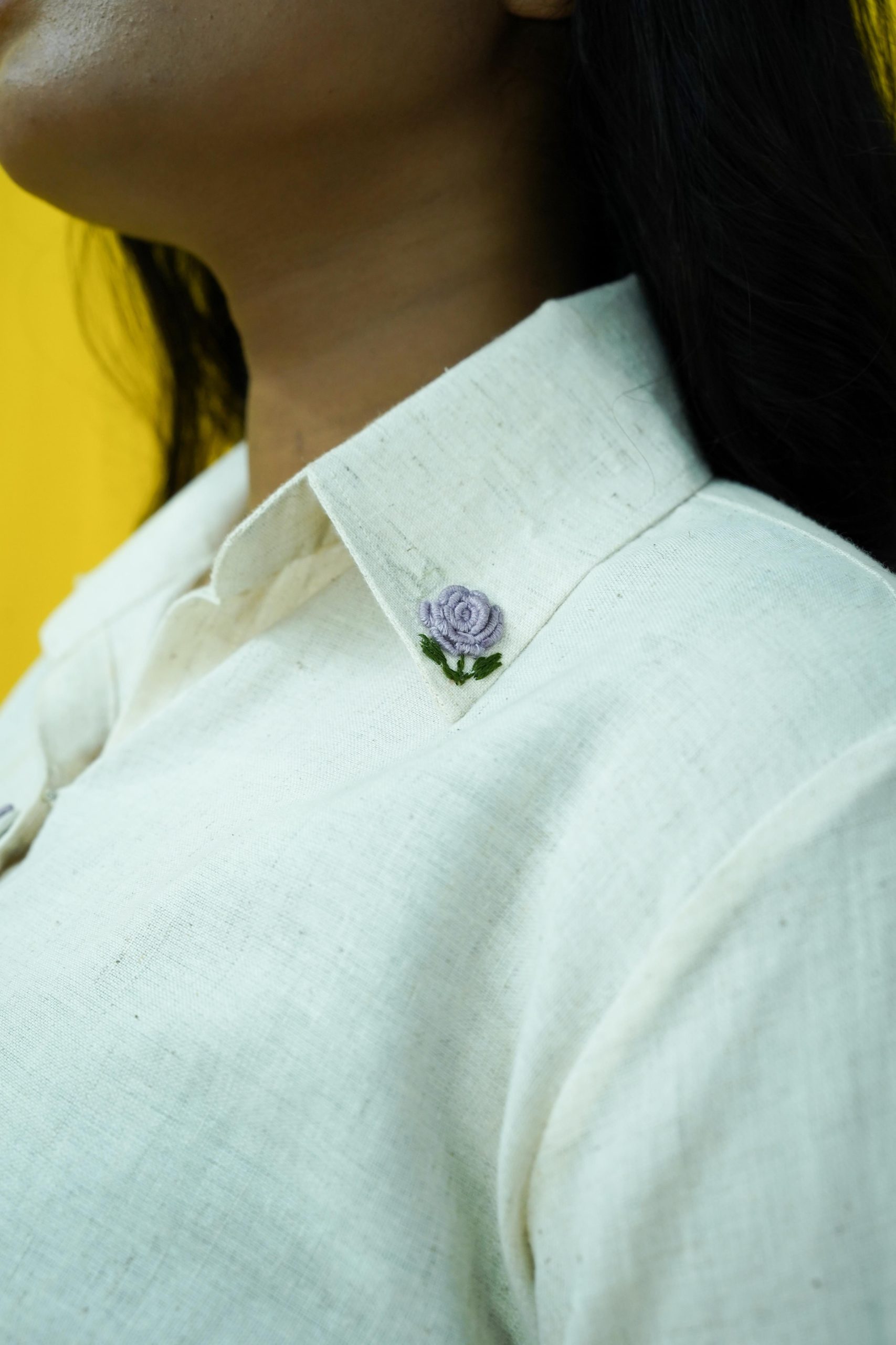 Crafted from pure cotton, this printed hand-embroidered shirt is the perfect companion for a travel day. Featuring cute floral hand-embroidered detailing on the collar and buttons, it adds a touch of artisanal flair to your wardrobe. A fresh take on the classic white shirt—quirky yet elegant. Style it with high-waisted jeans and sneakers for a relaxed yet effortlessly chic look.